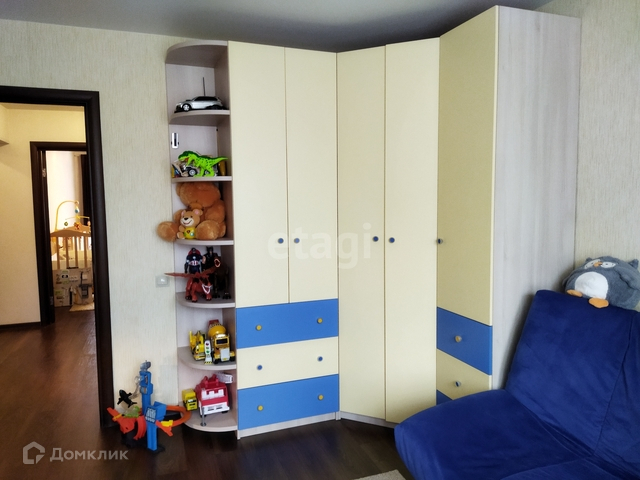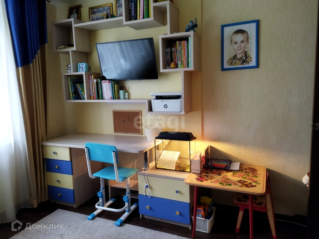 Детская комната обустроена очень уютно и грамотно. Много места для хранения вещей, установлен компьютерный стол.