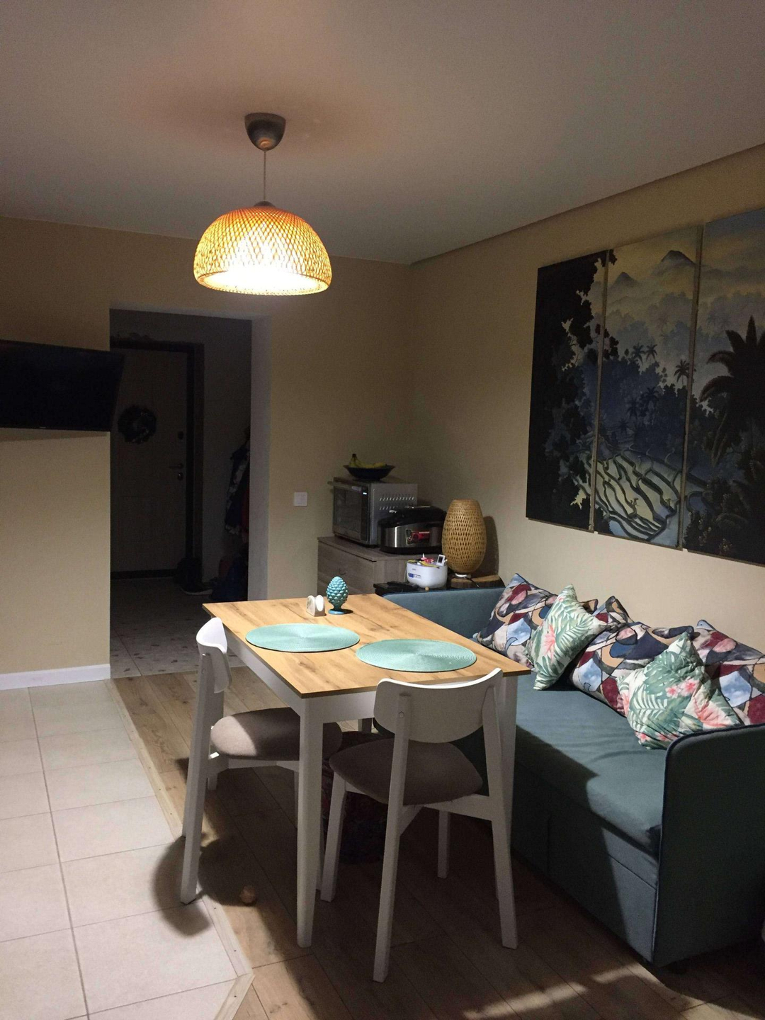 Ремонт есть, выравнены и окрашены стены, качественный ламинат и плитка. Натяжные потолки, установлен кондиционер, несколько сценариев освещения. Ванная комната только на 50% отремонтированна (стены выравнены по маякам и стяжка пола +есть сантехника) нужно доделывать!