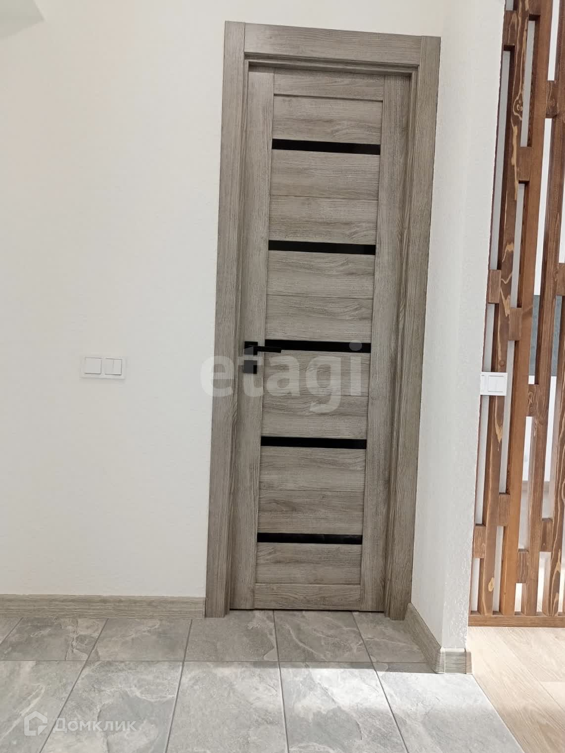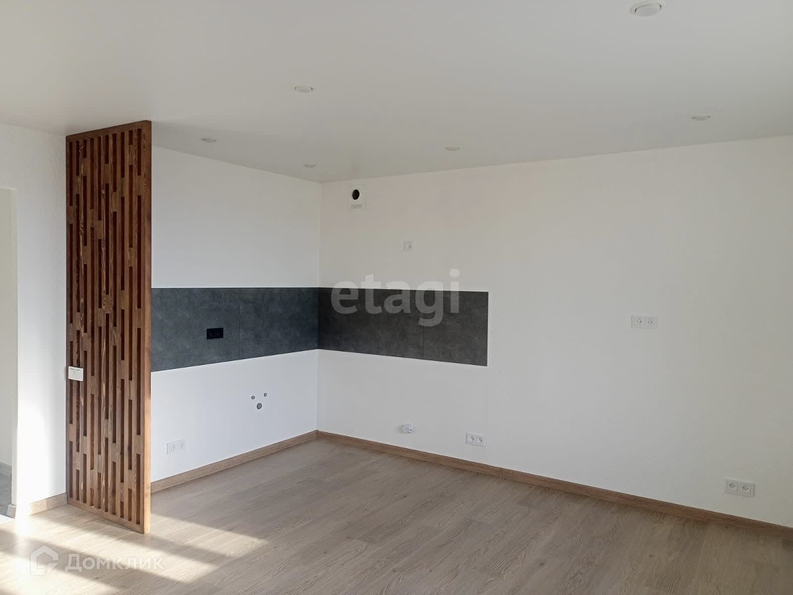 Кухонная зона и гостиная изящно разделены деревянной перегородкой, придавая квартире изысканность и уникальность.