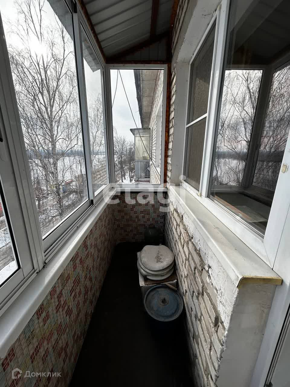 Балкон остеклён, окна выходят на живописную реку, создавая атмосферу уюта