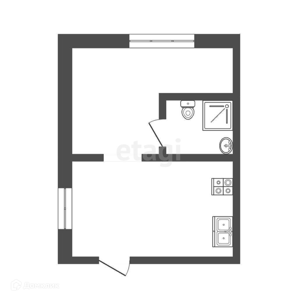 Общая площадь 20.8 кв.м.: кухня 9.5 кв.м., комната 10.5 кв.м., санузел 2.5 кв.м., прихожая 3.6 кв.м.