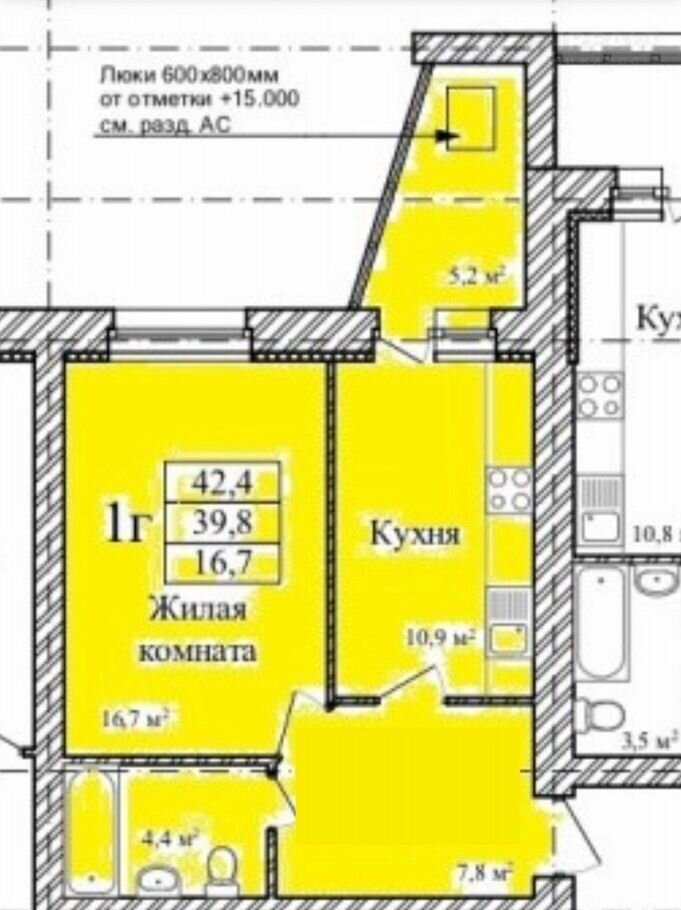 Общая площадь 42.4 м2