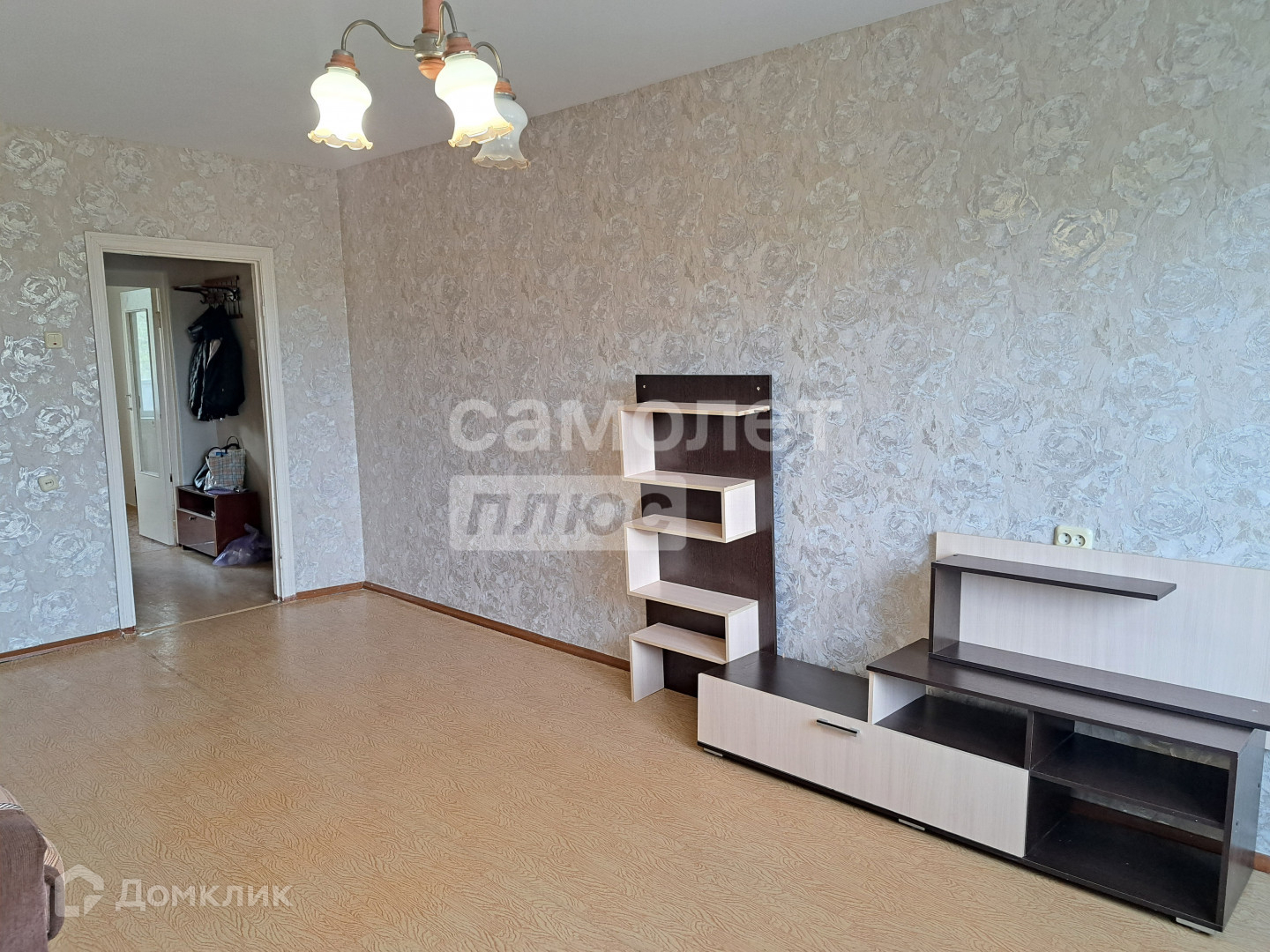 В квартире есть кухонный гарнитур, диван и небольшая стенка под ТВ.