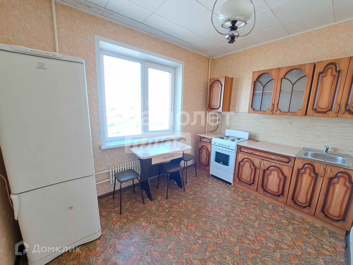 Квартира с кухонным гарнитуром. Из мебели: диван и кресло в комнате, стол и два стула на кухне, из техники: холодильник.