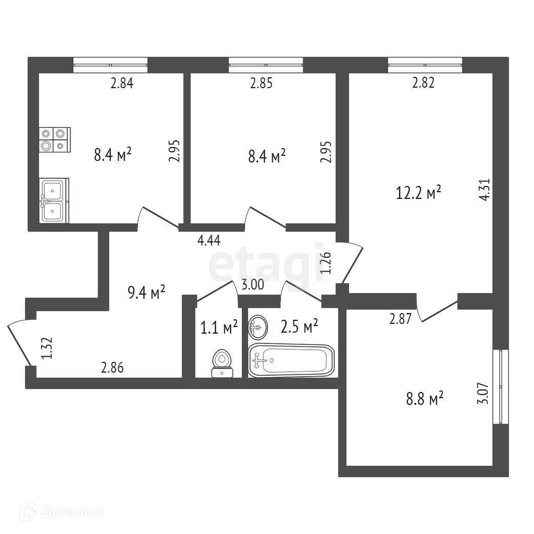 Спальни - 8,4 кв.м., 12,2 кв.м., 8,8 кв.м.;