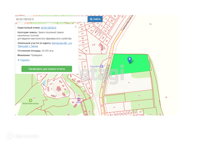 В продаже земельный участок площадью 4 Га (404,55 соток, кадастровый номер 40:20:100102:8) в г.Таруса Калужской области. Категория земель - земли поселений. Вид разрешённого использования: для ведения фермерского хозяйства (помощь с переводом в ИЖС!). Рядом проходят все городские центральные коммуникации - эл.энергия, газ, вода, канализация. Назначение земель - для ведения крестьянского (фермерского) хозяйства. Участок находится в черте г. Таруса! Курортная зона, исторические места. До речек Таруска и Ока около 200-300 метров. До центра города