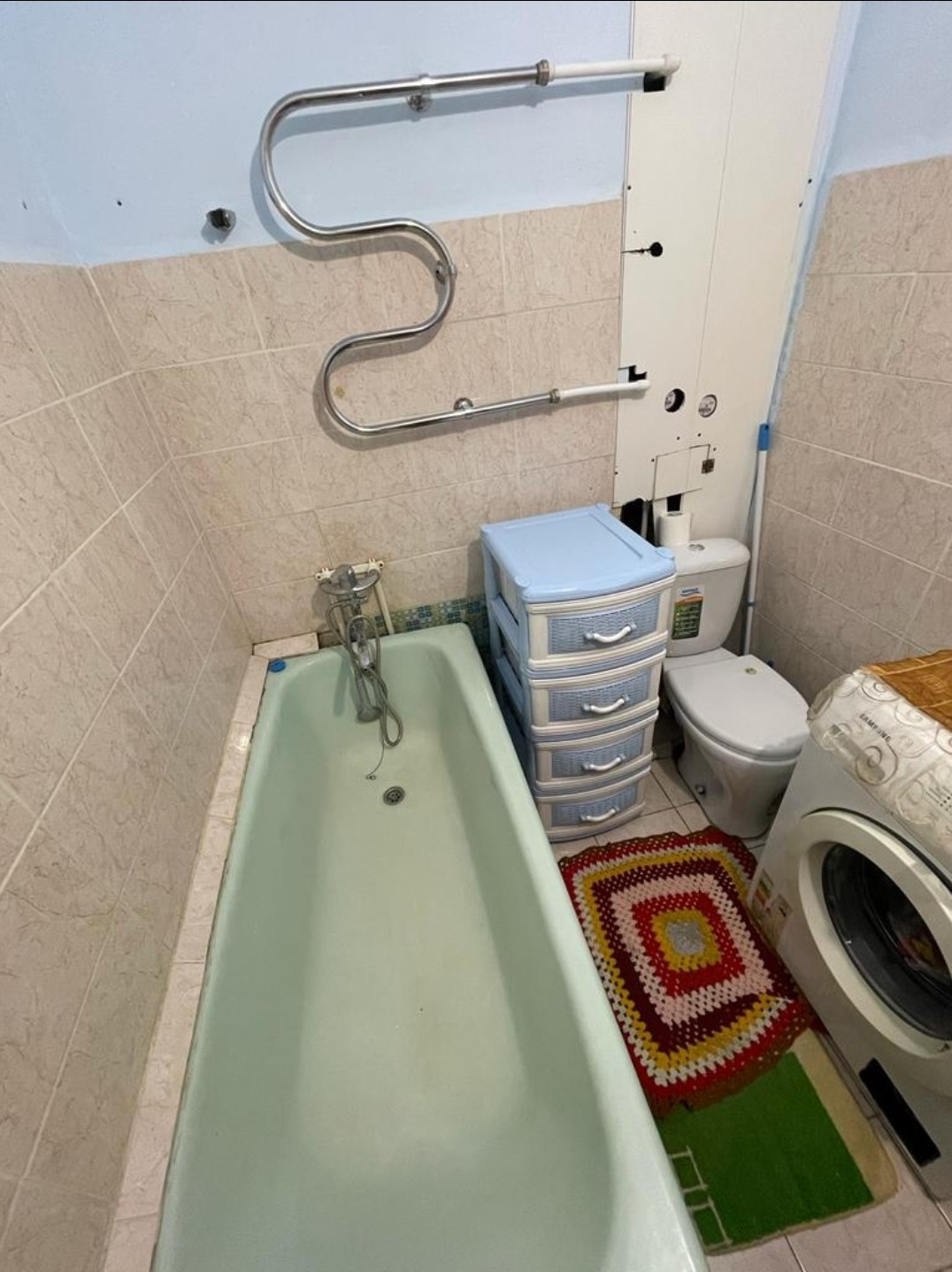 Для облицовки ванной комнаты использована керамическая плитка, а на новом большом полотенцесушителе полотенце всегда будет сухим. Для приборов учета воды предусмотрен смотровой лючок.