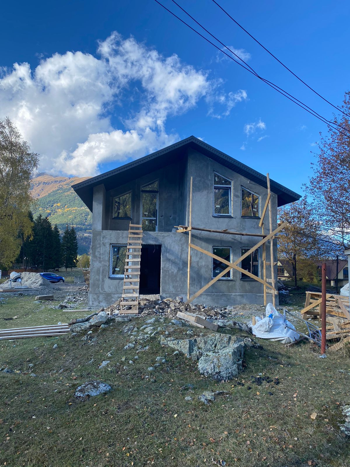 - Дом построен из усиленного пеплоблока и облицован  снежно-белым короедом.