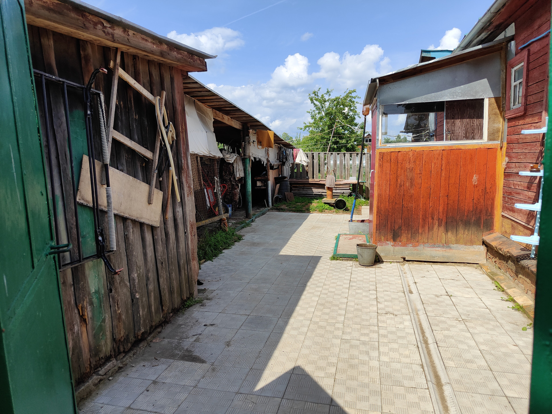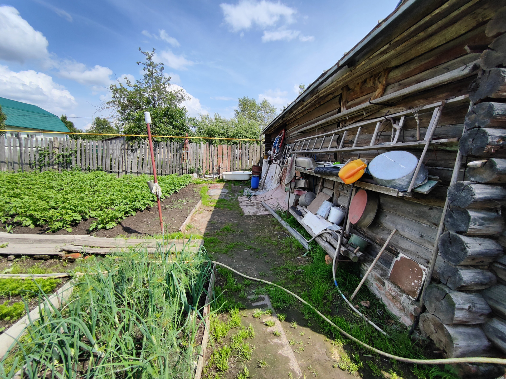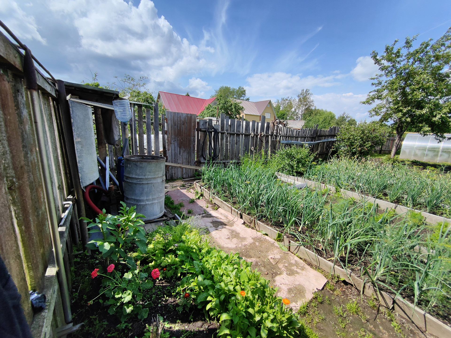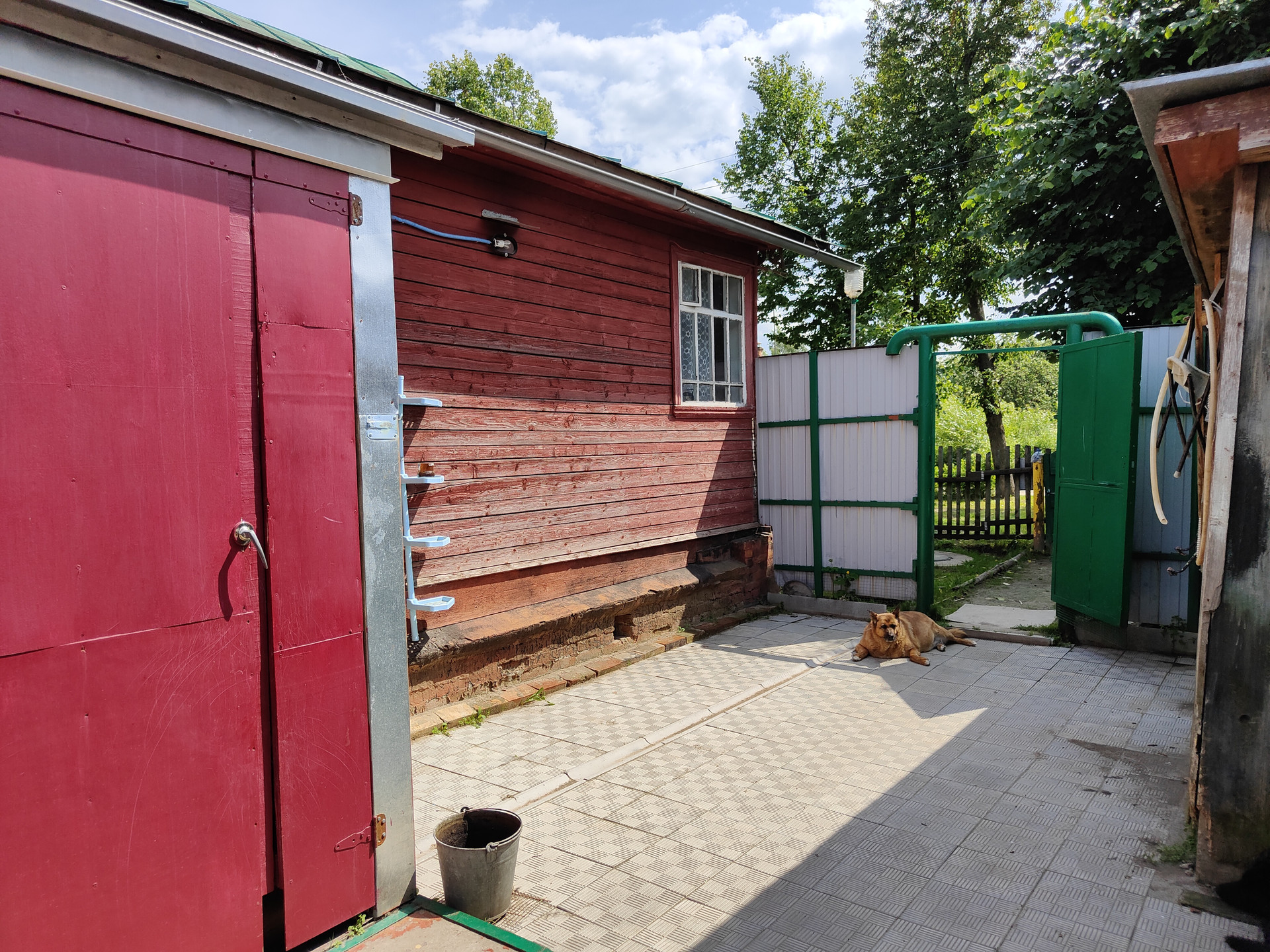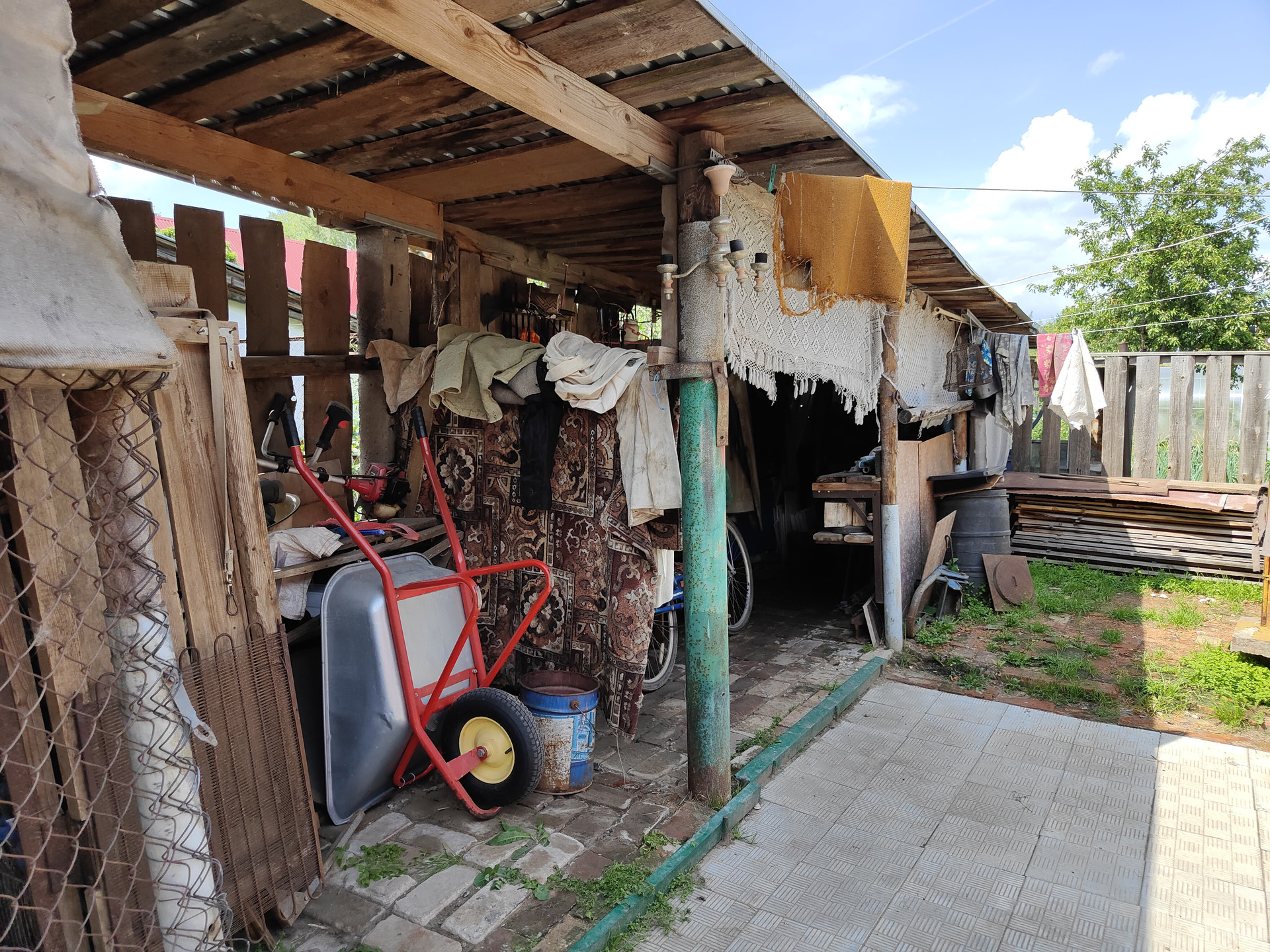 На территории придомового участка выложена тротуарная плитка, имеется навес и вольер для собаки, хозяйственный сарай и скважина. Сам земельный участок ухоженный, установлена теплица 6x3м.