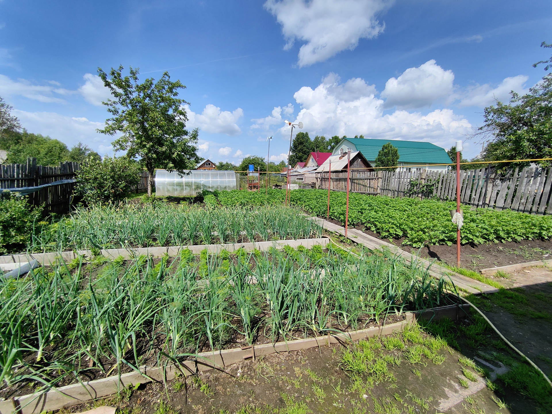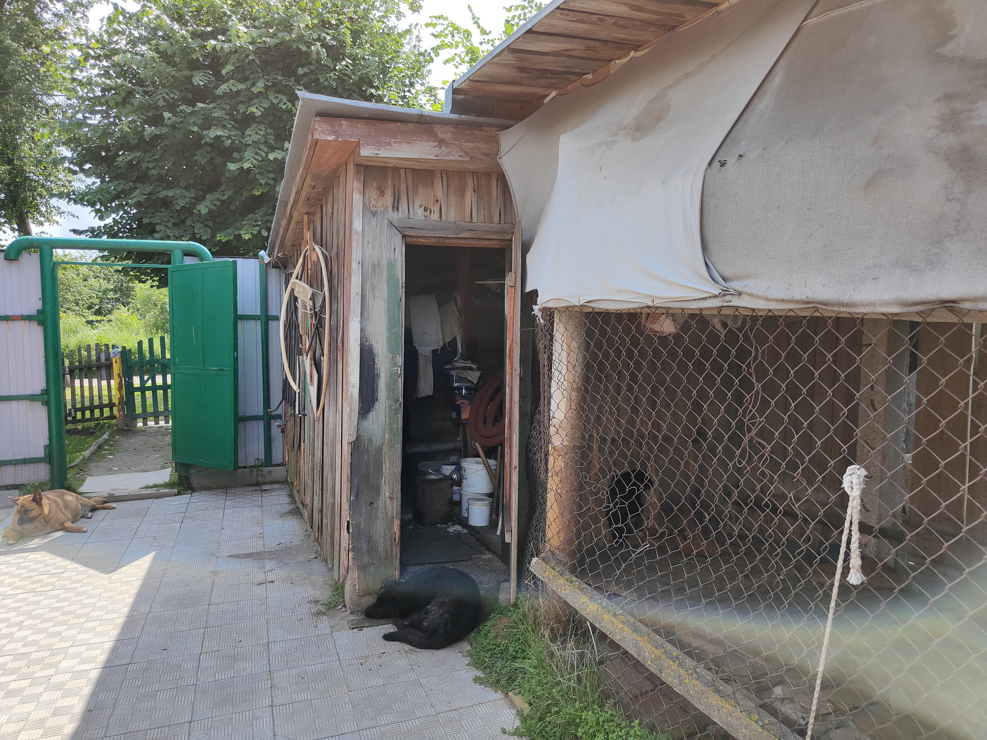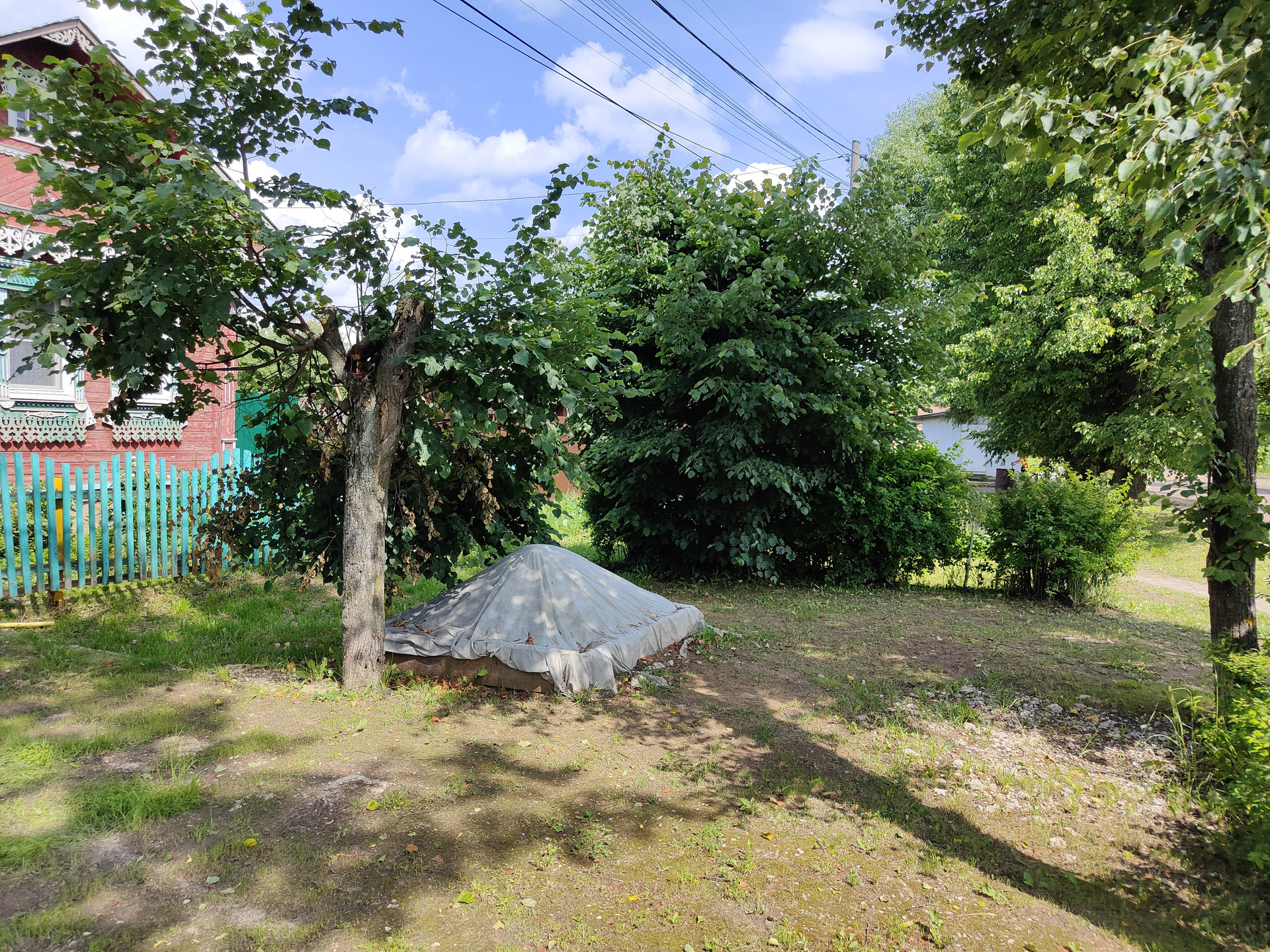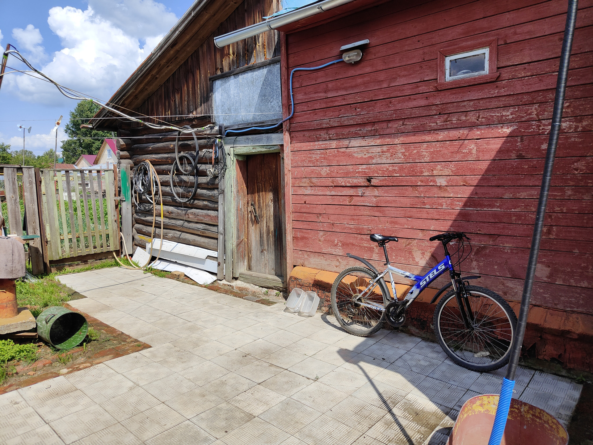На территории придомового участка выложена тротуарная плитка, имеется навес и вольер для собаки, хозяйственный сарай и скважина. Сам земельный участок ухоженный, установлена теплица 6x3м.