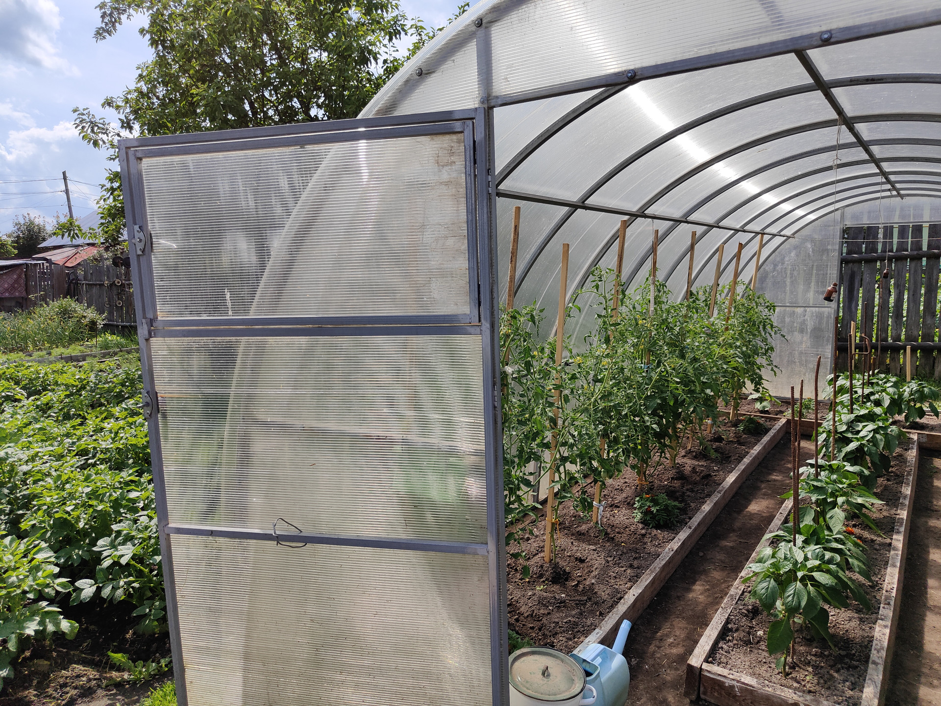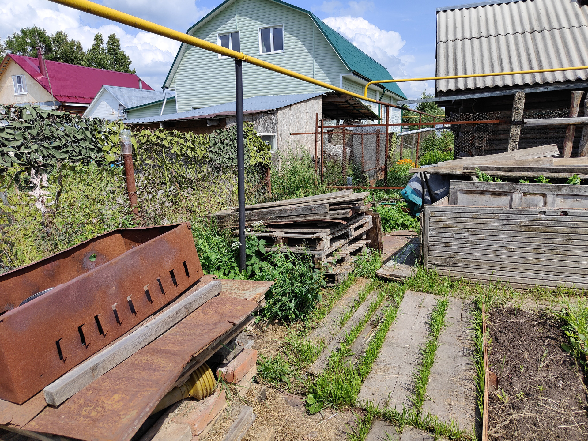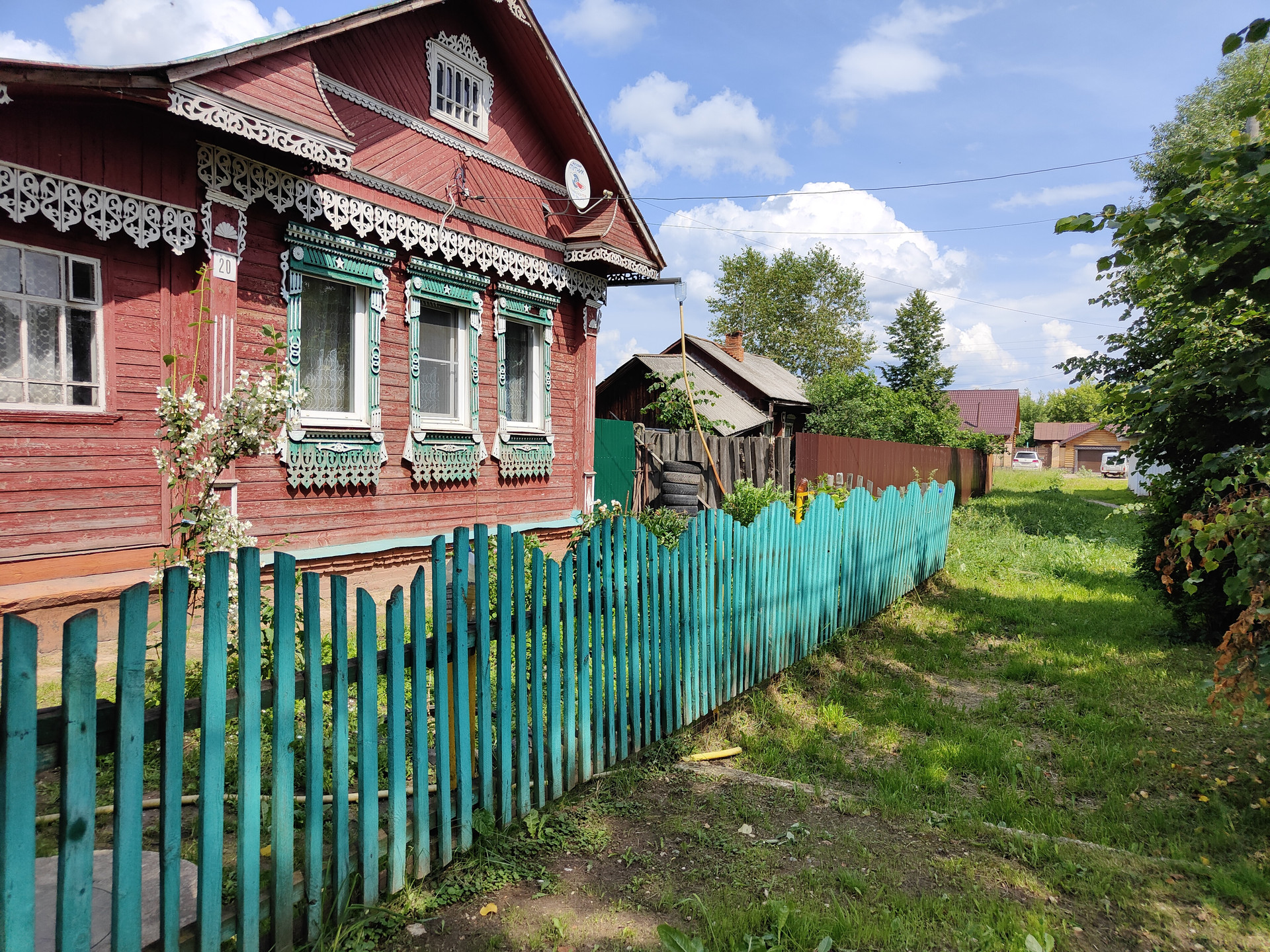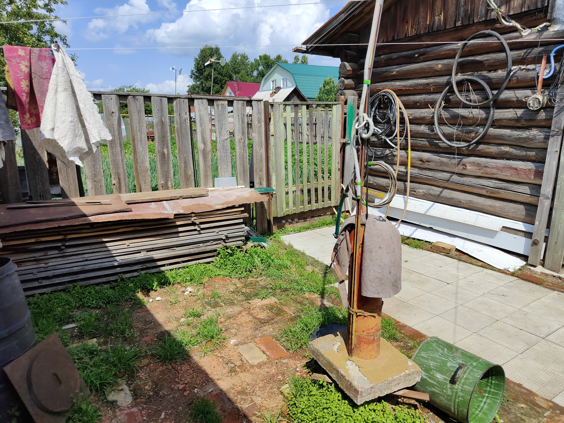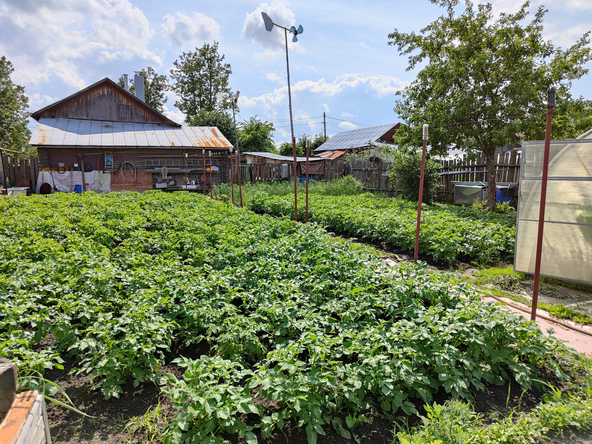 На территории придомового участка выложена тротуарная плитка, имеется навес и вольер для собаки, хозяйственный сарай и скважина. Сам земельный участок ухоженный, установлена теплица 6x3м.