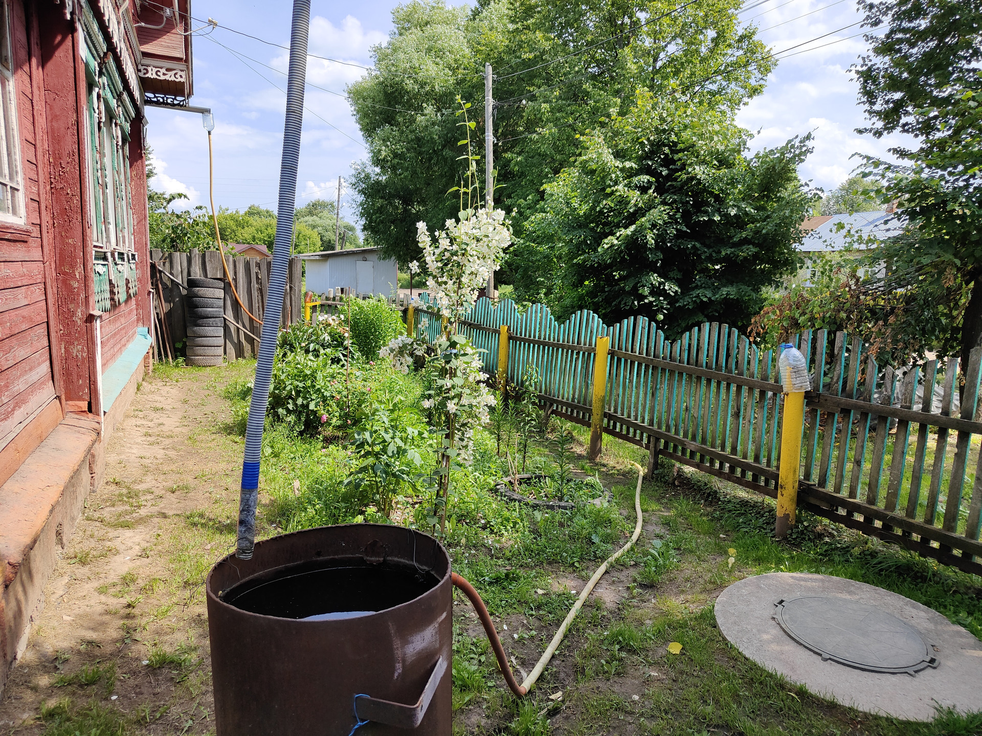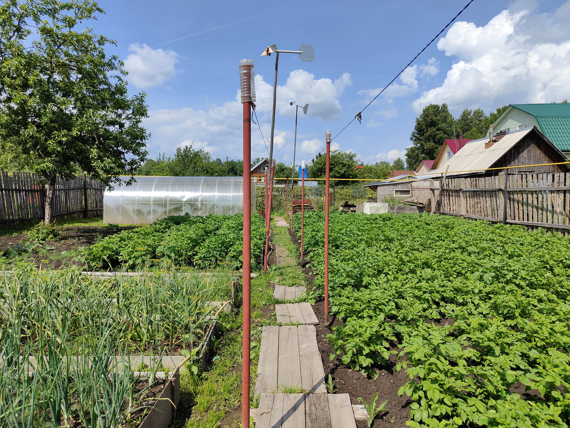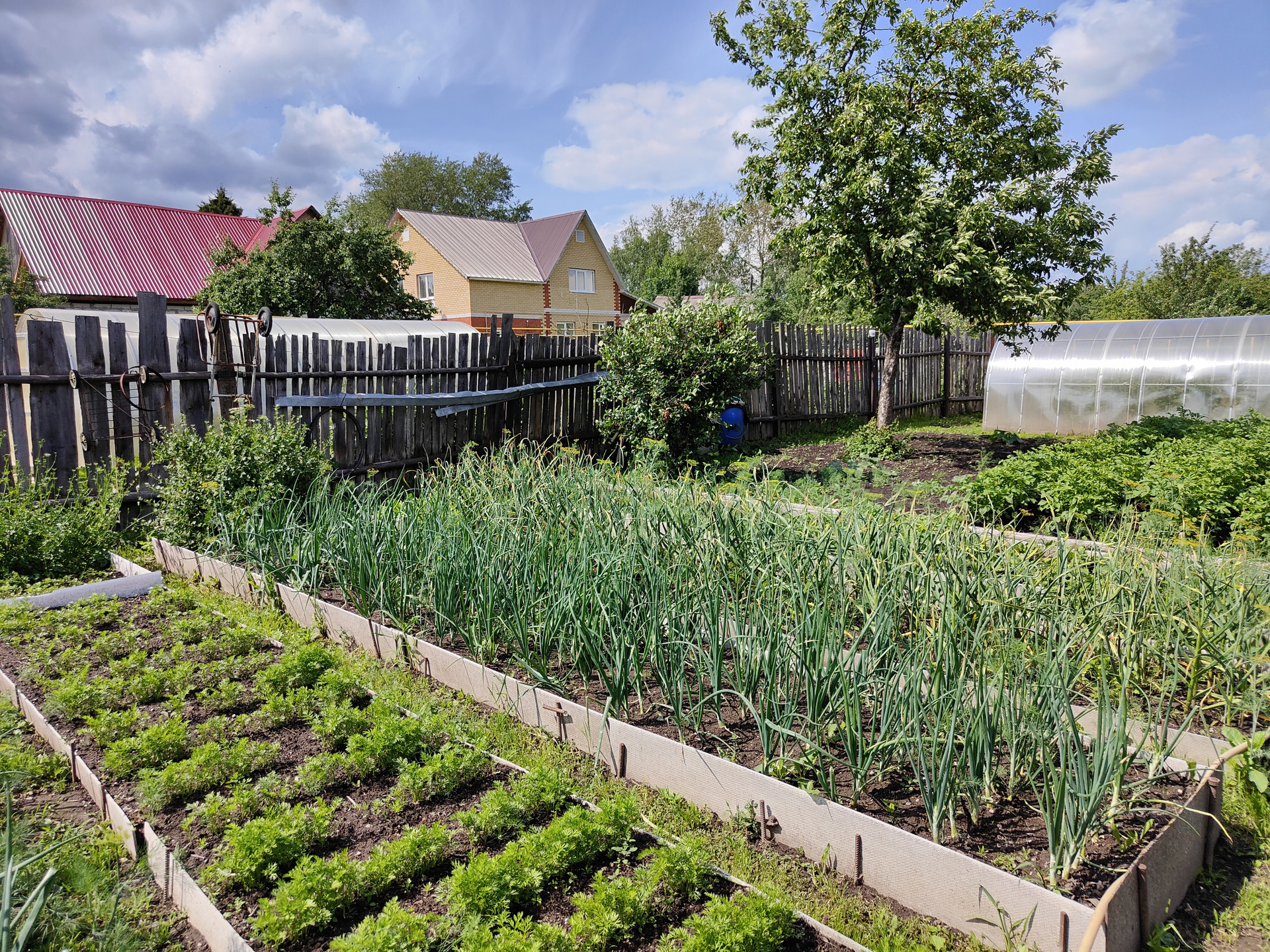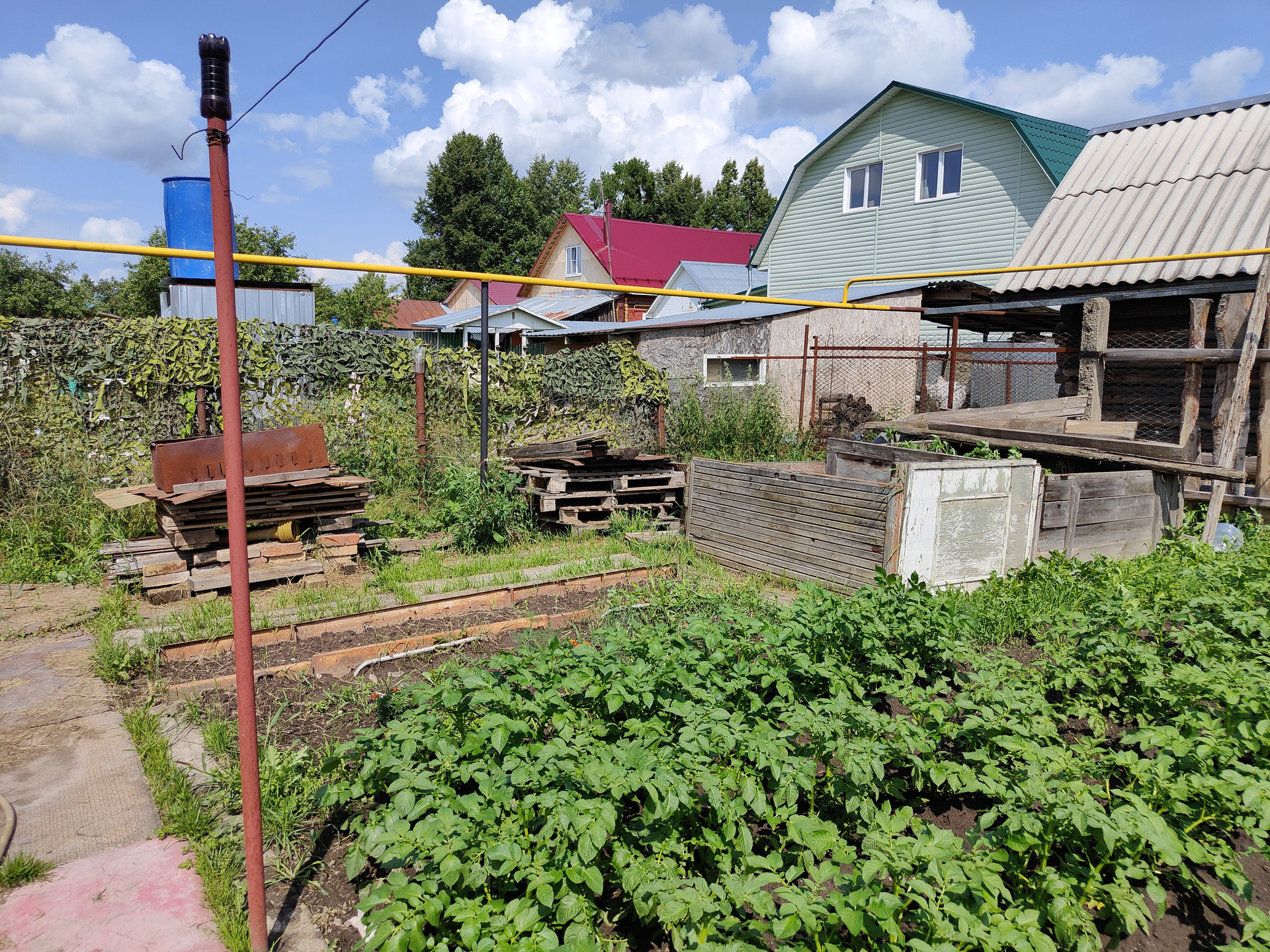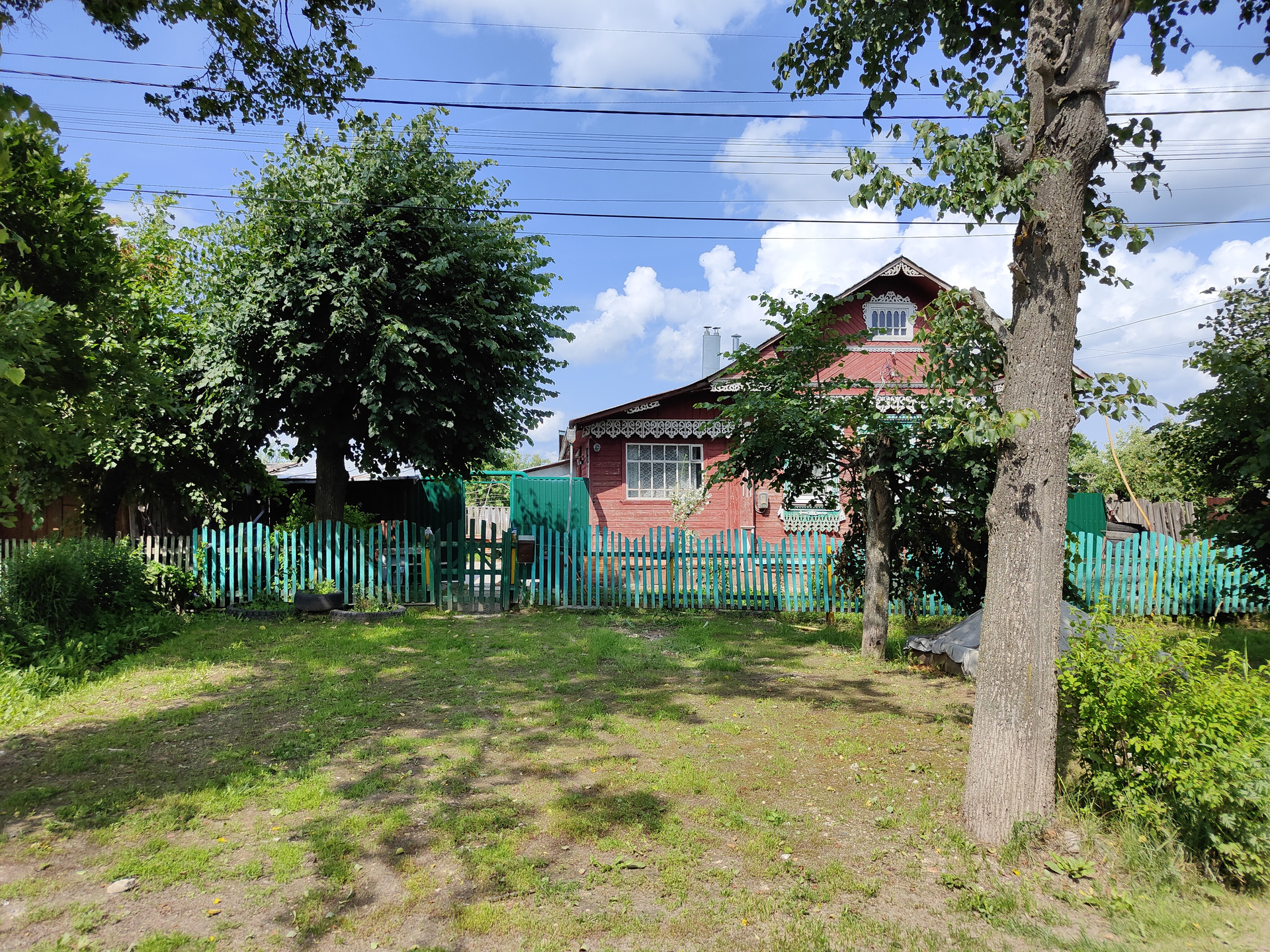 На территории придомового участка выложена тротуарная плитка, имеется навес и вольер для собаки, хозяйственный сарай и скважина. Сам земельный участок ухоженный, установлена теплица 6x3м.