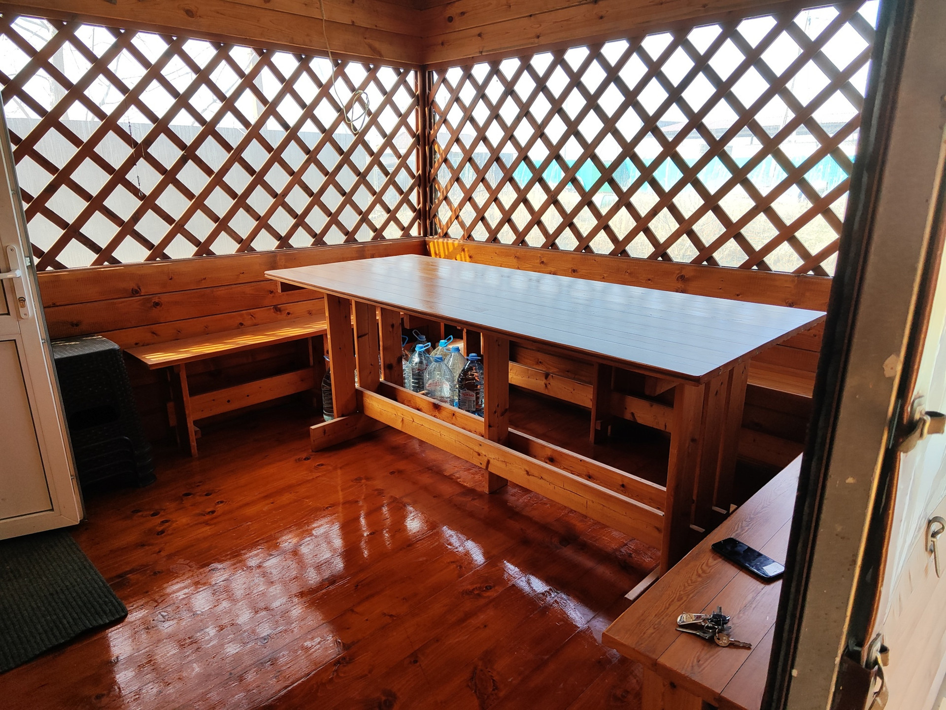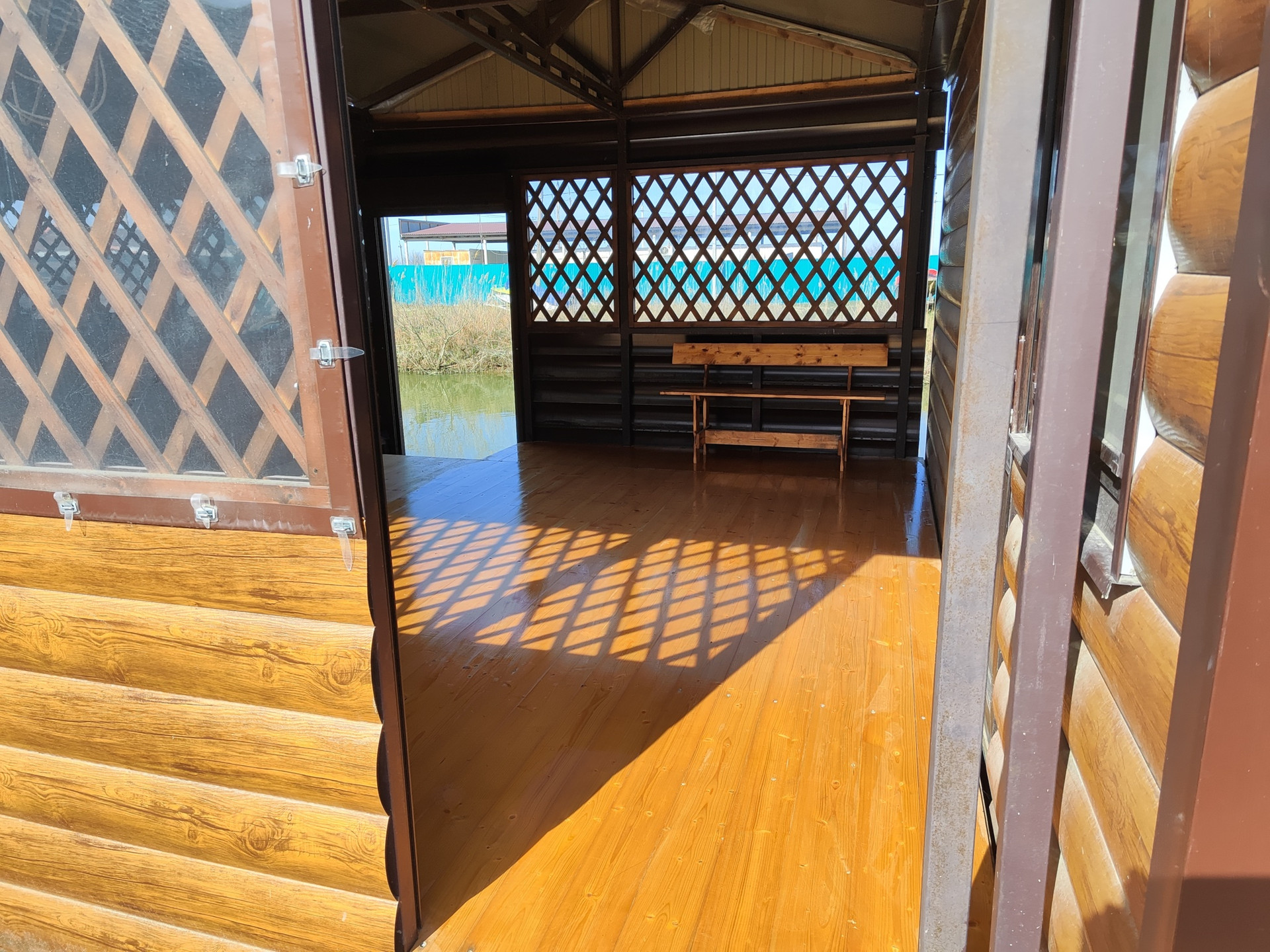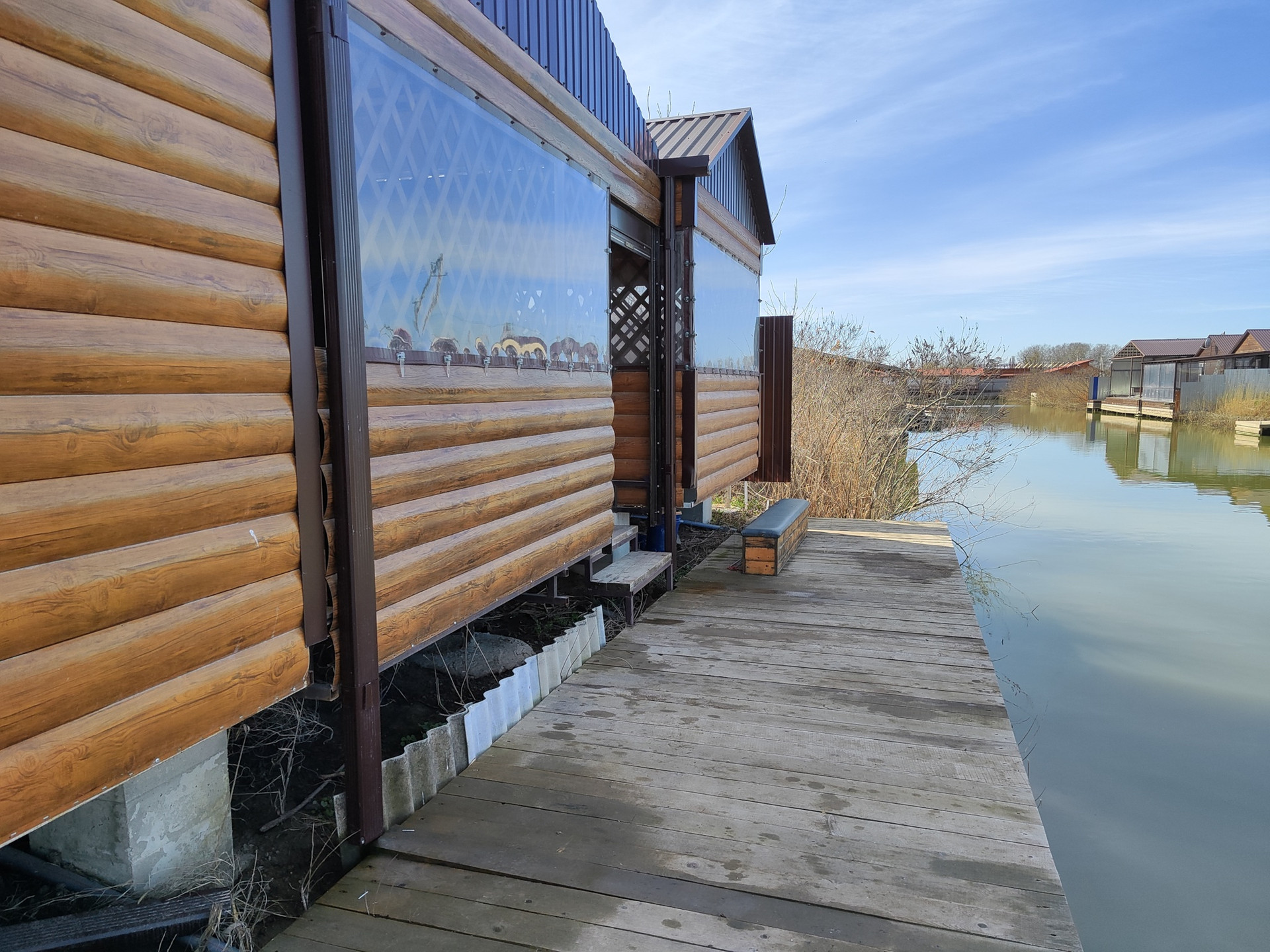 Каркасный дом на берегу речки. Одна спальня, одна кухня, веранда, беседка и баня. Слип для лодки и причал с выходом на воду. Электричество 15 кВт, септик, ведут городской водопровод.
