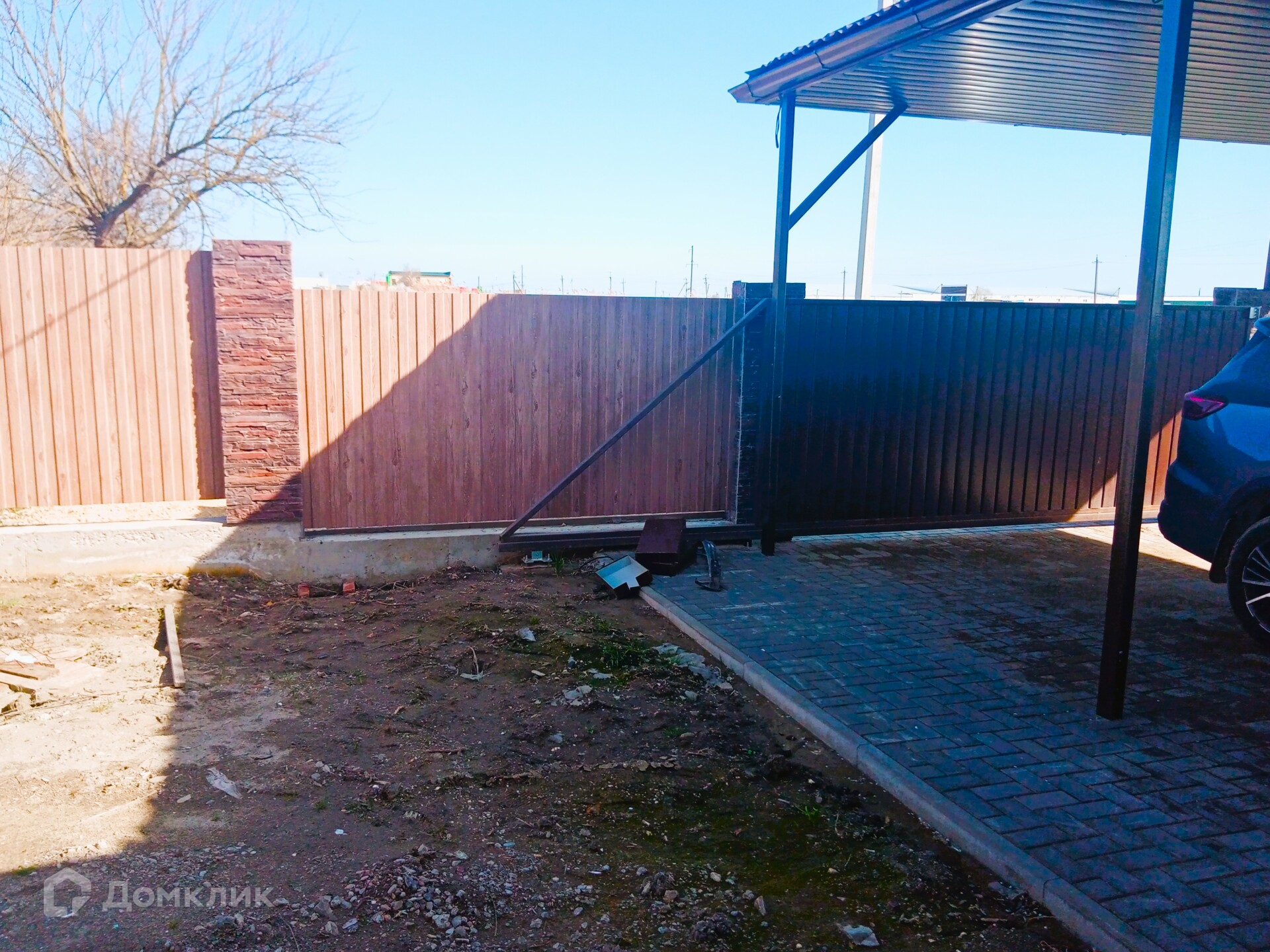 Установлен капитальный забор из текстурированного профиля, сдвижные ворота, к которым возможно подключить электро привод, навес для двух автомобилей. Есть уличное освещение, и весь двор, за исключением клумб и зеленых зон выложен тротуарной плиткой.