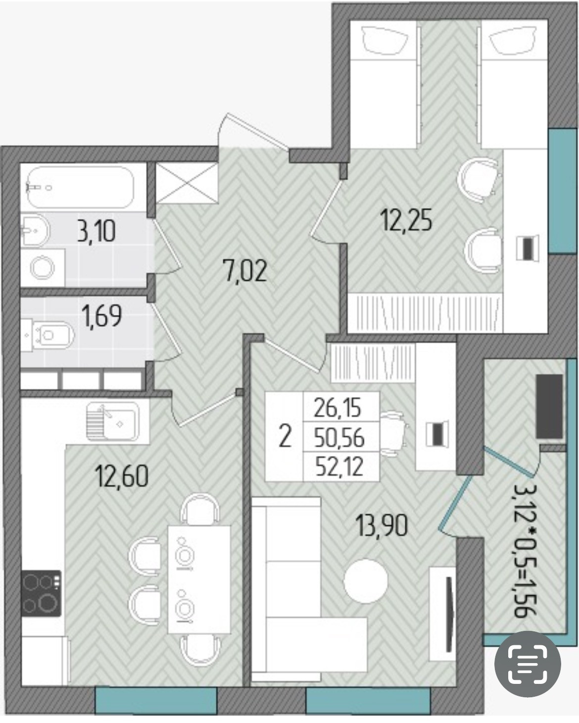 Общая площадь 52.12 м2