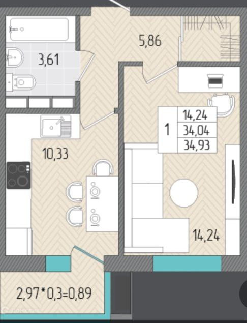 Общая площадь 34.93 м2