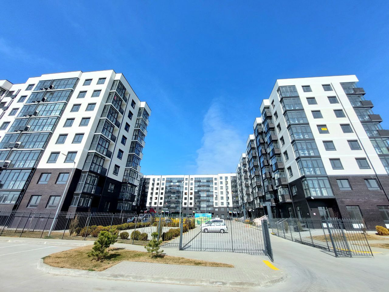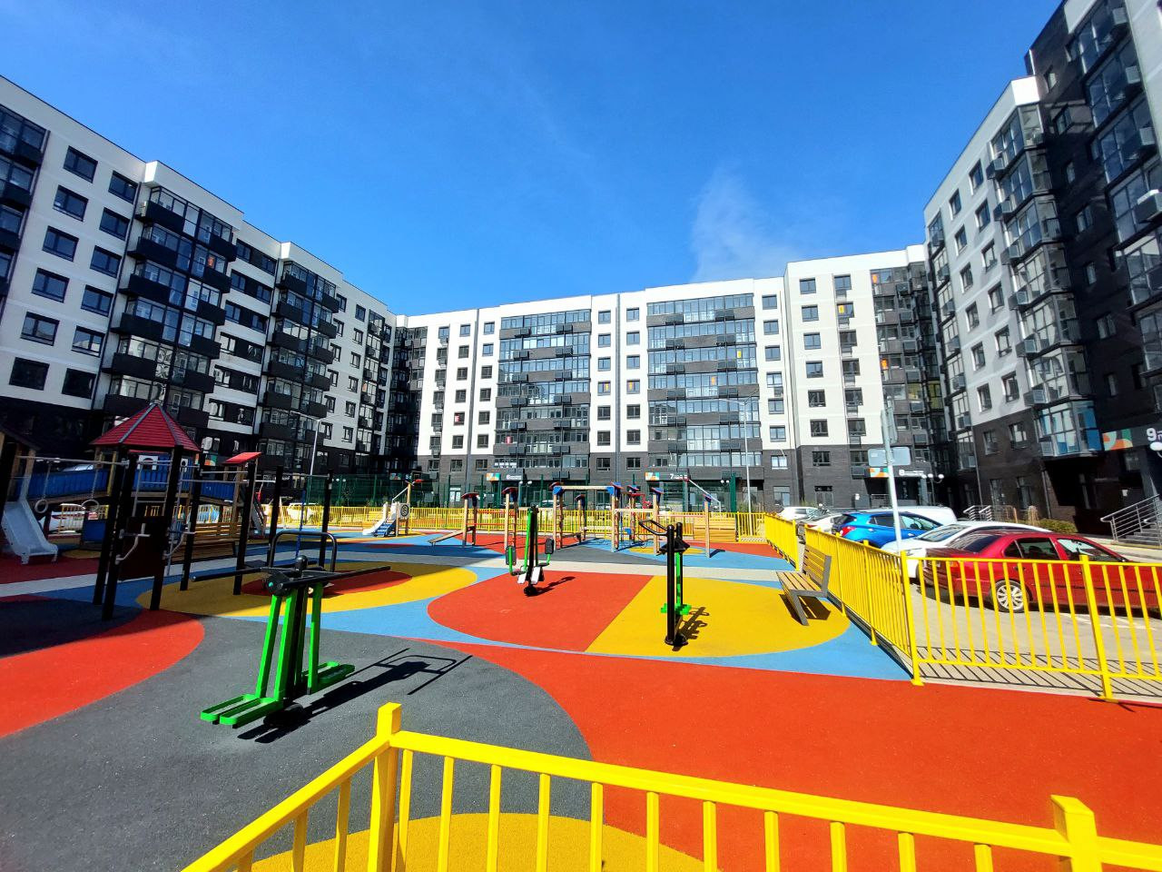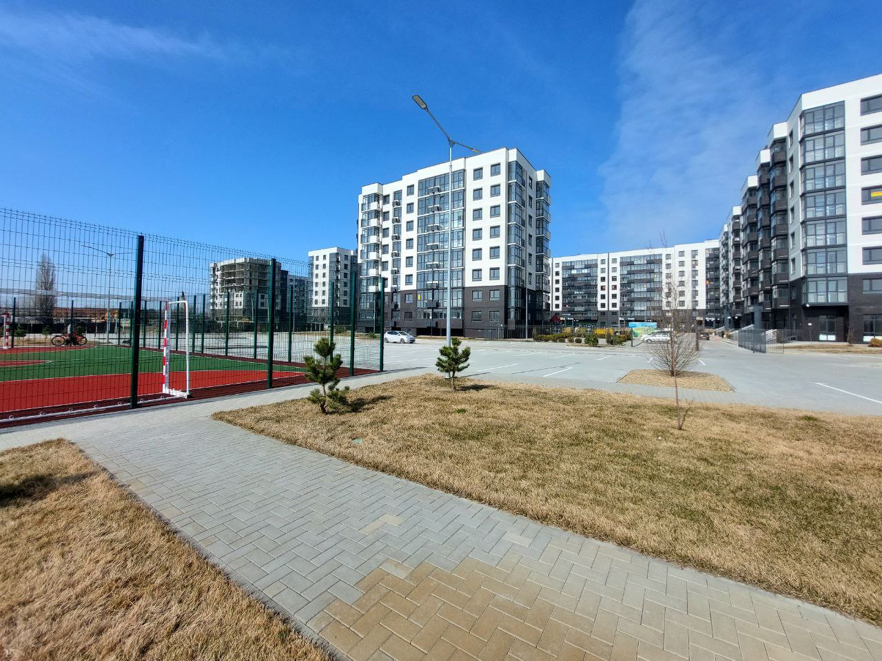 Закрытая территория, парковочные места, детские и игровые площадки, скамейки. Территория двора с озеленением. За территорией двора спортивные площадки и зоны отдыха.