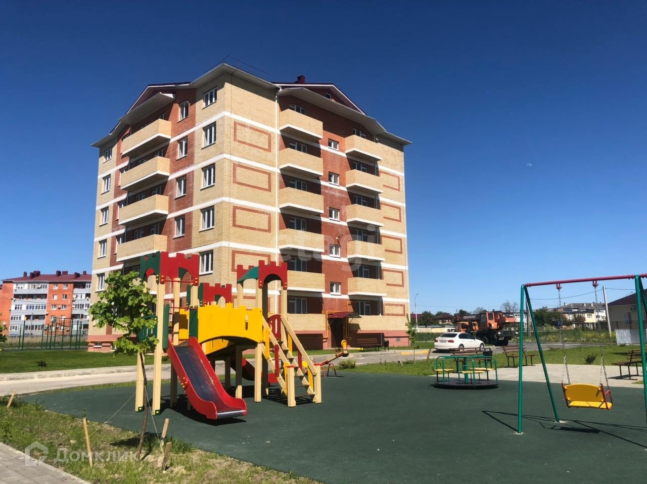Вся придомовая территория благоустроенна: современные детские и спортивные площадки, ухоженные газоны, достаточно парковочных мест.