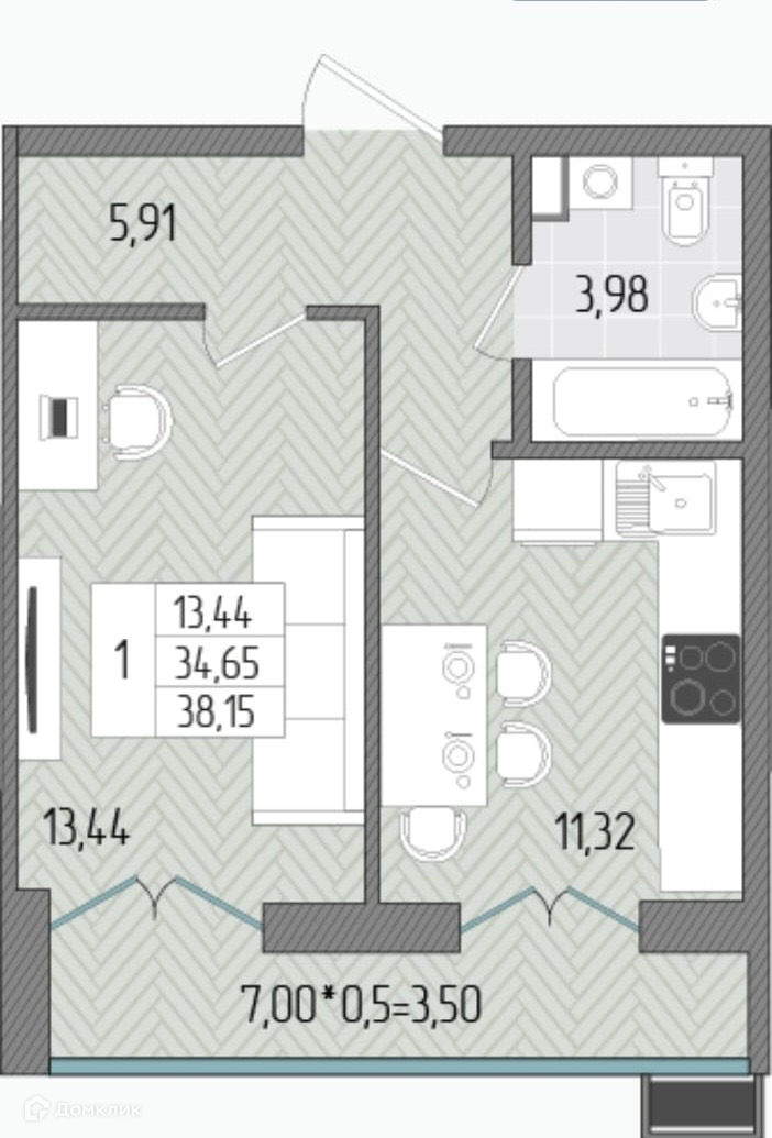 Общая площадь 38 м2