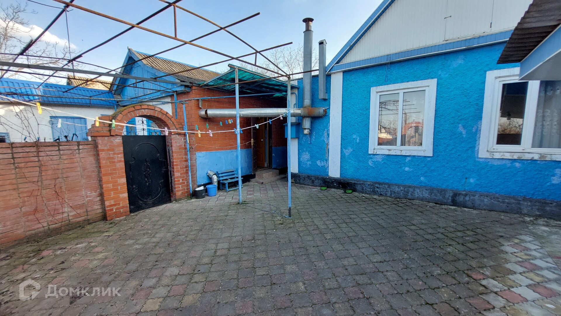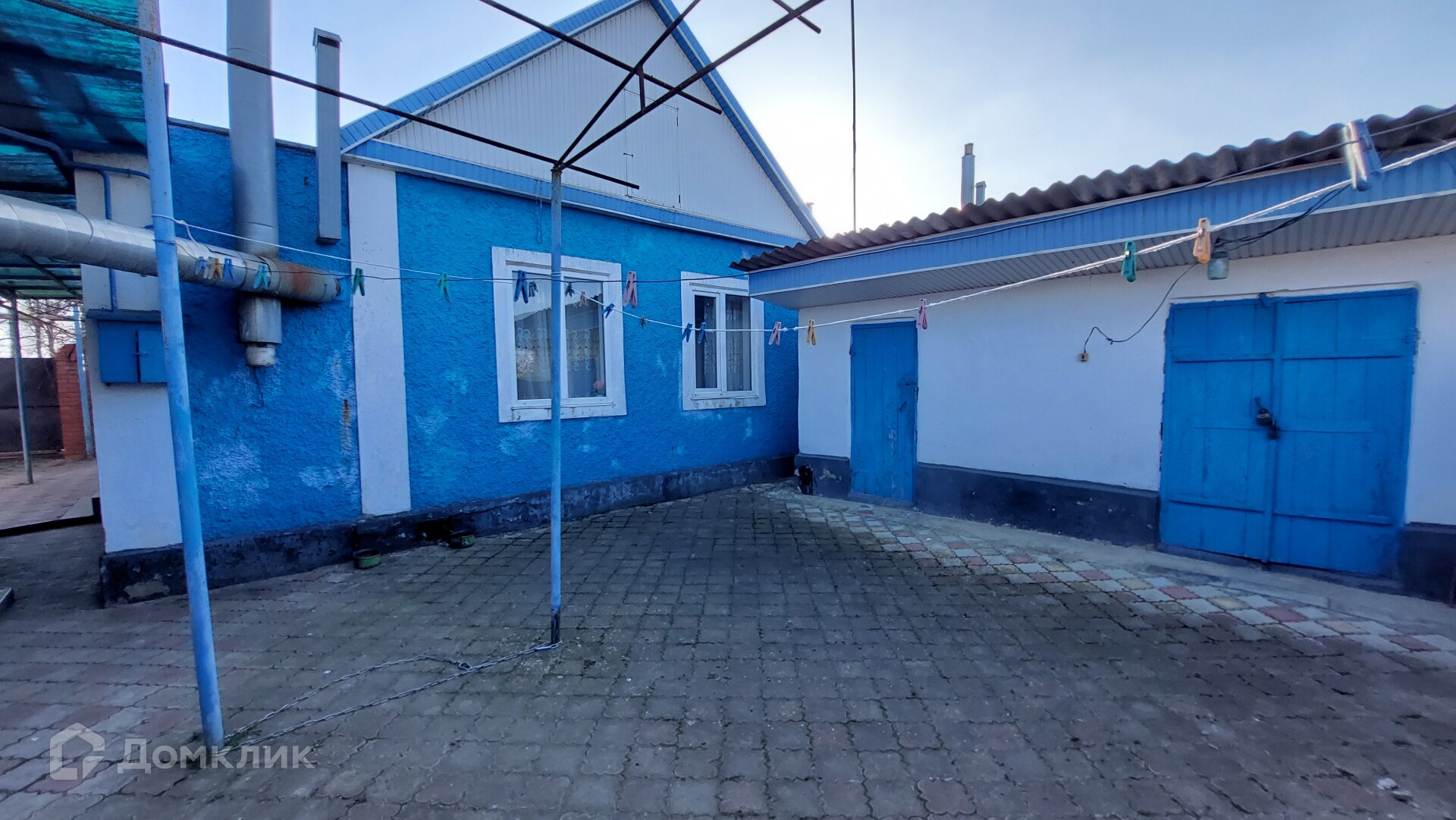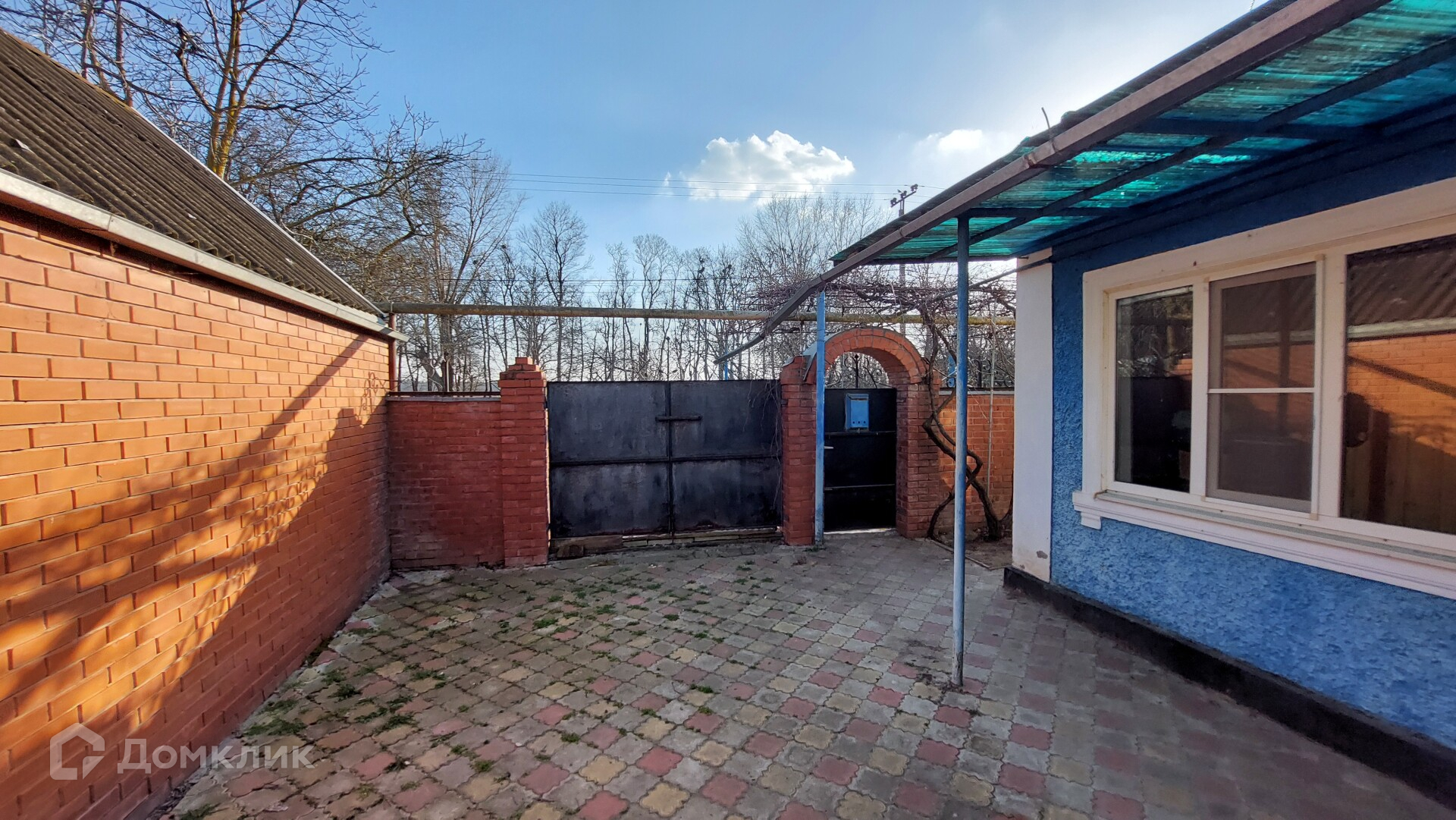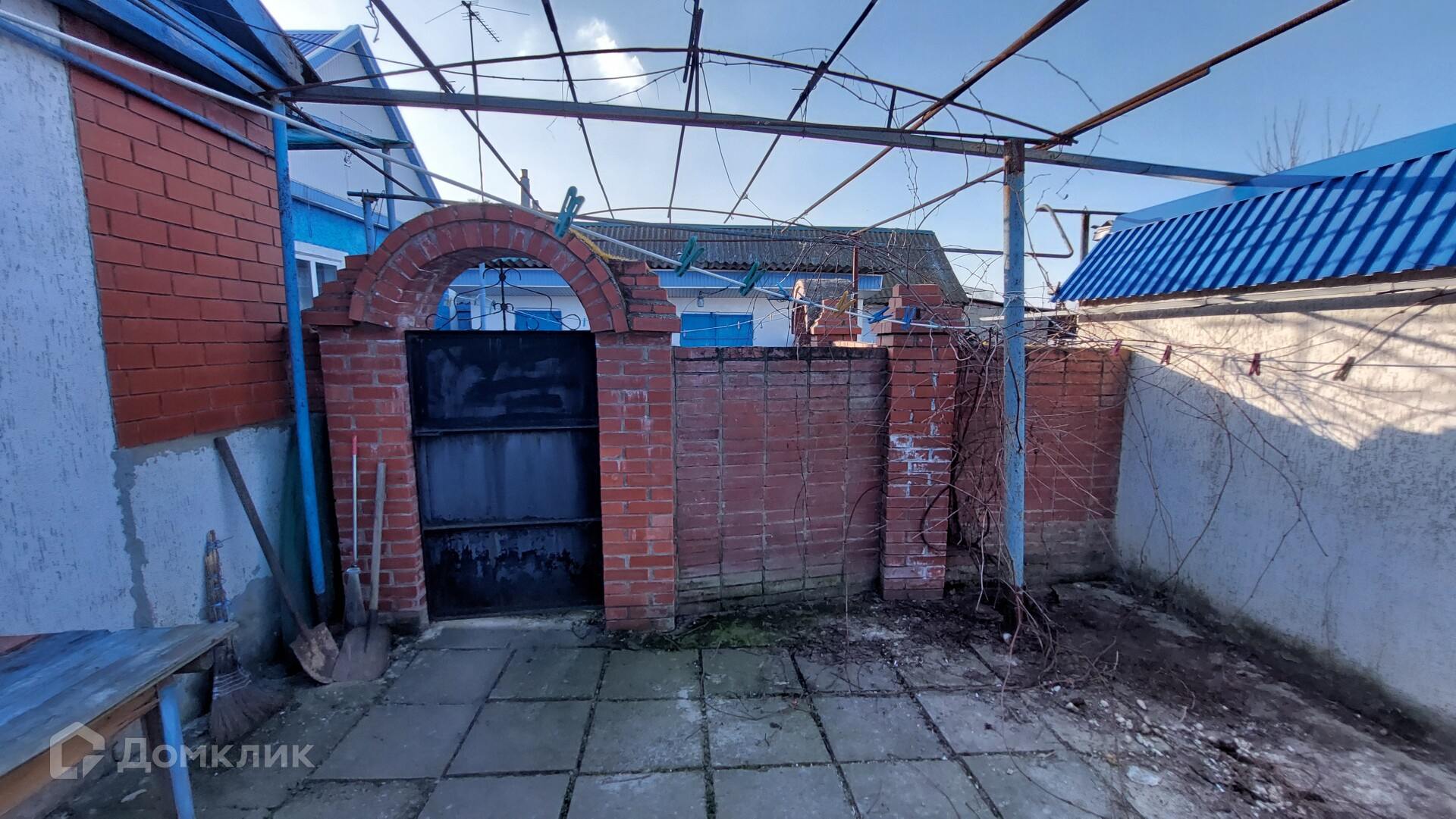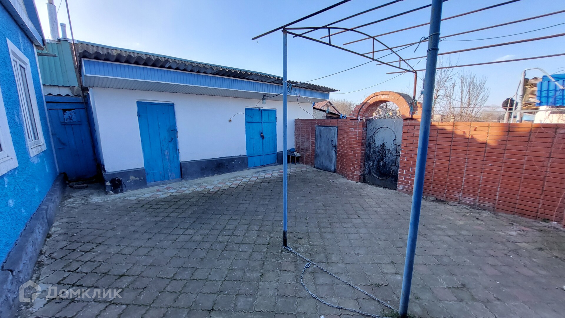 Двор вымощен плиткой. Стоит кирпичный гараж с отдельным въездом и входом со двора. Есть сарай с дубовыми бочками для вина, мастерская, баня (нуждается в реконструкции), бетонный погреб.