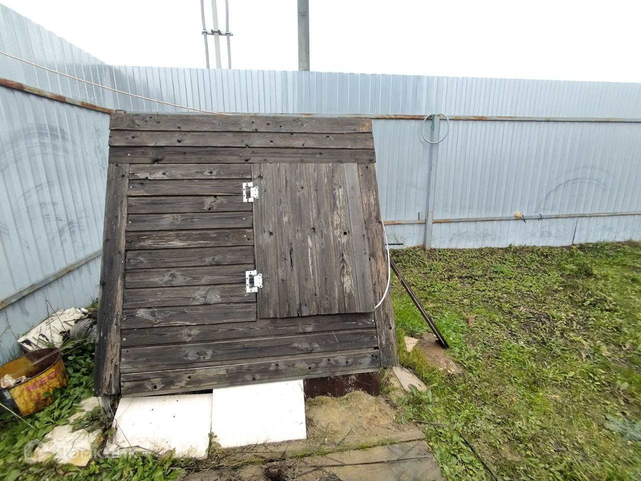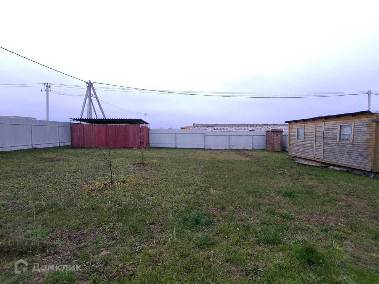 На участке бытовка (планировалась под баню), навес для авто.