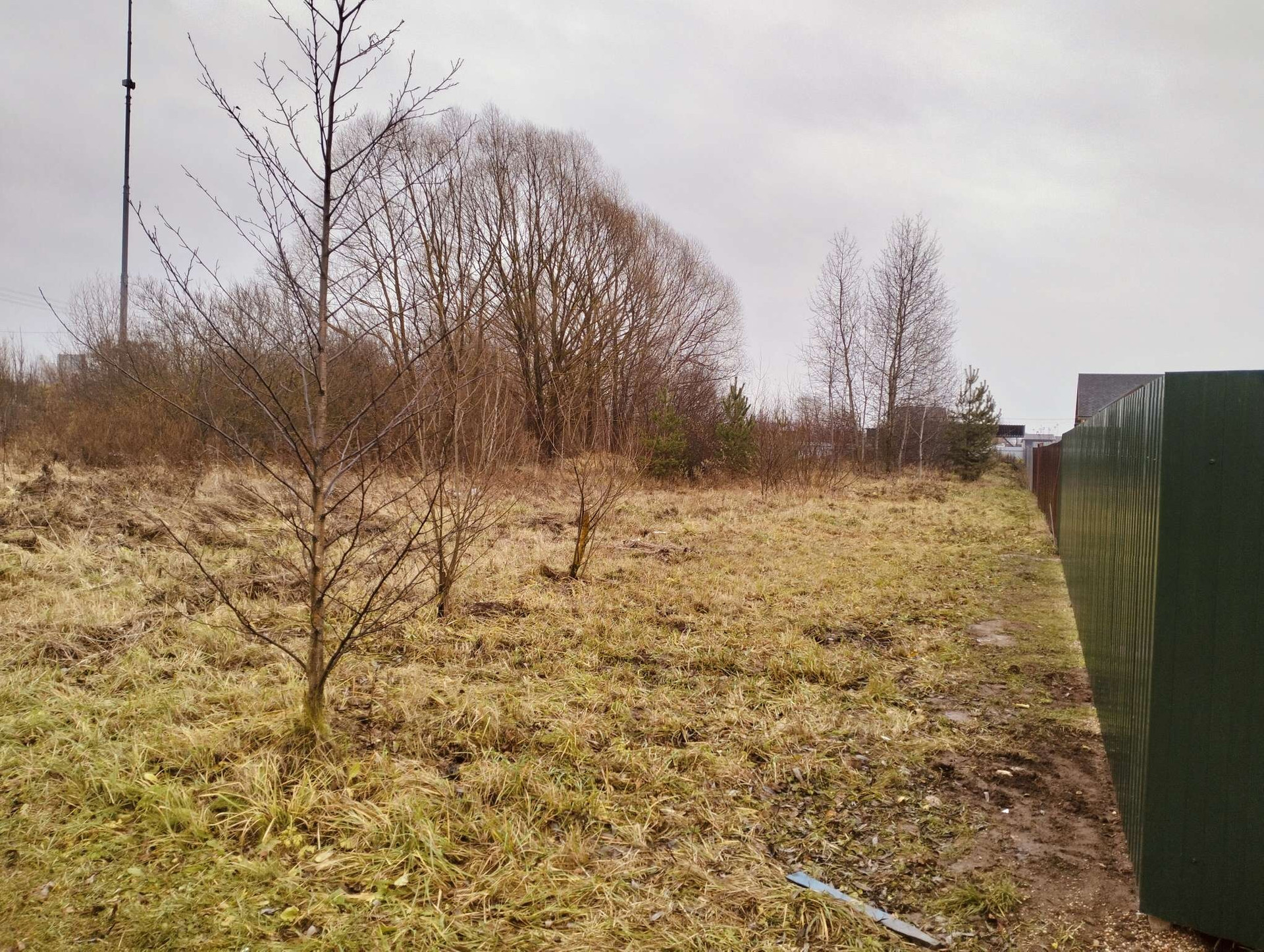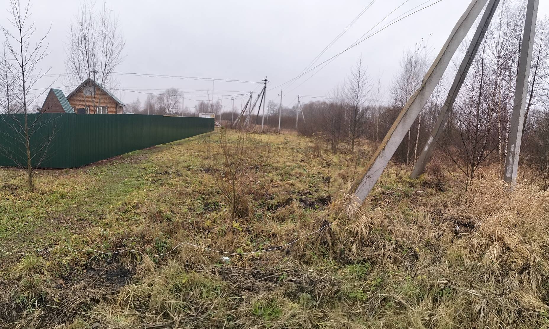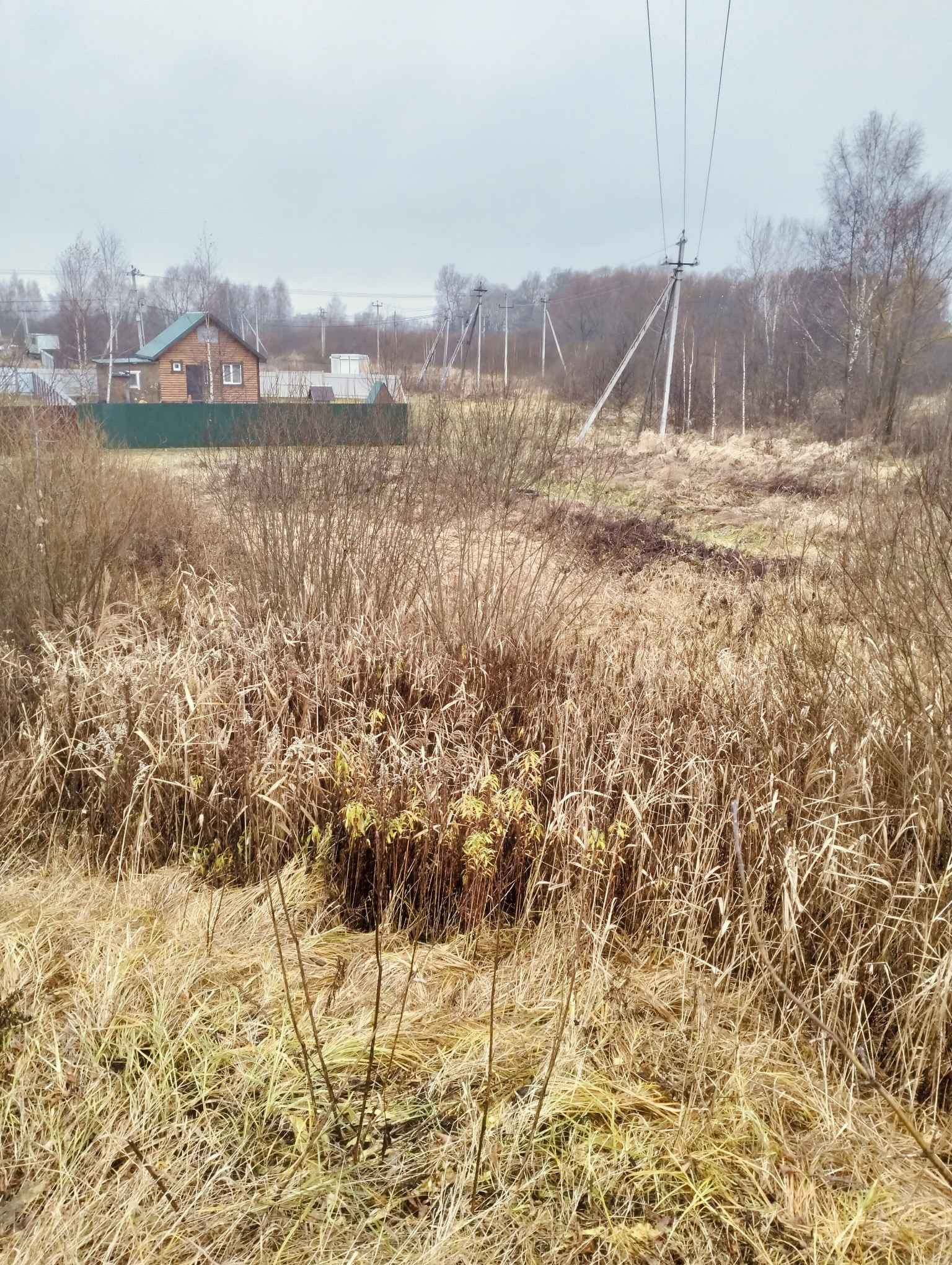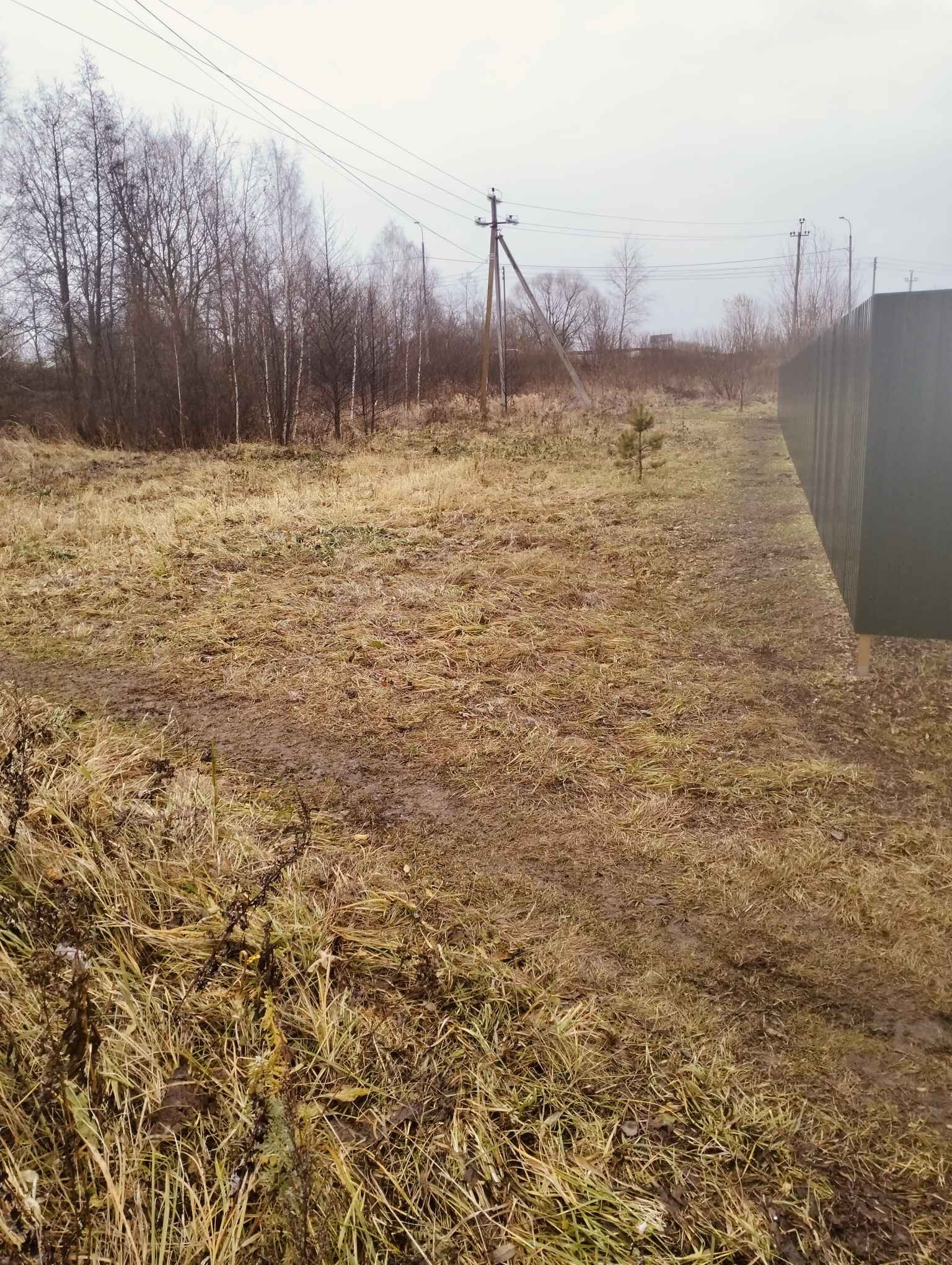 Участок угловой,огорожен с одной стороны. Рядом дренажная канава. Столб электрический.