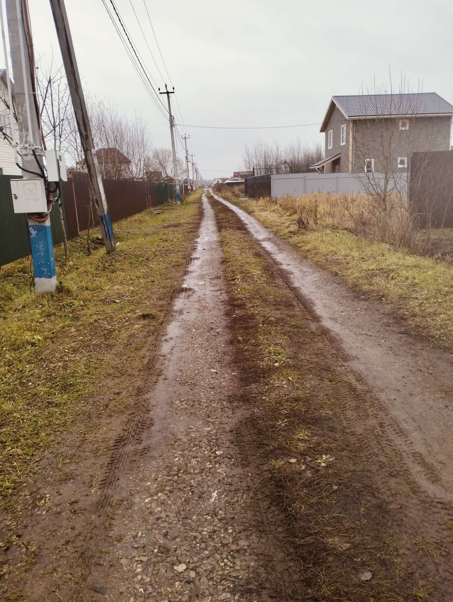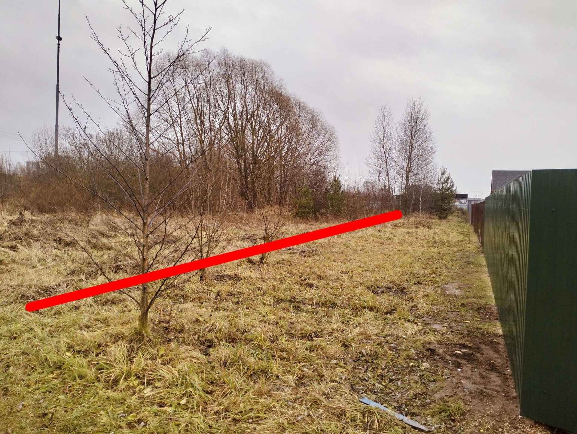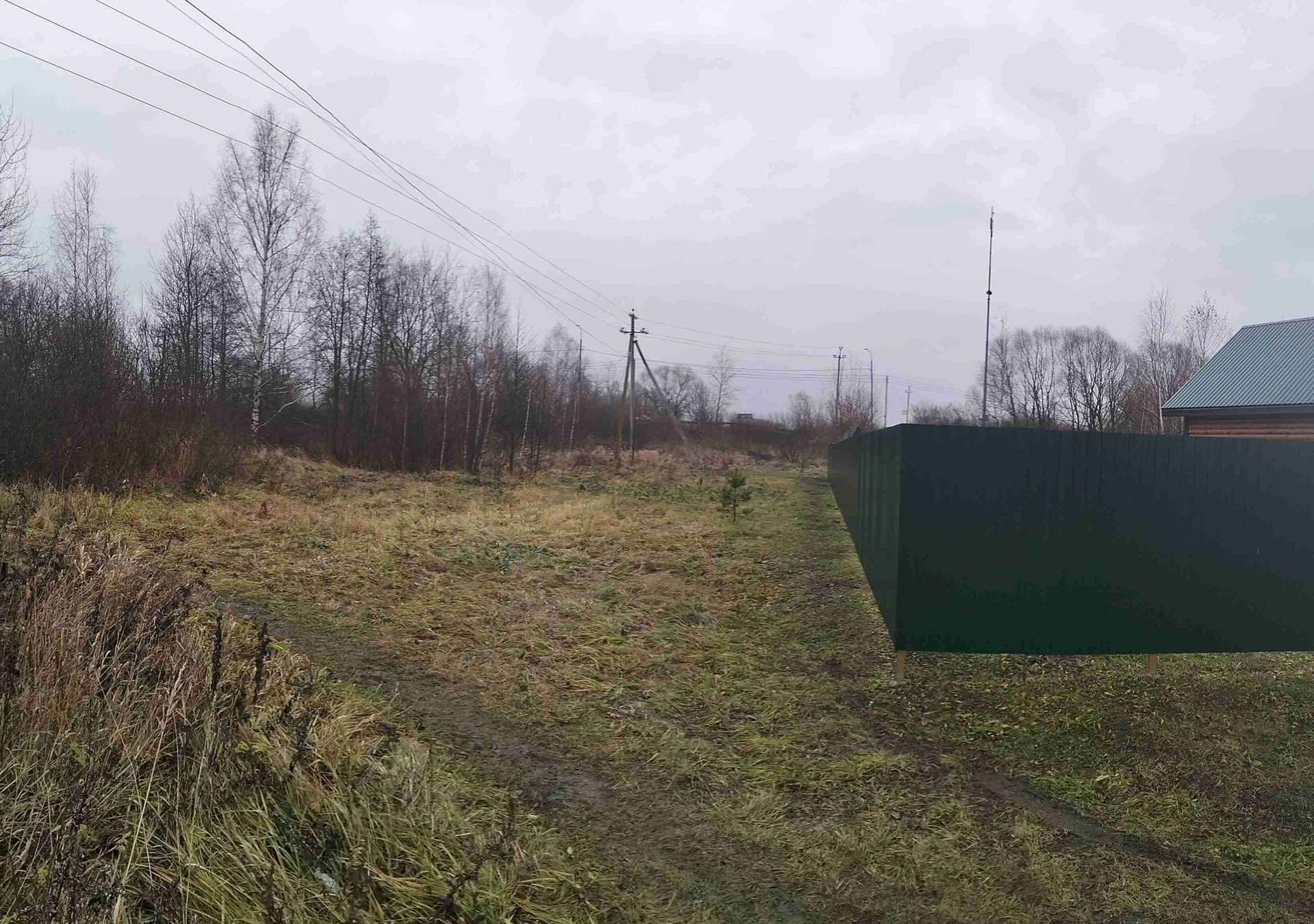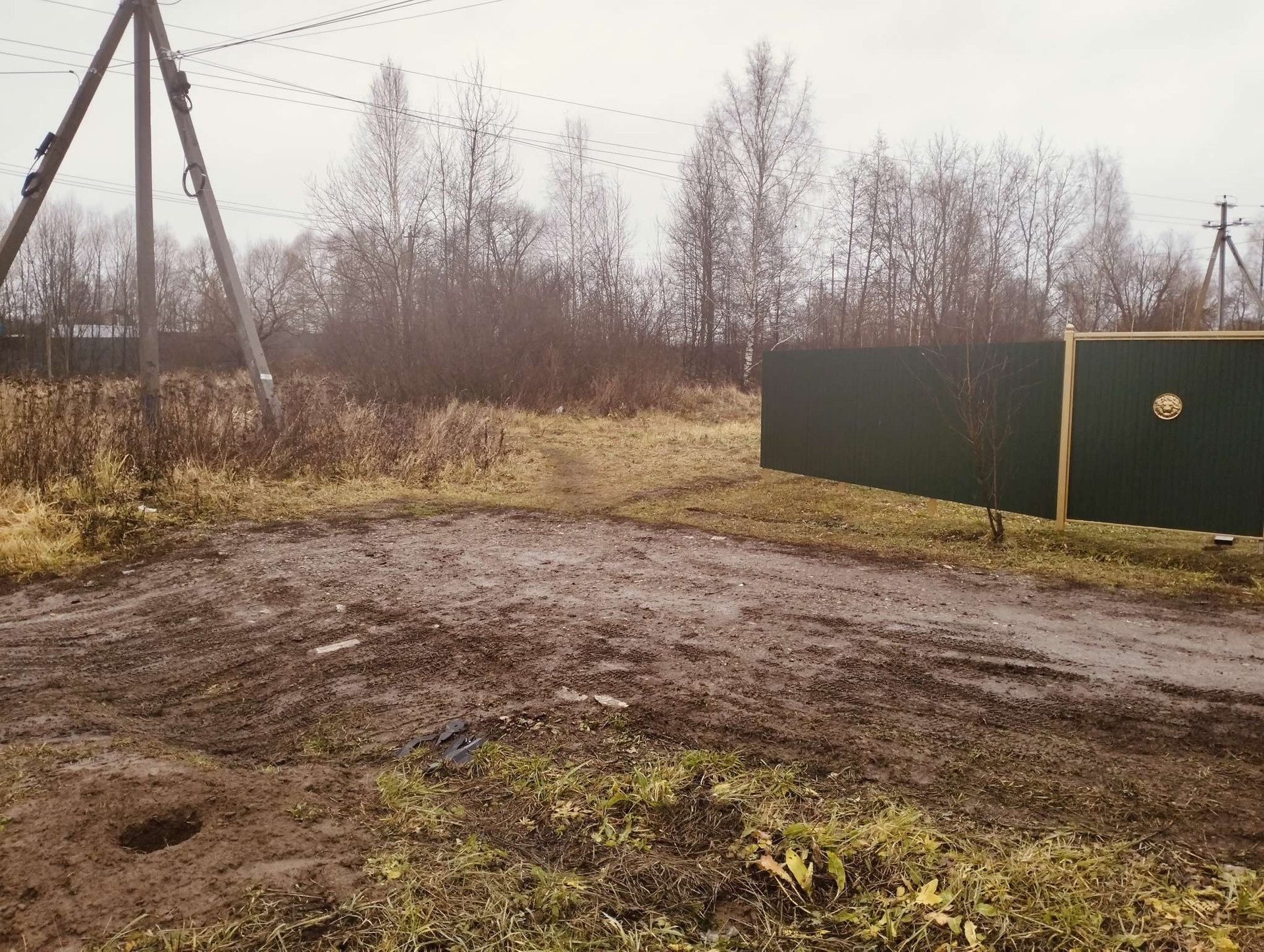 Участок угловой,огорожен с одной стороны. Рядом дренажная канава. Столб электрический.