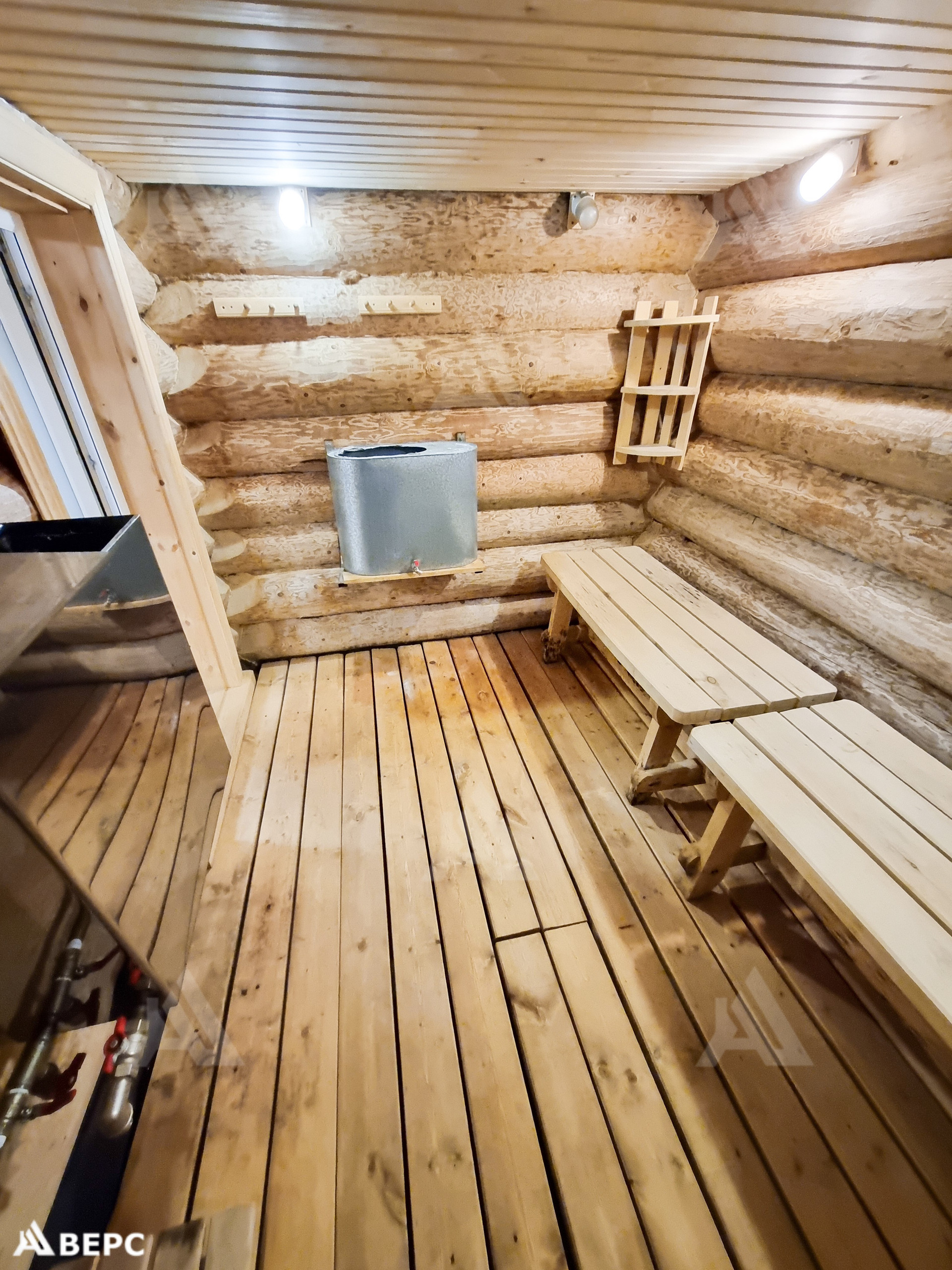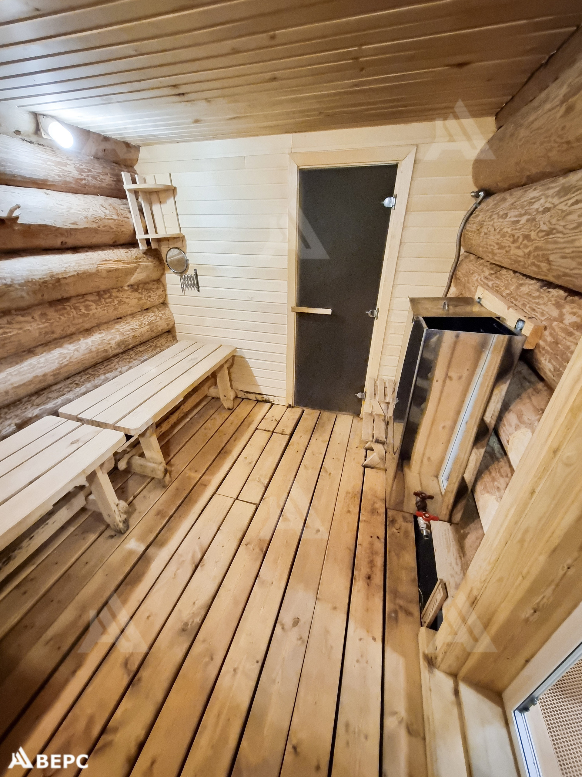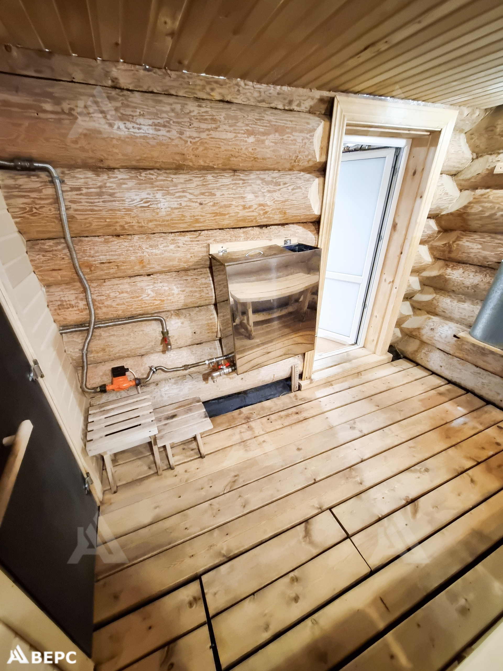 Моечная. Пол: для лучшего слива воды была сделана подушка из керамзита и залита бетоном. Был выложен пеноплекс для утепления и скат слива закрыт технониколью. Слив выведен наружу в закопанную бочку. Есть бак для холодной воды из которого с помощью насоса можно перекачать воду в бак парилке для горячей воды. Парилку от моечной отделяет стеклянная дверь. Температура до 100 градусов. Банная печь установлена на фундаменте. Уложены специальные камни. Дымоход от трубы (сэндвич) идёт через всё перекрытия. На конце обычная труба.