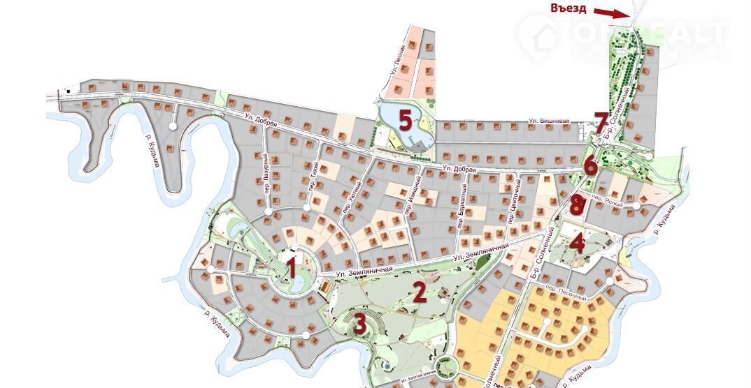 По границе участка проходит река «Кудьма», где есть возможность рыбной ловли и прогулок на сапах. Также можно оборудовать собственный пляж для уединенного отдыха вдали от городской суеты. Поселок находится в экологически чистом районе в окружении густого леса.