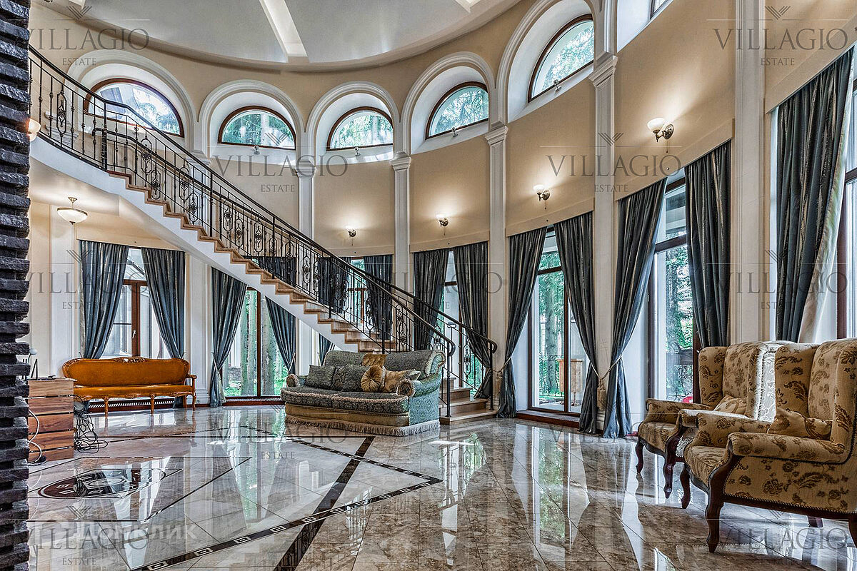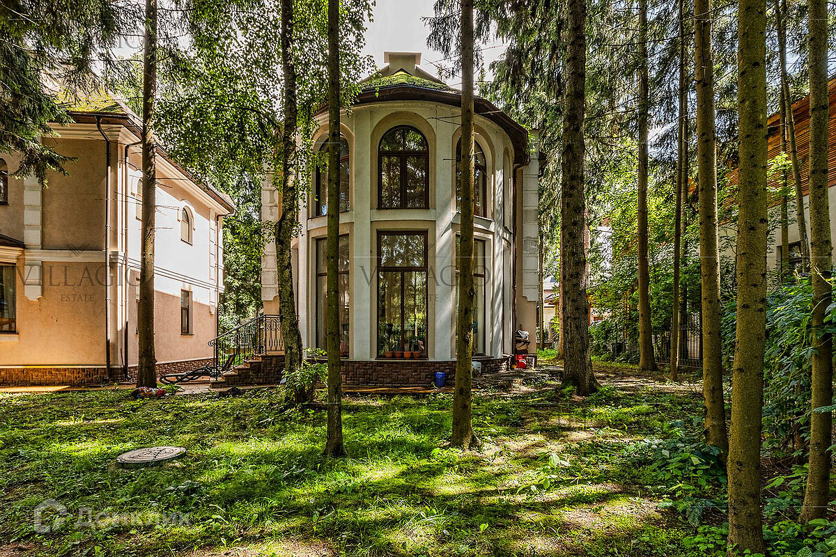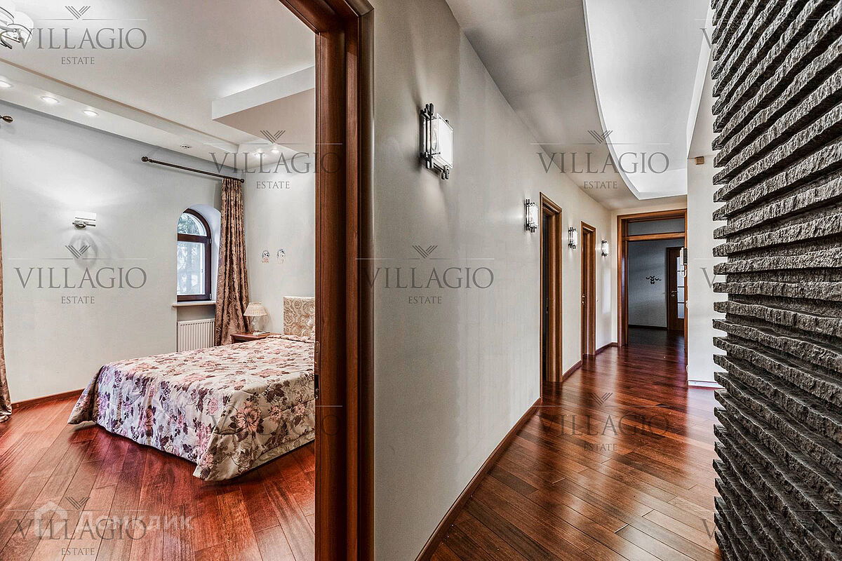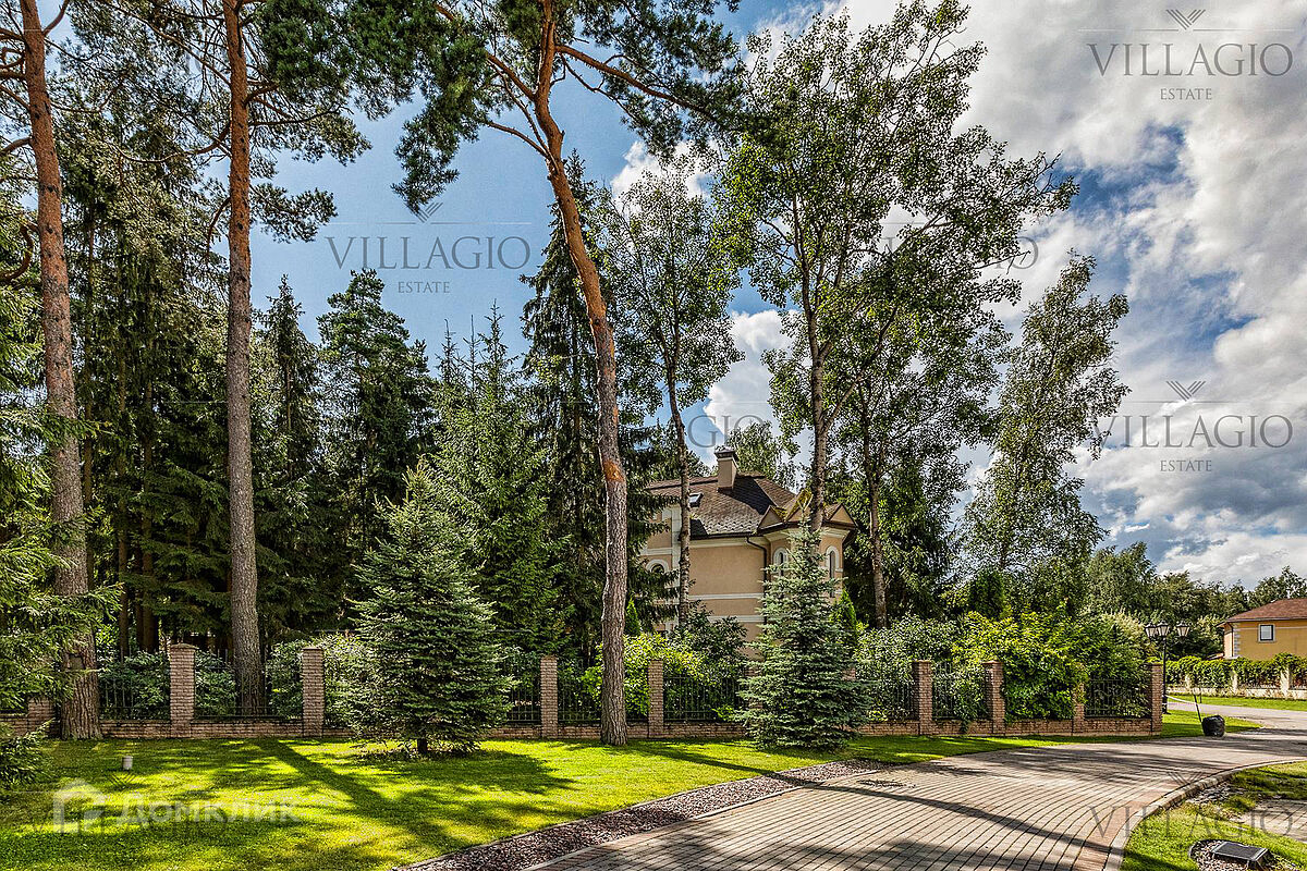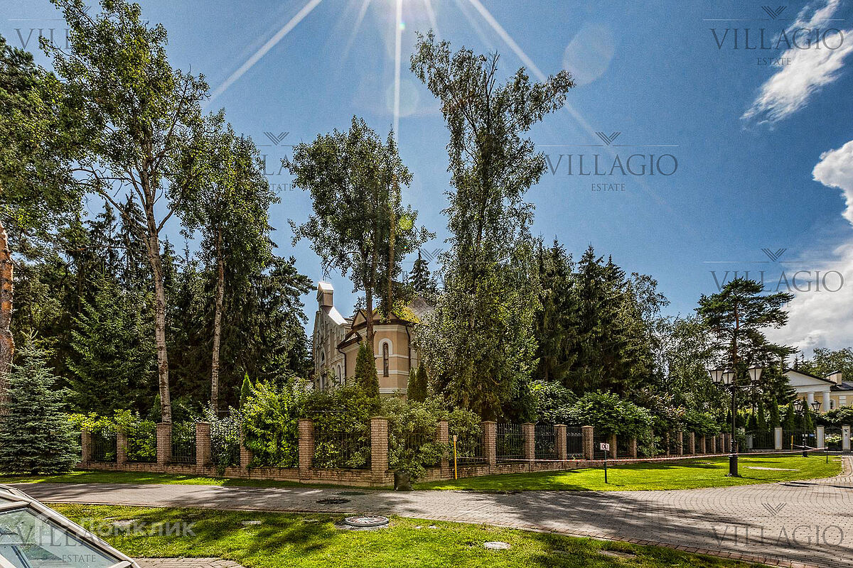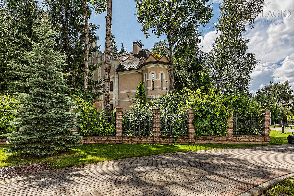 1 этаж: гардеробная, гостиная с камином, вторым светом и выходом на террасу, столовая, кухня, гостевая спальня, с/у, библиотека, бойлерная. 2 этаж: холл, хозяйская спальня с с/у и гардеробной, гостевая спальня с балконом, детская спальня с игровой комнатой, с/у.  Мансарда: 2 спальни, с/у, зона отдыха (кинотеатр).  На участке расположен 2-х этажный гостевой дом, в котором располагается гараж на 1 авто с квартирой для персонала площадью 200 м². Инженерия: все центральные коммуникации, ТВ, высокоскоростной интернет, приточно-вытяжная система вентиляции, кондиционирование, система фильтрации воды.