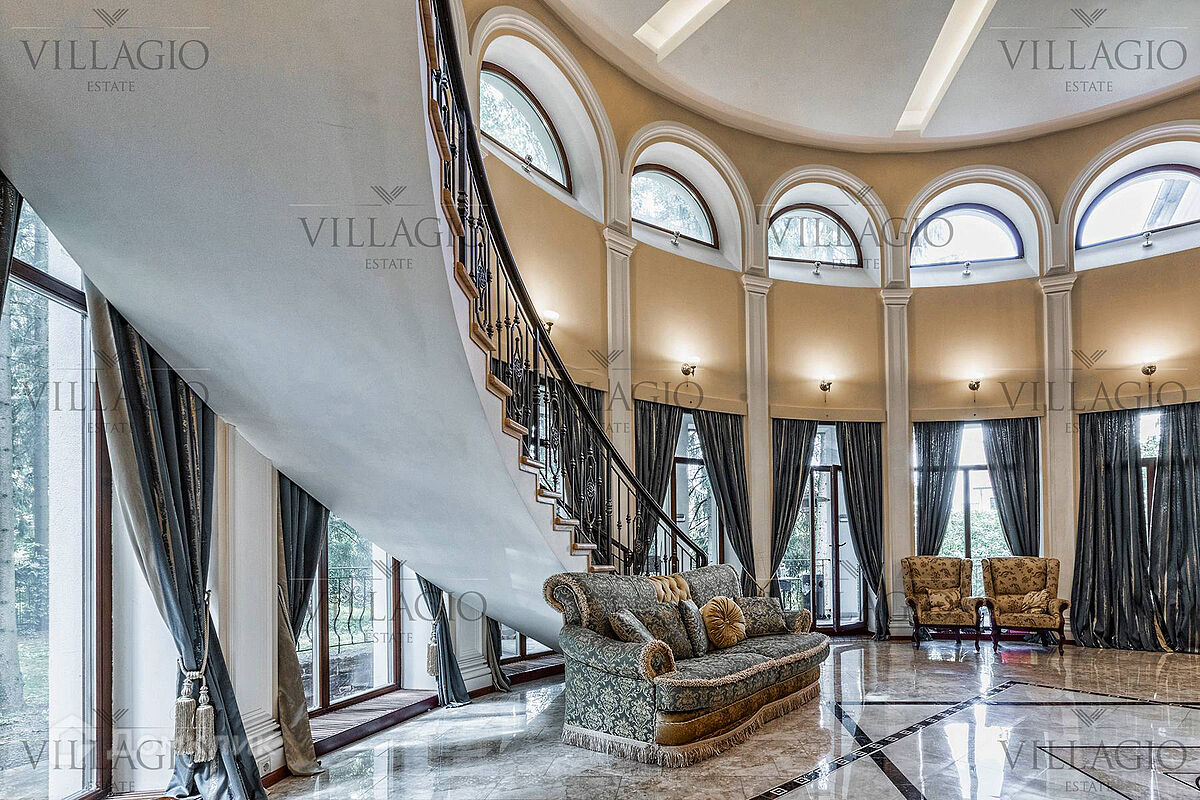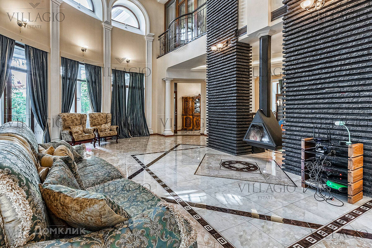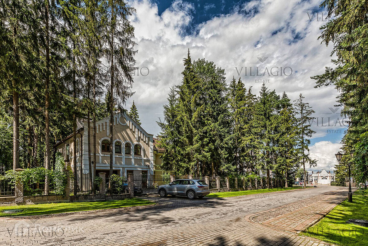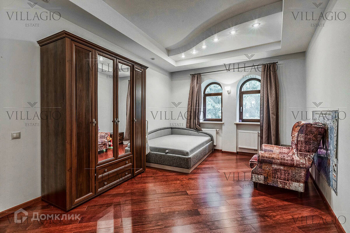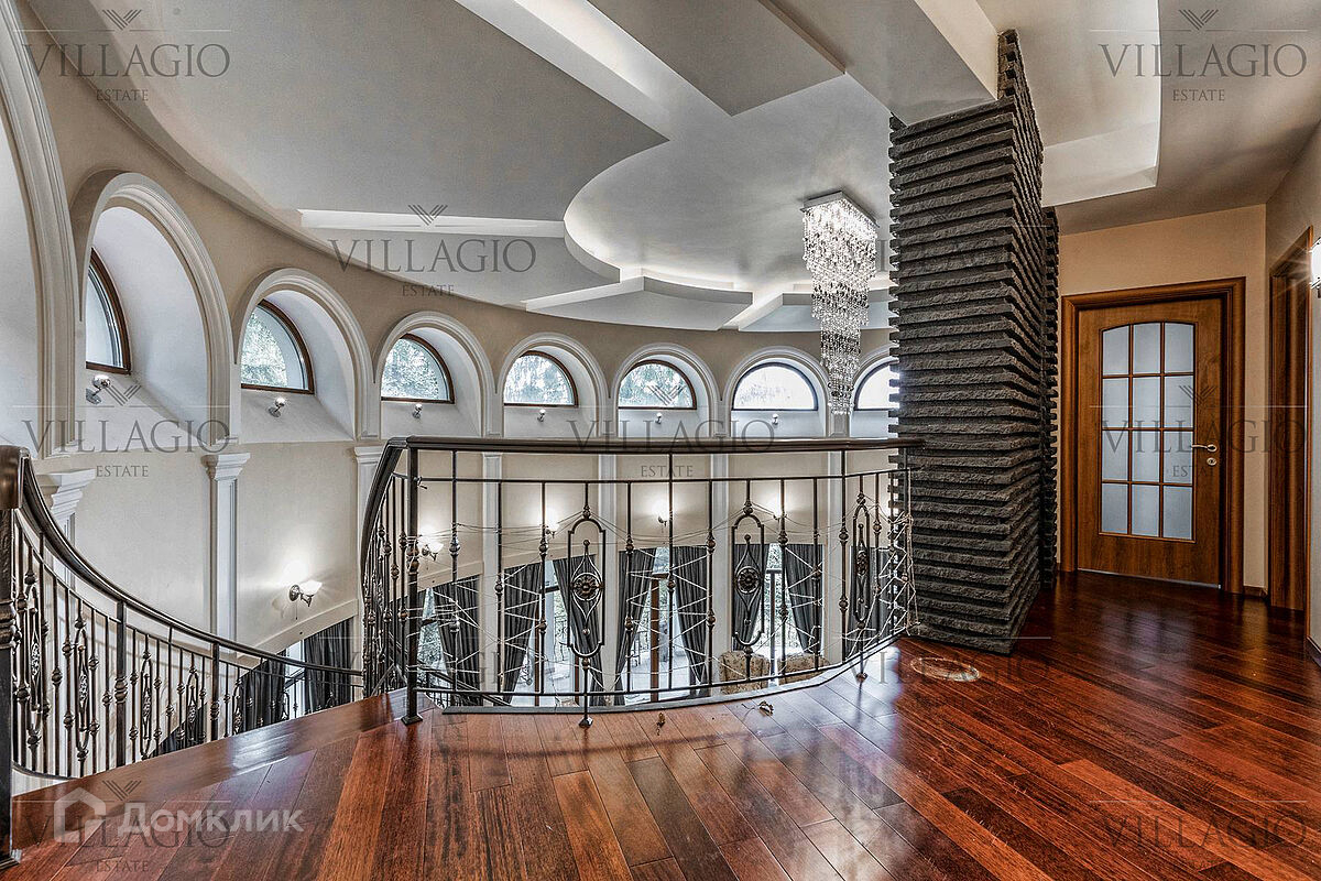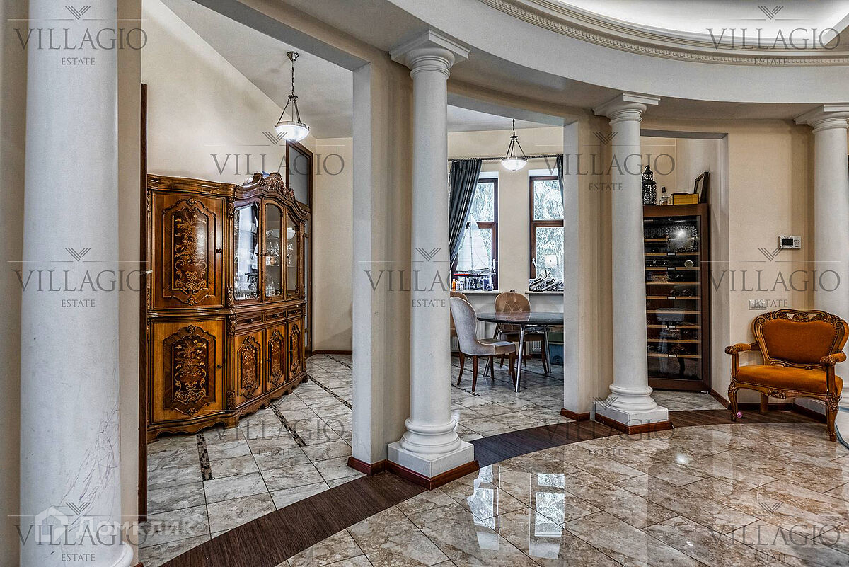 1 этаж: гардеробная, гостиная с камином, вторым светом и выходом на террасу, столовая, кухня, гостевая спальня, с/у, библиотека, бойлерная. 2 этаж: холл, хозяйская спальня с с/у и гардеробной, гостевая спальня с балконом, детская спальня с игровой комнатой, с/у.  Мансарда: 2 спальни, с/у, зона отдыха (кинотеатр).  На участке расположен 2-х этажный гостевой дом, в котором располагается гараж на 1 авто с квартирой для персонала площадью 200 м². Инженерия: все центральные коммуникации, ТВ, высокоскоростной интернет, приточно-вытяжная система вентиляции, кондиционирование, система фильтрации воды.