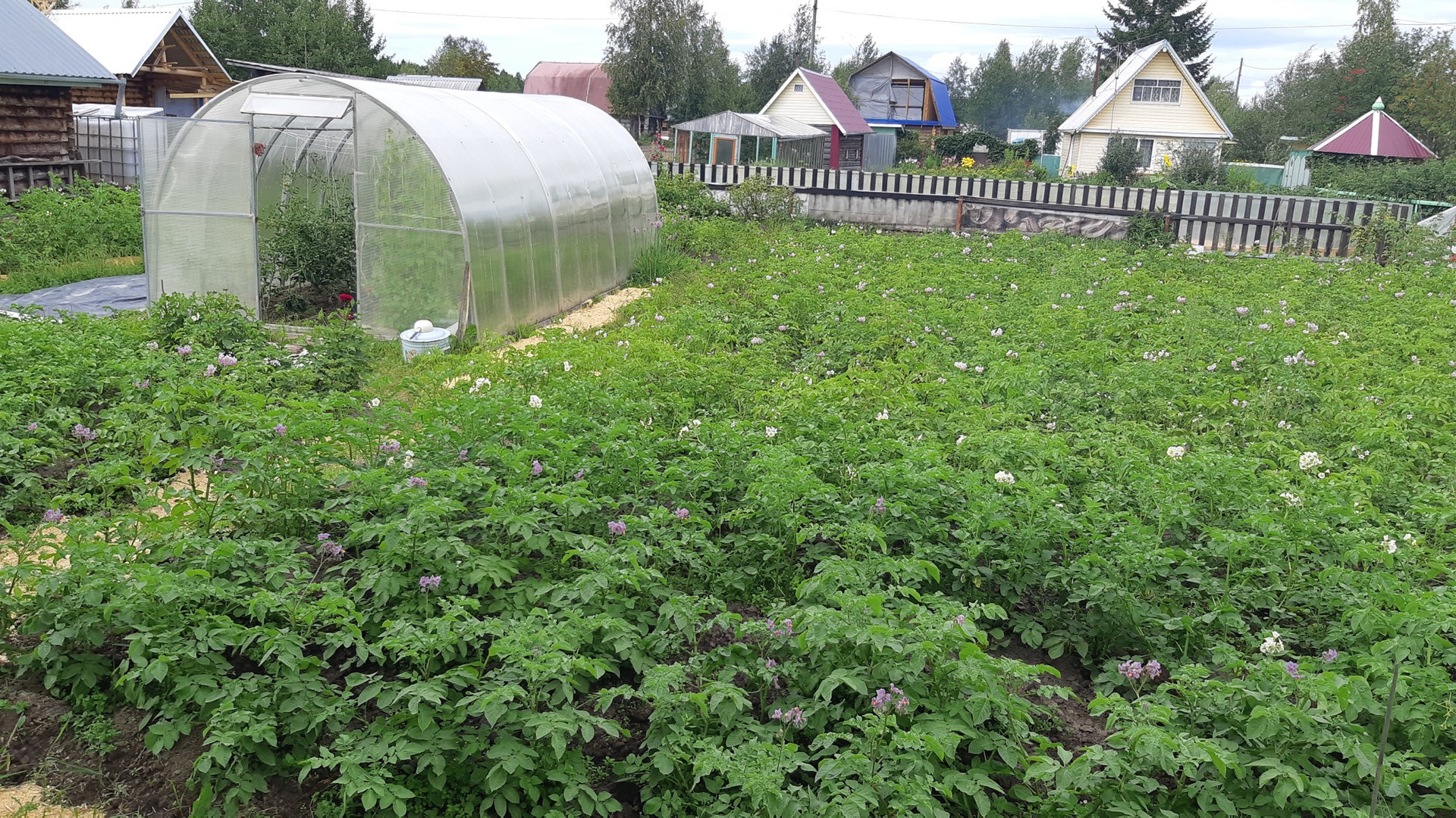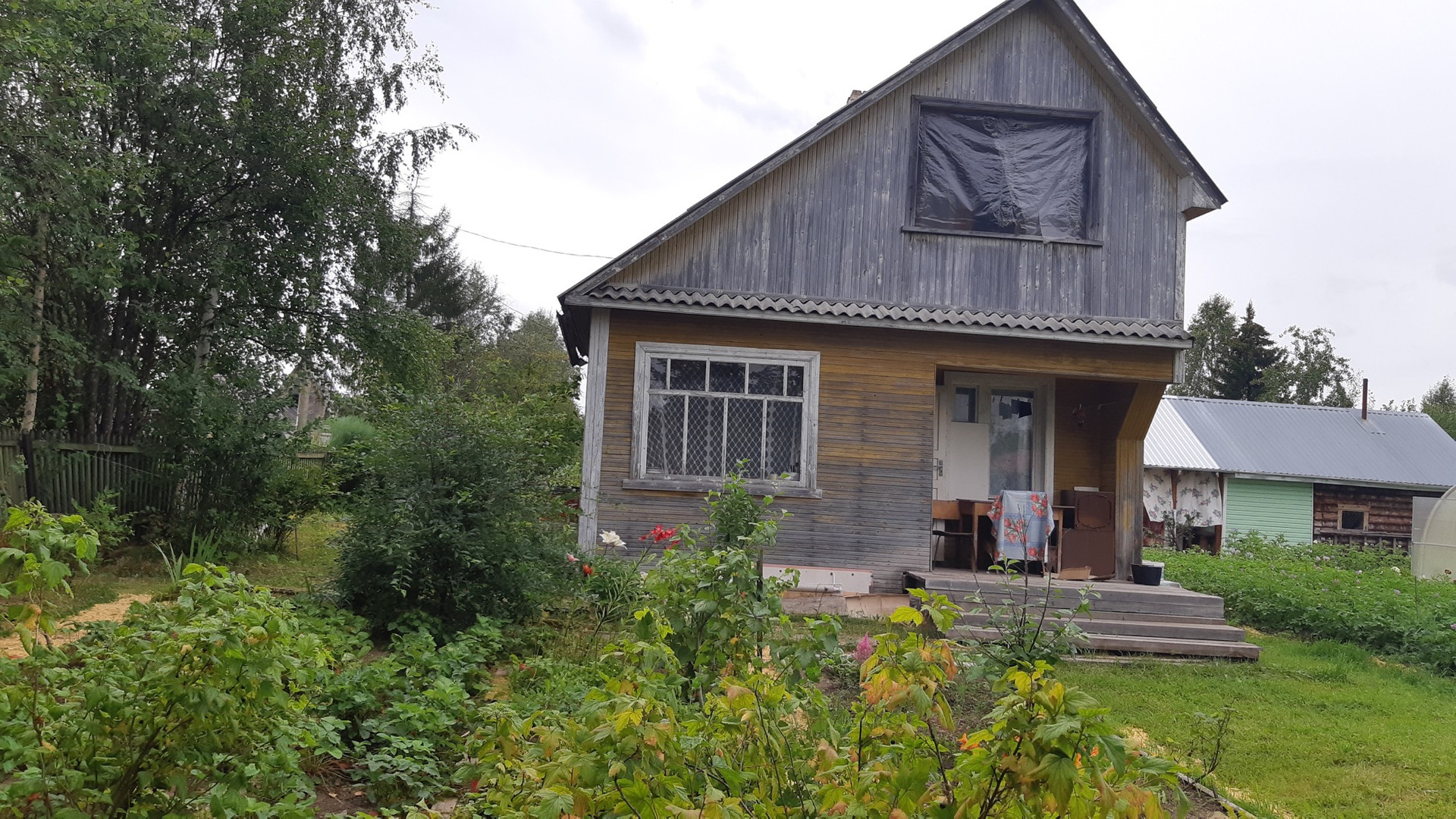 Дача с домом, дом из бруса, кустарники, теплица, общество Панель