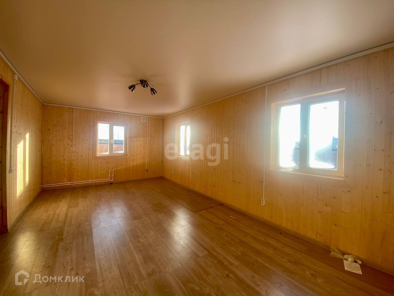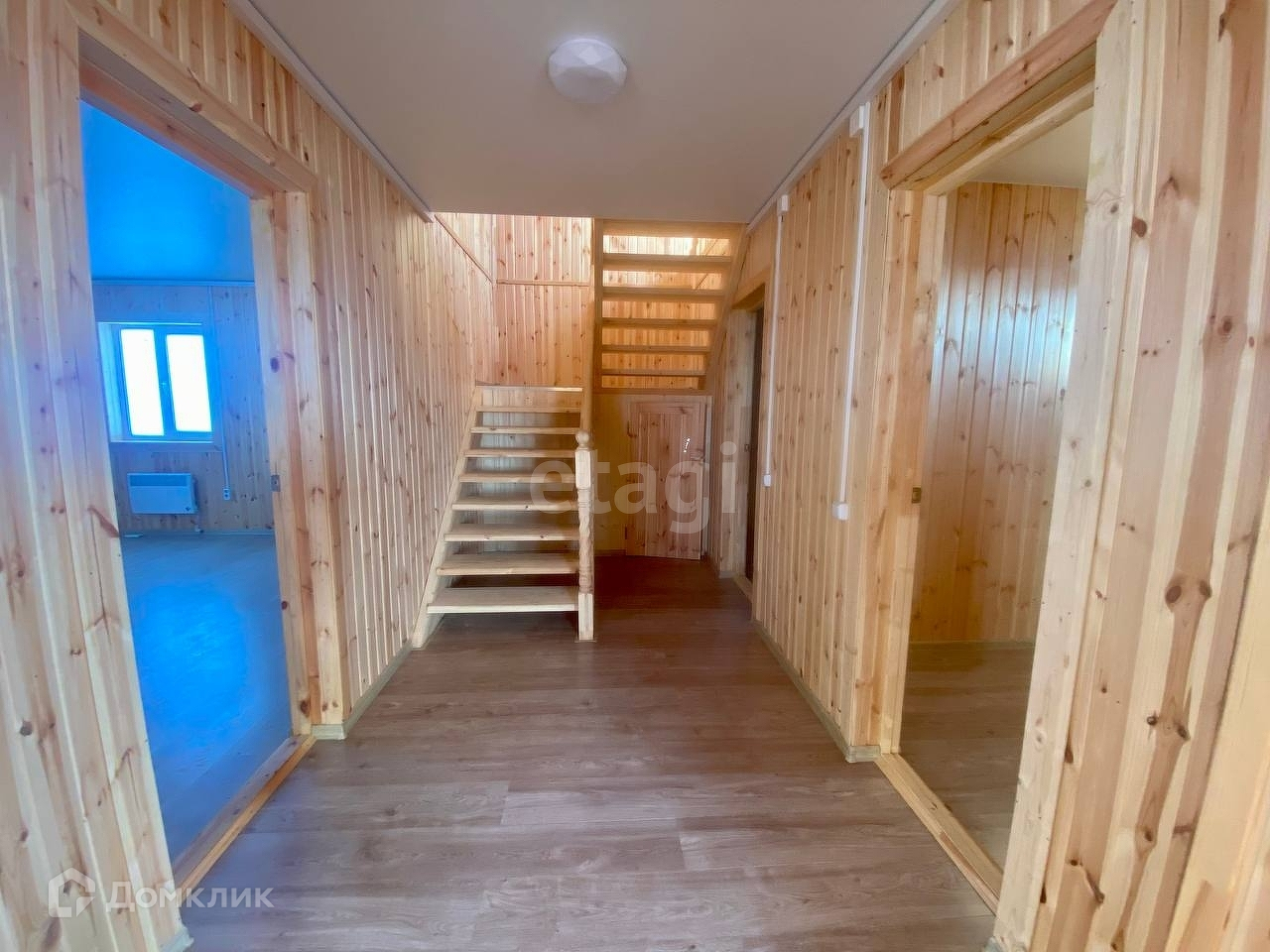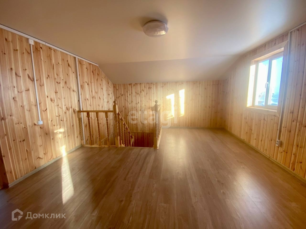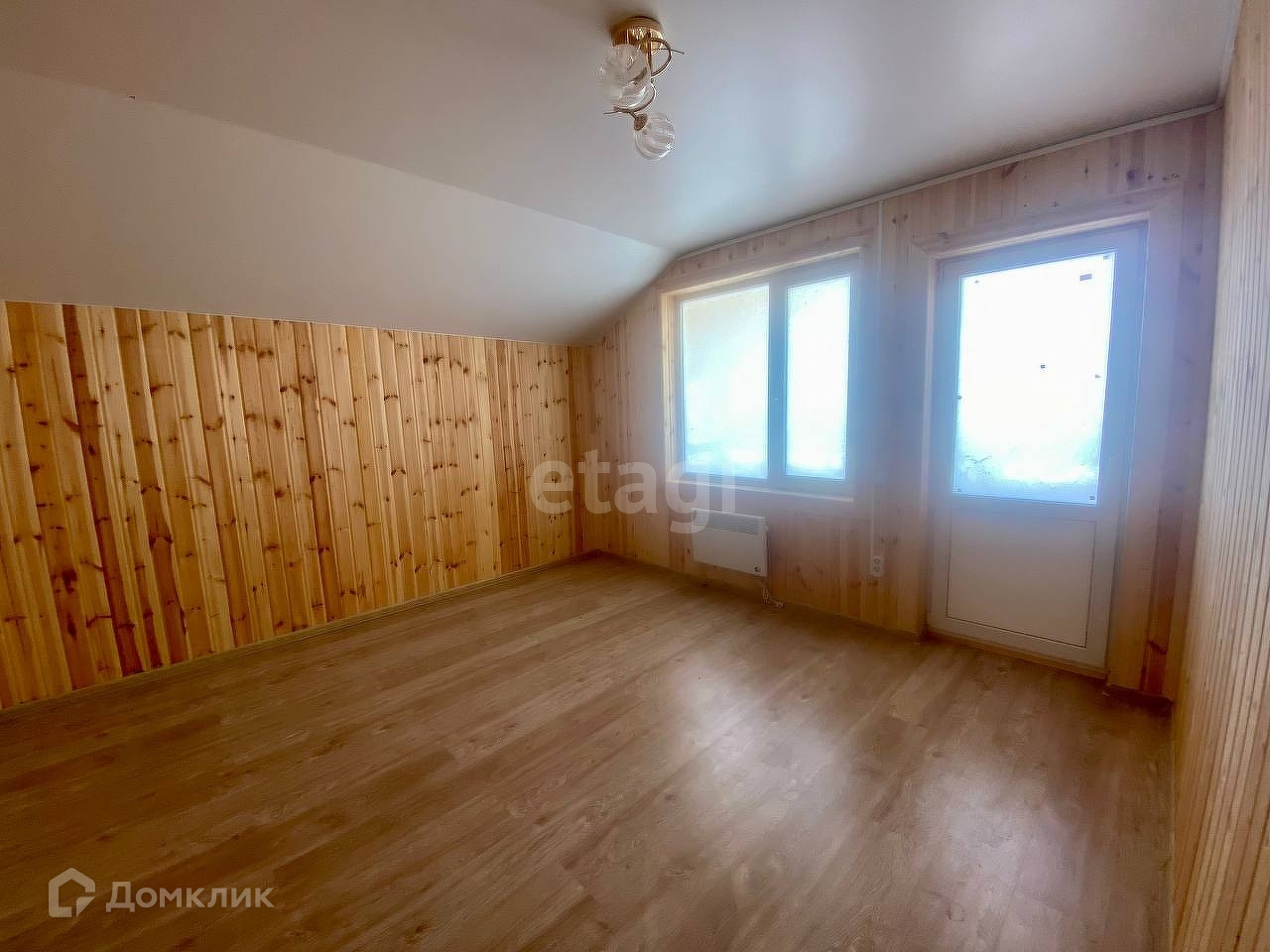 На первом этаже большая кухня-гостинная, санузел и спальня. На втором этаже еще три спальни, в одной из которых выход на балкон.