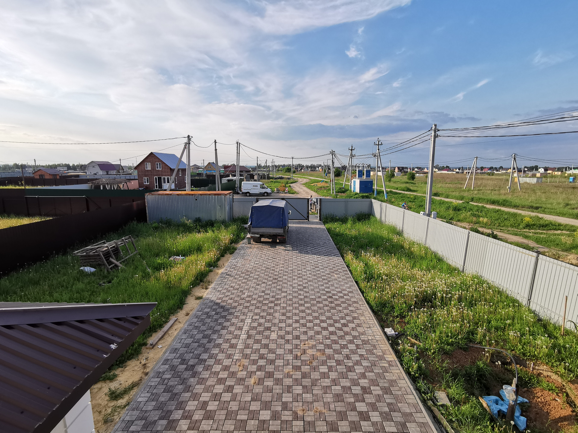 Участок правильной прямоугольной формы 6,26 соток, огорожен капитальным забором из профнастила, есть ворота, заезд и отмостки оформлены брусчаткой.