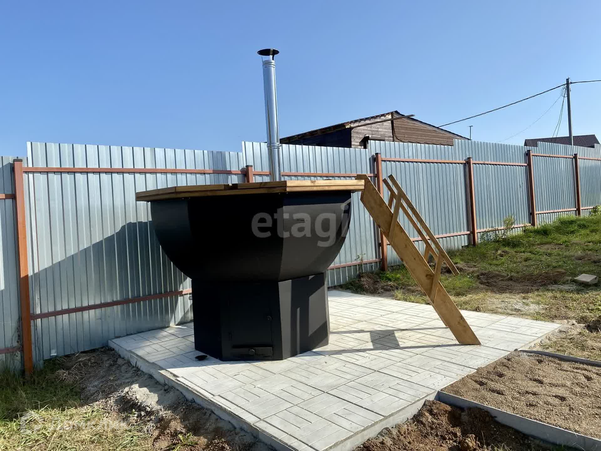 Участок полностью благоустроен, выложены садовые дорожки, установлена большая беседка, банный чан на 8 персон.