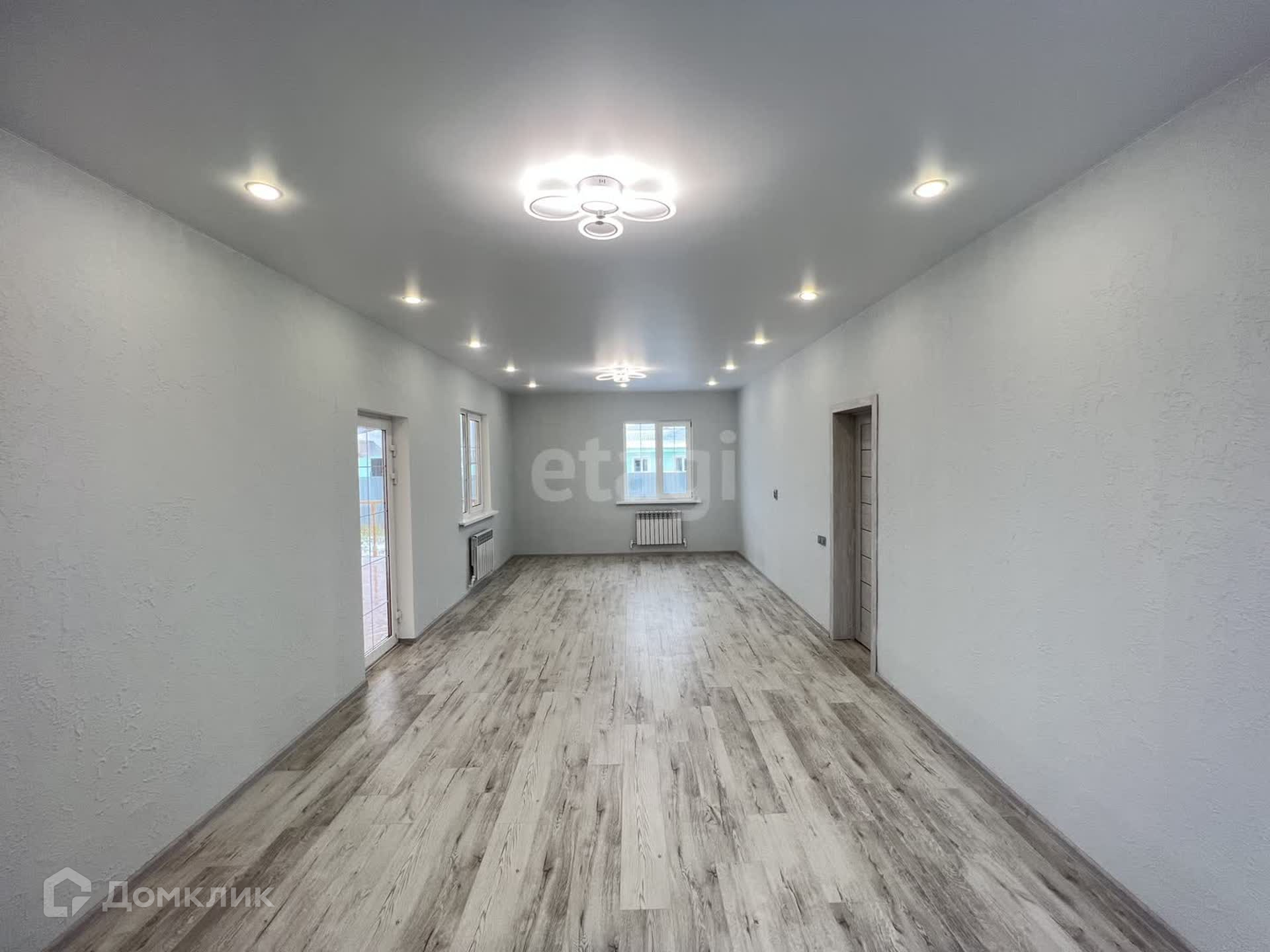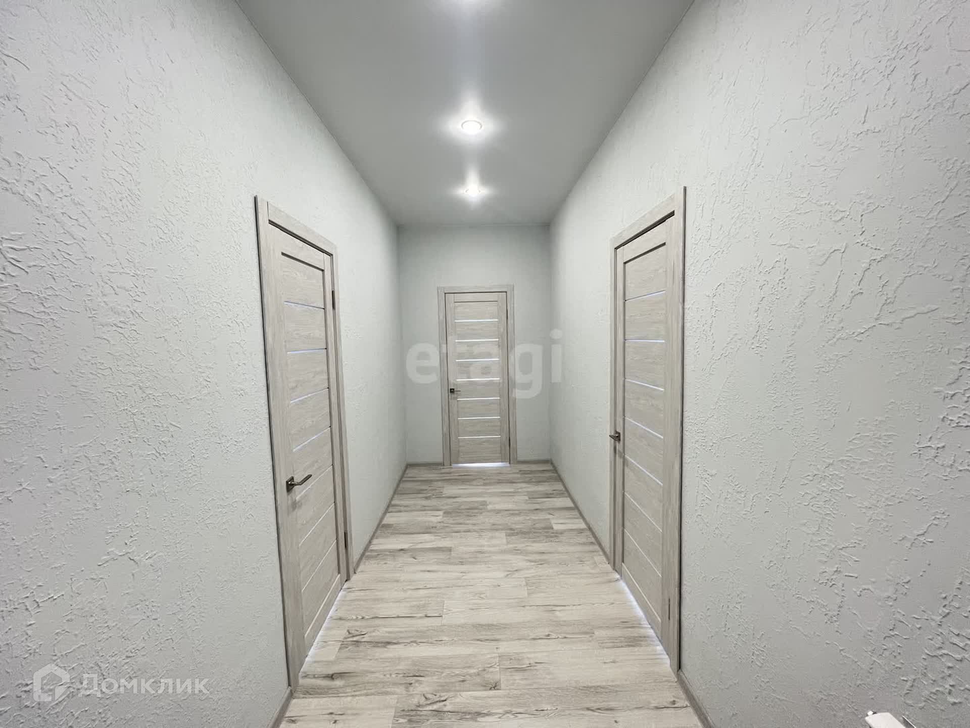 Внутри дома стены выполнены из декоративной штукатурки, создавая стильную и уютную обстановку. Полы покрыты ламинатом в одном стиле, а потолки натянуты натяжными потолками, что придает дому элегантный вид.