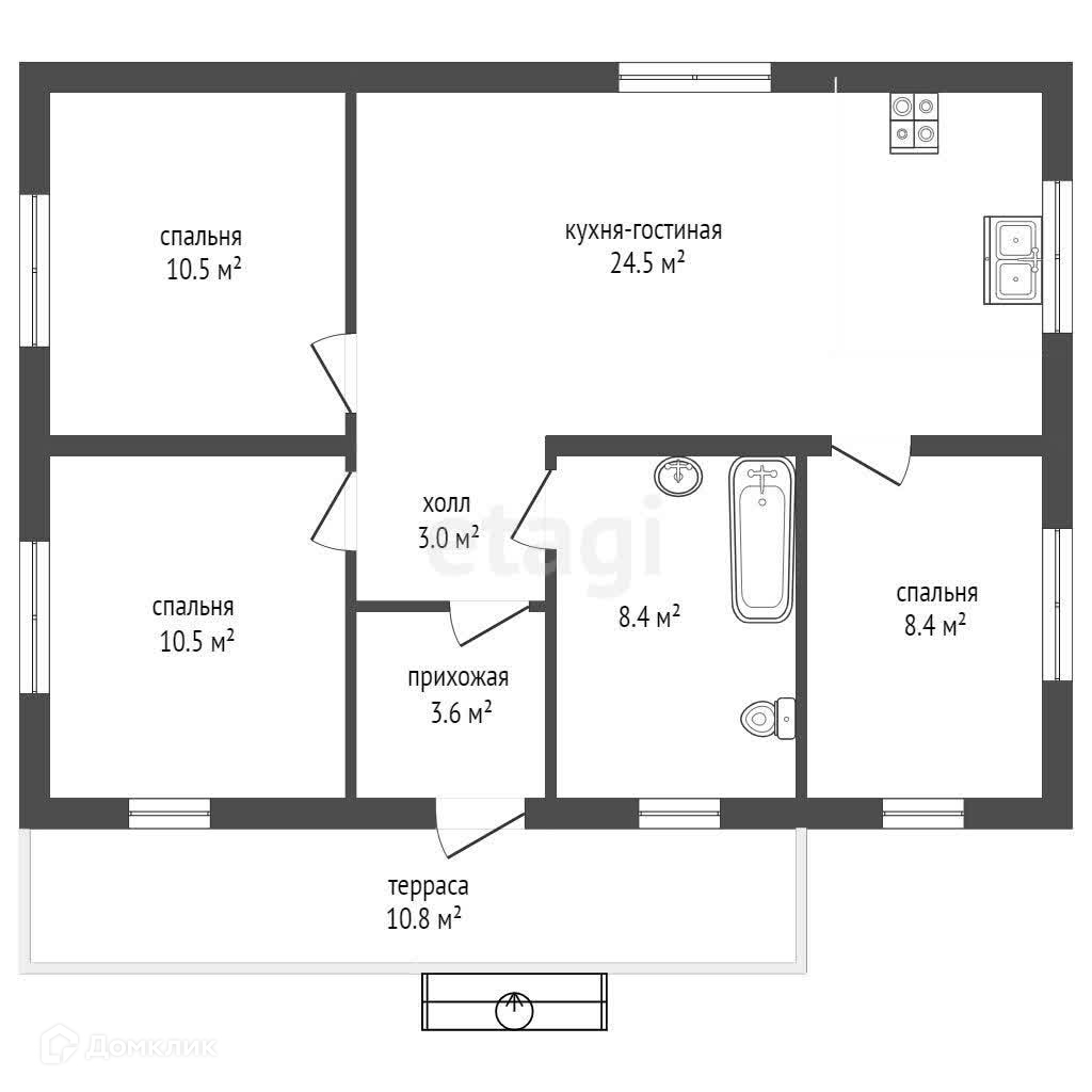 В доме три спальни правильной квадратной формы и удачного метража и большая кухня-гостинная.