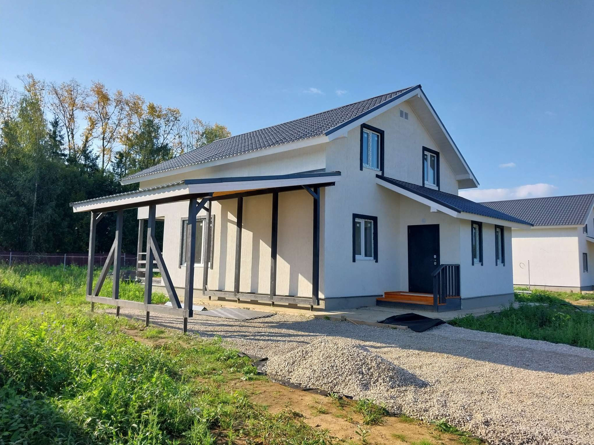 Общая площадь - 150 кв.м. Фундамент плита армированный. Утепленные цоколь и отмостка. Материал стен - газобетон, утеплен. Отделка имитация бруса внутри, снаружи - фасадная штукатурка "Короед". Кровля - металлочерепица, утепление 150 мм минвата. Полы - теплый пол, кафель.