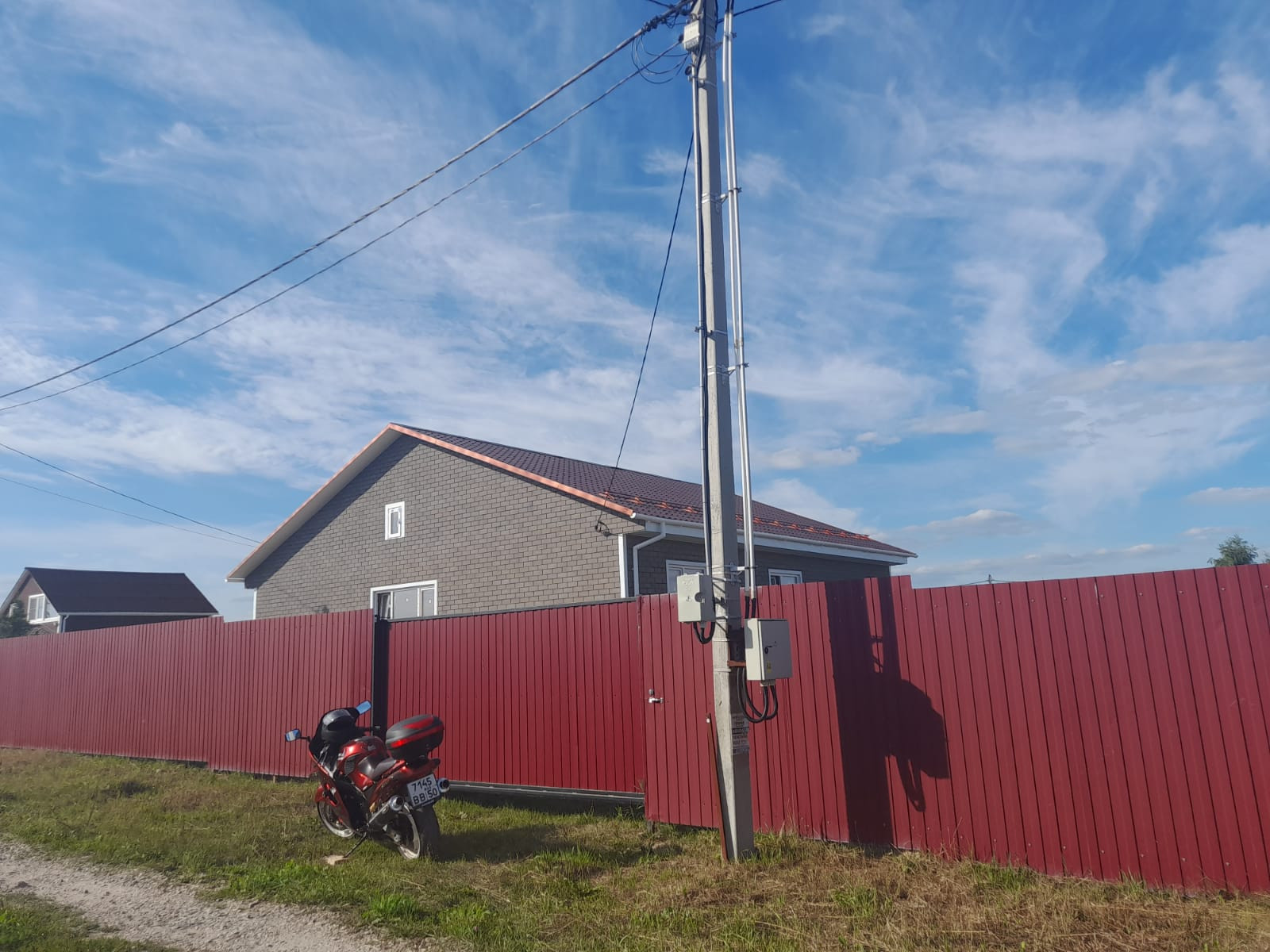 Участок с забором из профлиста с калиткой и откатными электрическими воротами.
