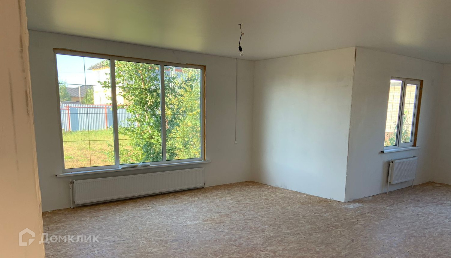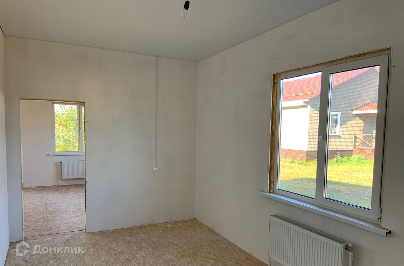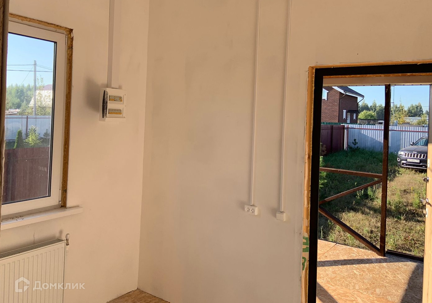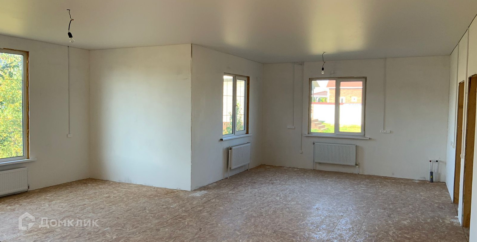 Каркасный на сваях. Одноэтажный. С утеплением. Год постройки 2024 г. Большие и светлые комнаты, благодаря панорамным окнам. Все инженерные коммуникации подключены: электричество 15 кВт разведено по всему дому с розетками, разведено отопление с радиаторами, в санузлах готово отведение воды и каналиции. Во всех помещениях уже есть натяжной потолок. Вам остается установить сантехнику, украсить стены( обои или декоративная штукатурка), застелить пол( керамогранит, кварцвинил или ламинат).