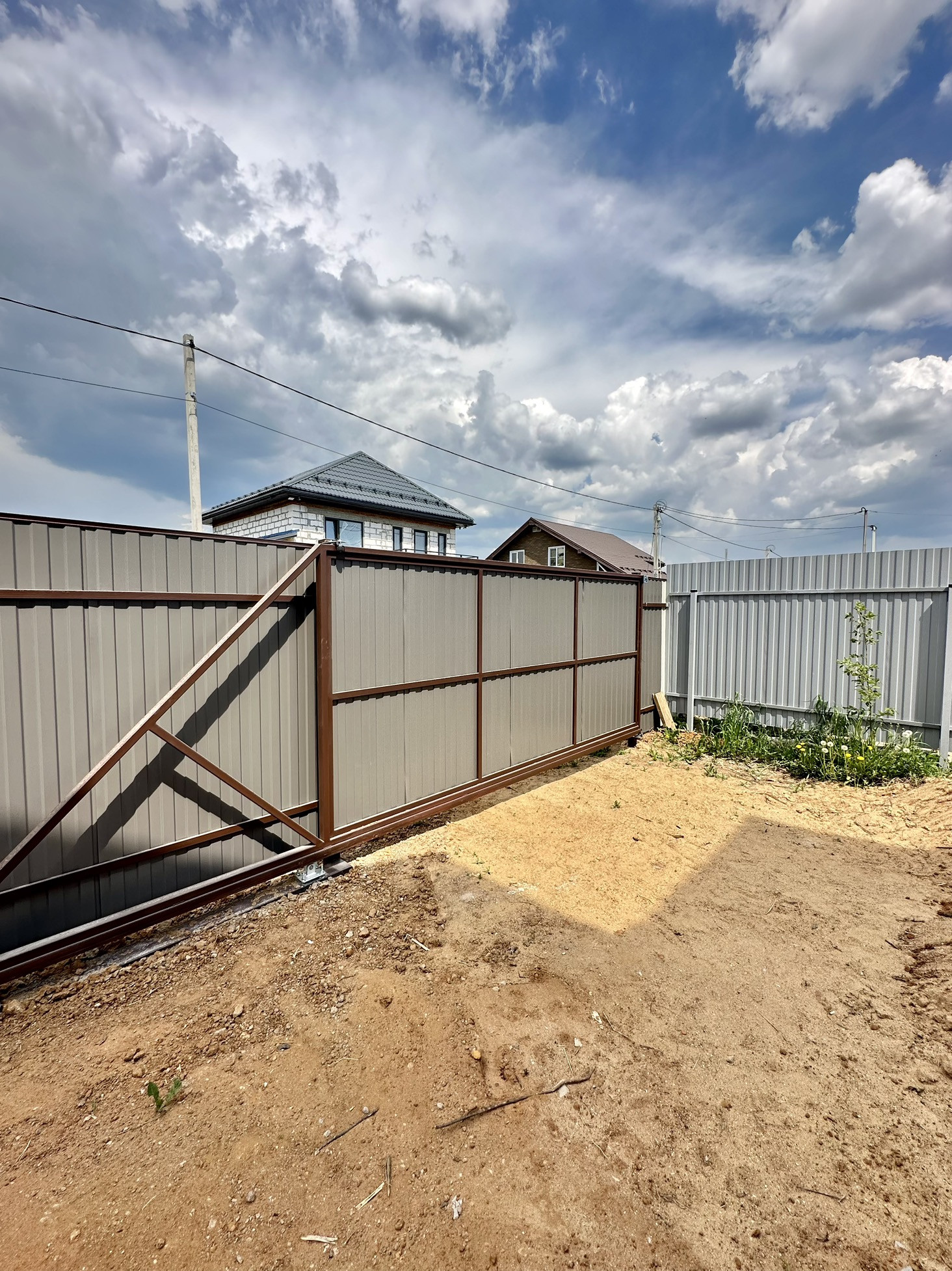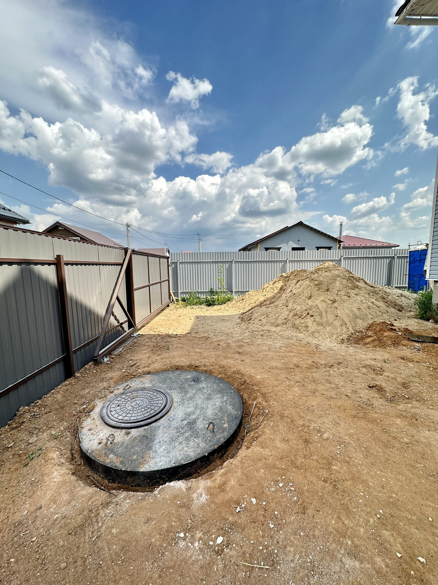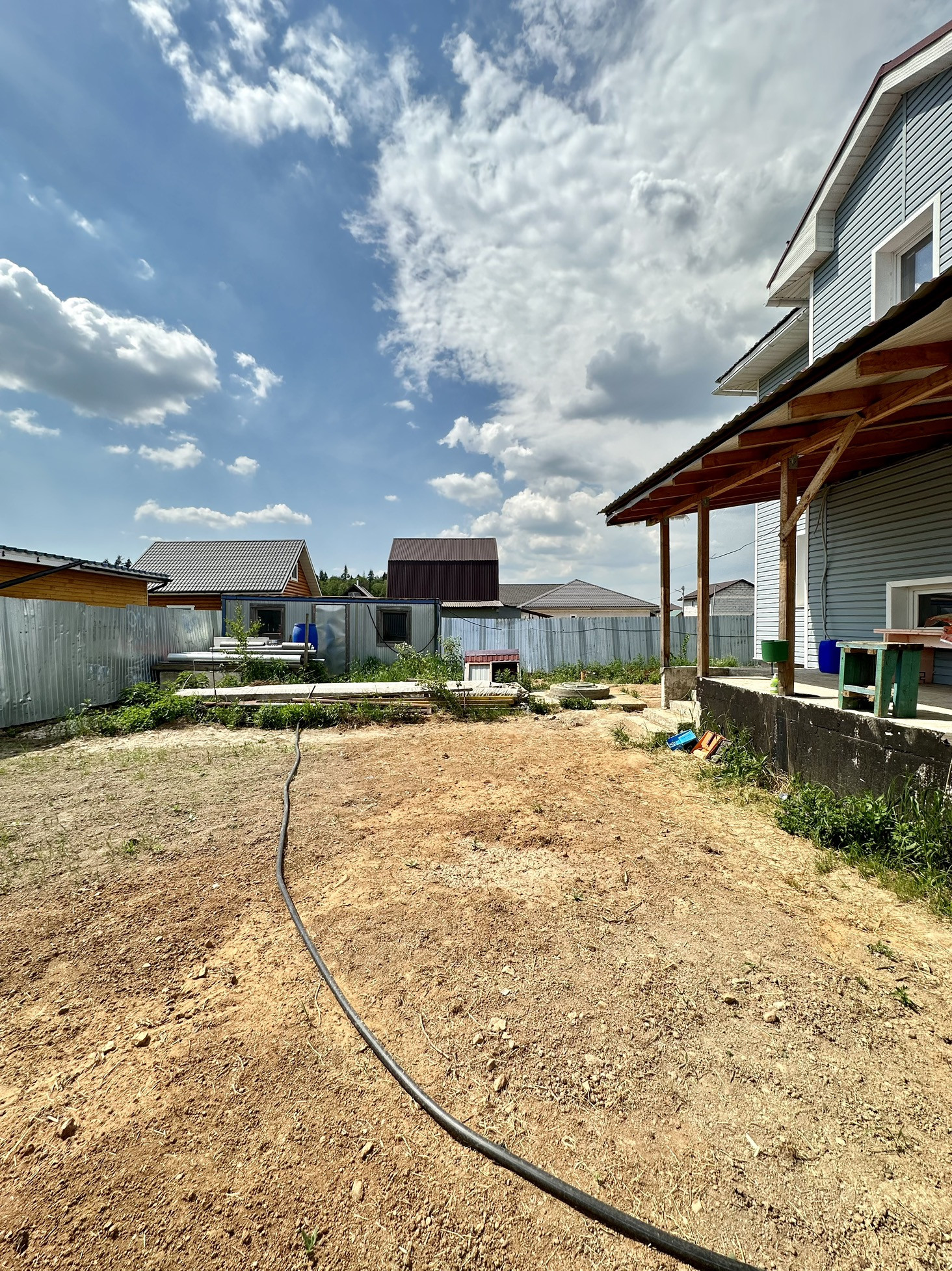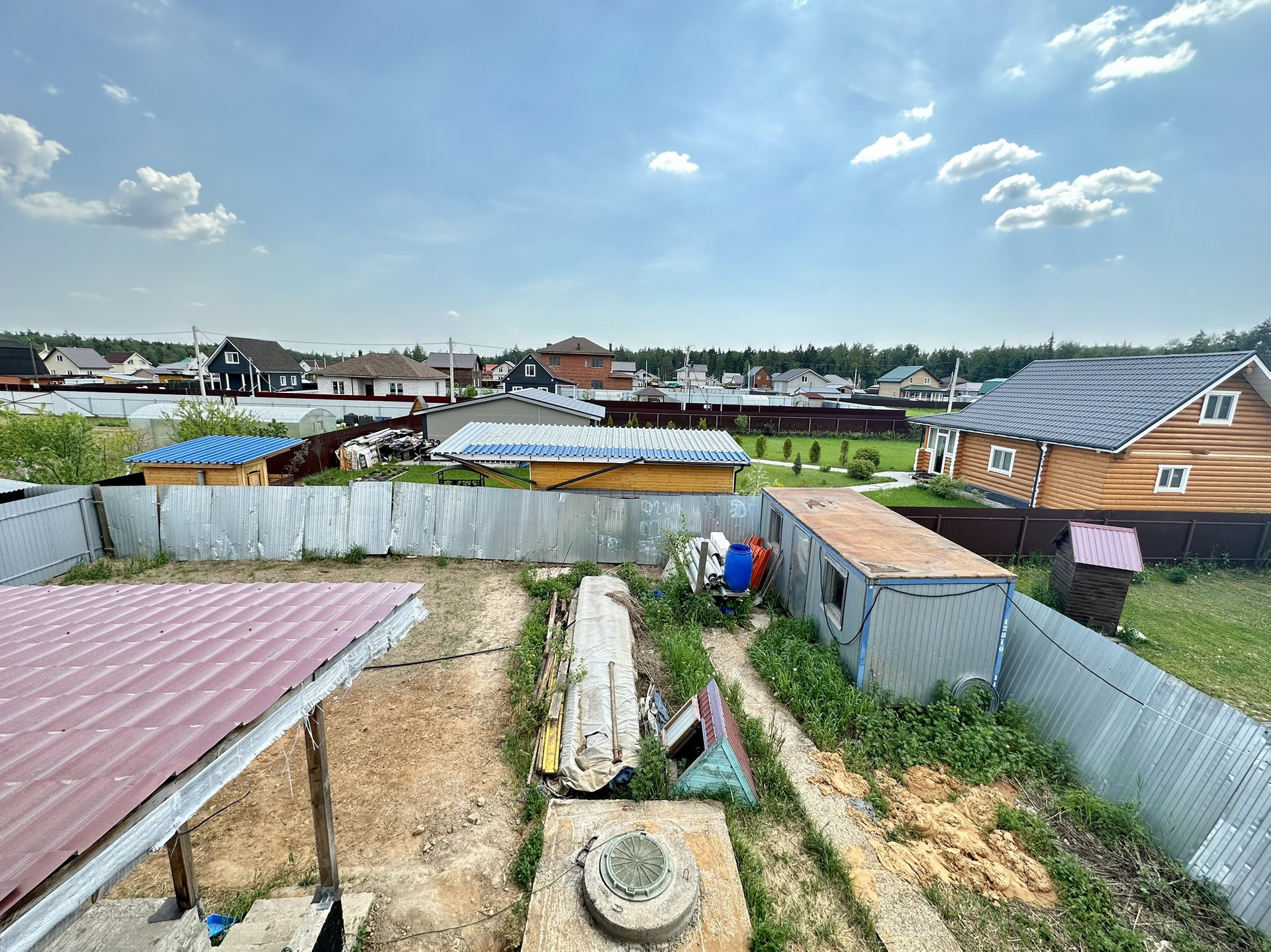 Участок ровный правильной формы, без деревьев, засеян газон. Установлен вагончик для рабочих.