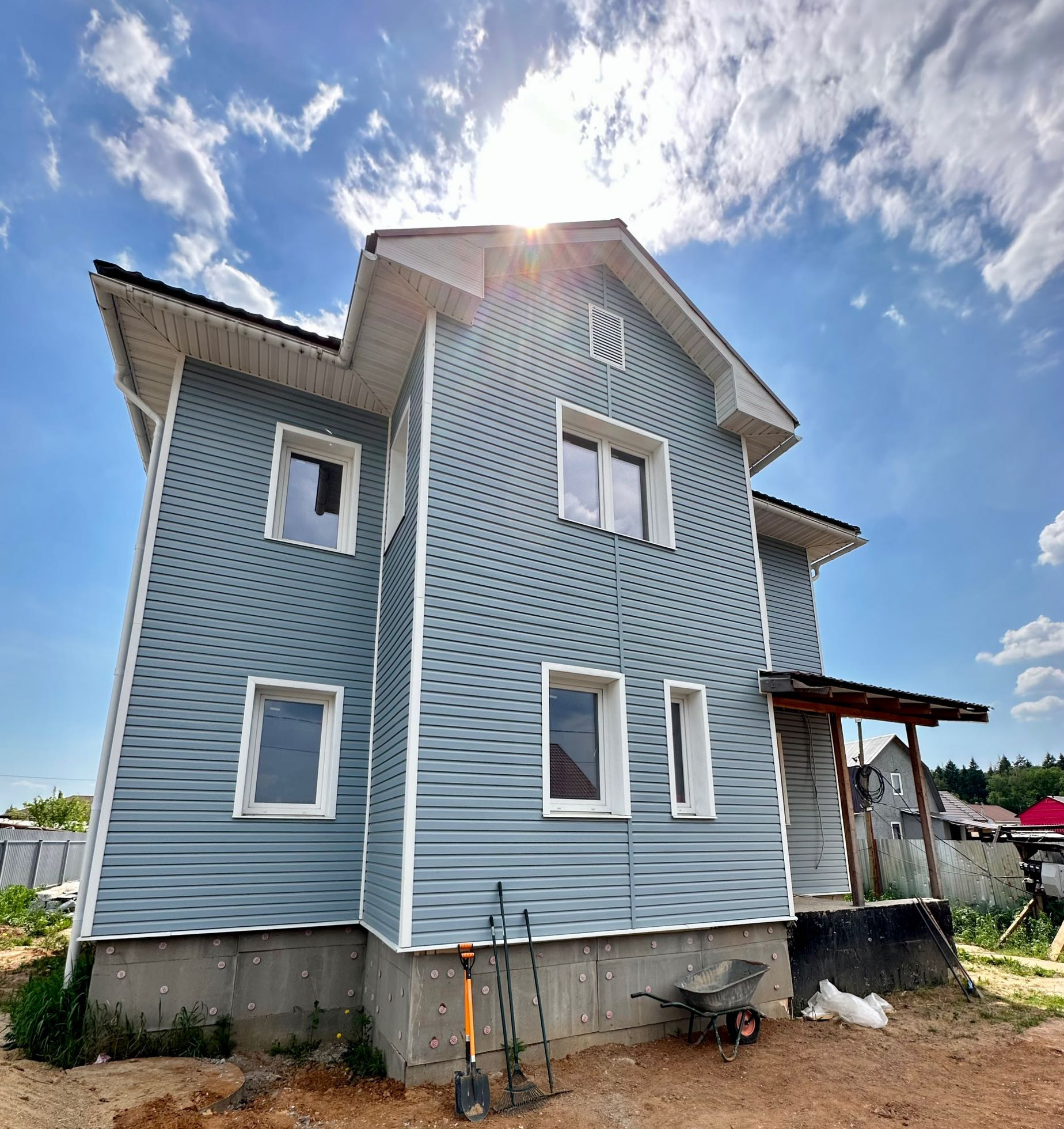 фундамент на щебневом основании толщиной 400 мм, на 16 монолитных колонах, обвязных полубалками и перекрытием 220 мм, залитых единой заливкой, стены газосиликат 300 мм, утеплитель (минвата 150 мм), пароизоляция, обшивка дома сайдинг GrandLine, остекление Veka 76мм с двухкамерным стеклопакетом, между этажами монолитная лестница, крыша металлочерепица GrandLine с установкой снегозадержателей и водосточной системой. Подвальный этаж и чердак утеплены, стены подвала утеплены пеноплексом 100 мм, чердак утеплен минватой 250 мм, выполнена стяжка по металлической сетке 50 мм. На первом этаже центральная входная группа и отдельный выход на террасу.