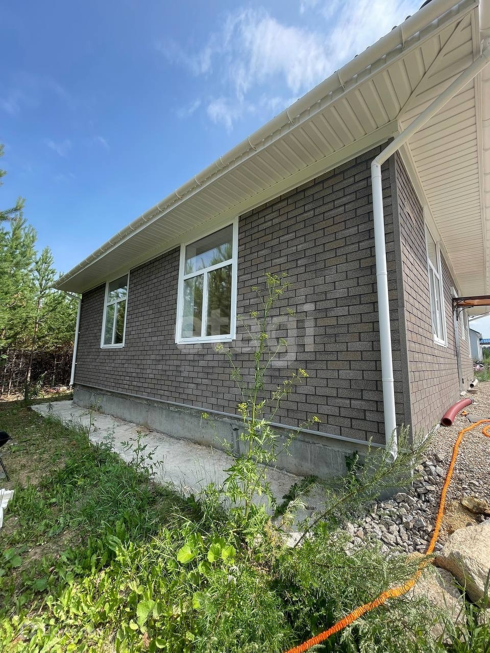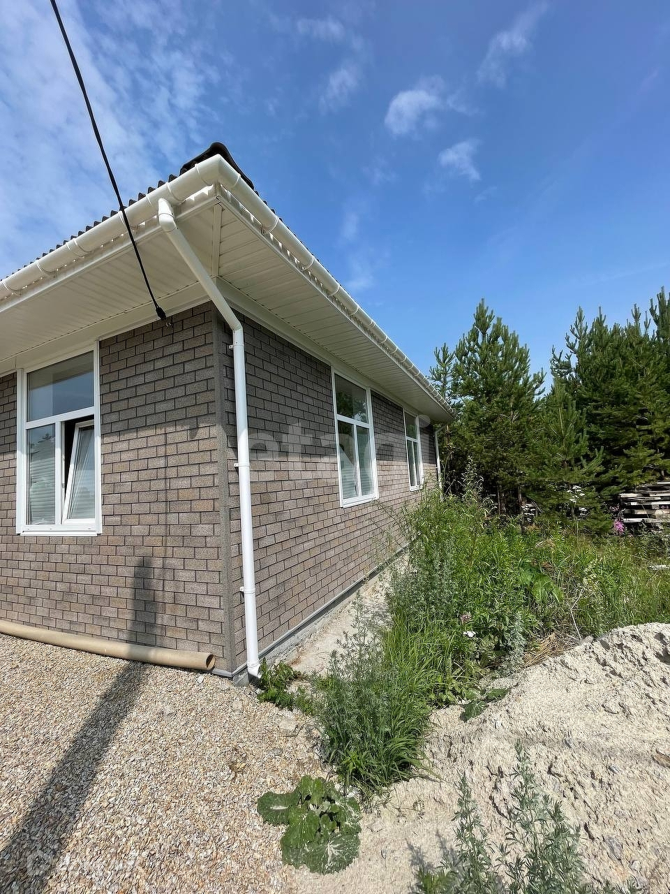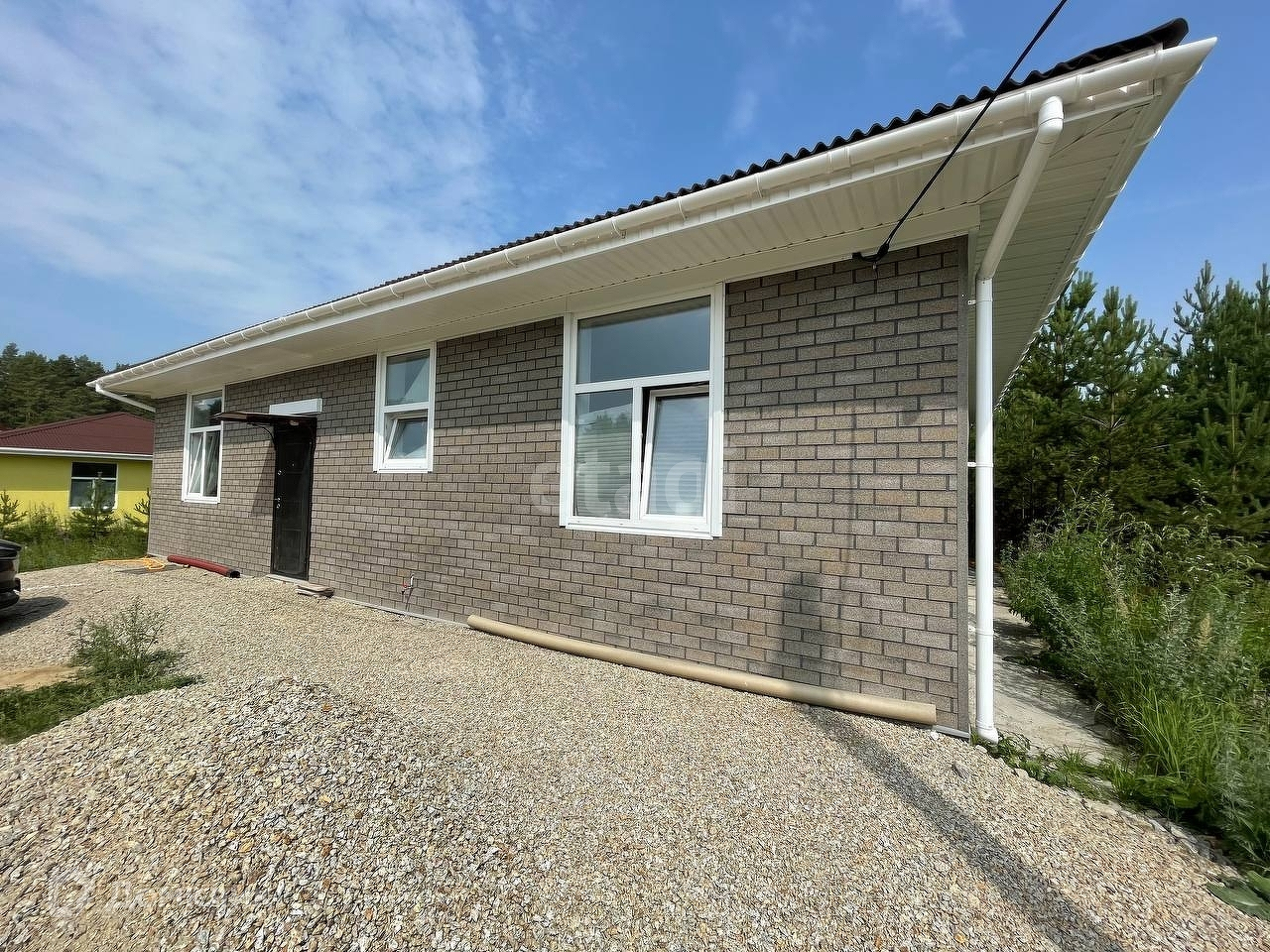 Дом расположен на просторном участке с молодыми соснами. Площадь участка позволяет установить дополнительные постройки.