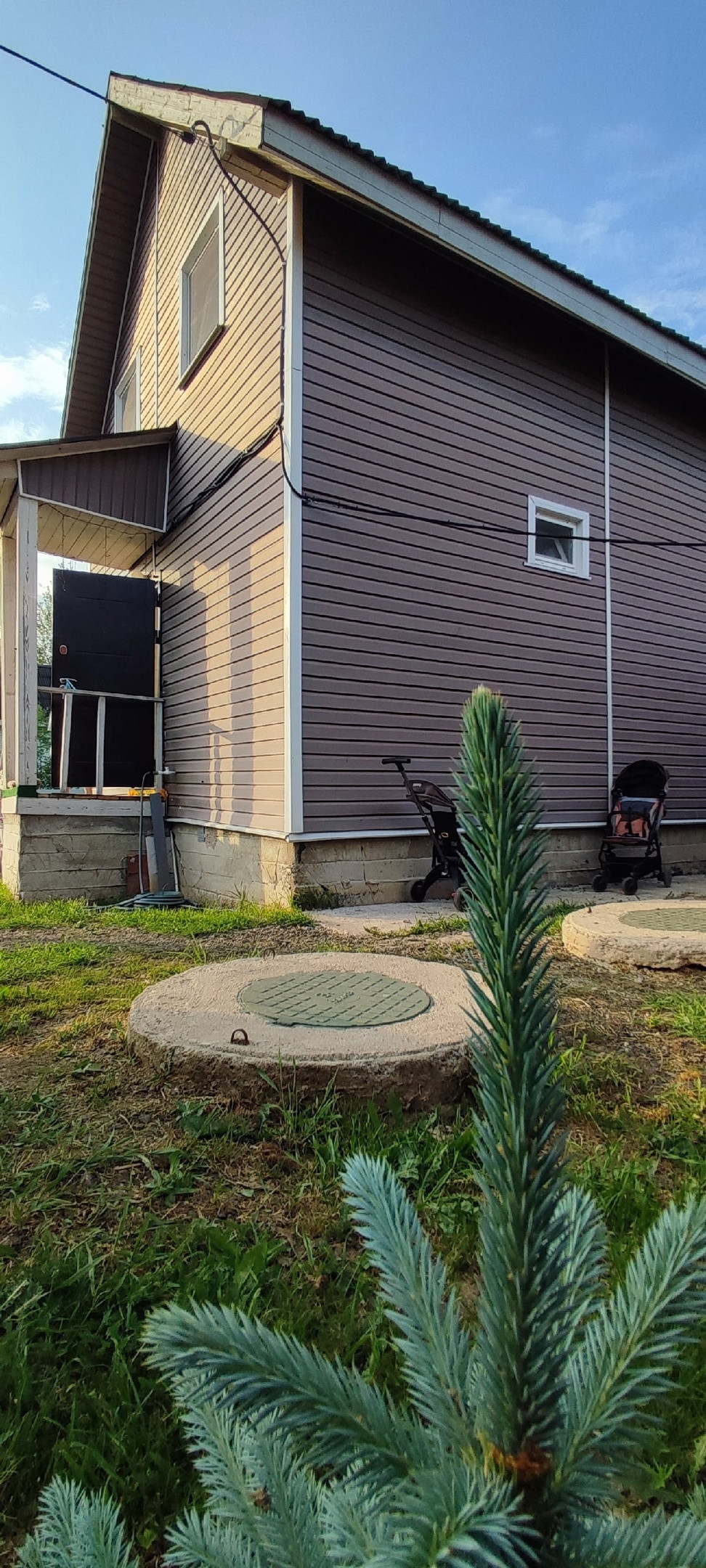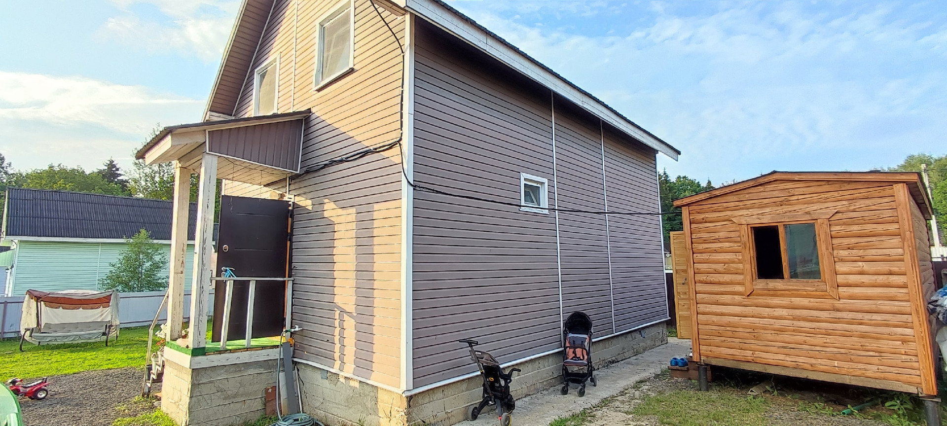 Дом построен из бруса 150*150 , стоит на хорошем ленточном армированном фундаменте, утеплëн и обшит сайдингом.