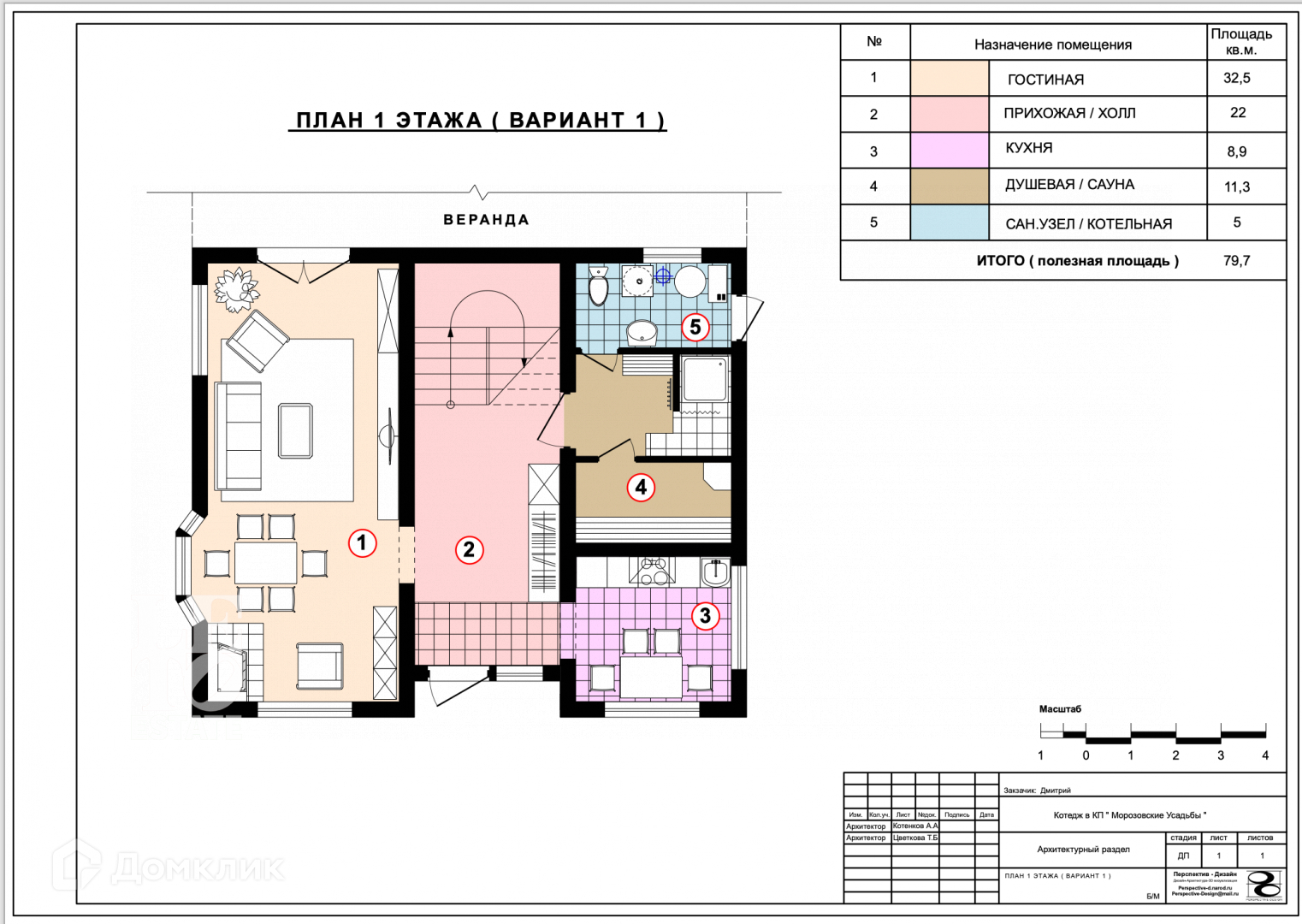 Первый этаж: прихожая, кухня, гостиная-каминная с выходом на веранду, санузел/котельная, душевая с сауной и купелью.