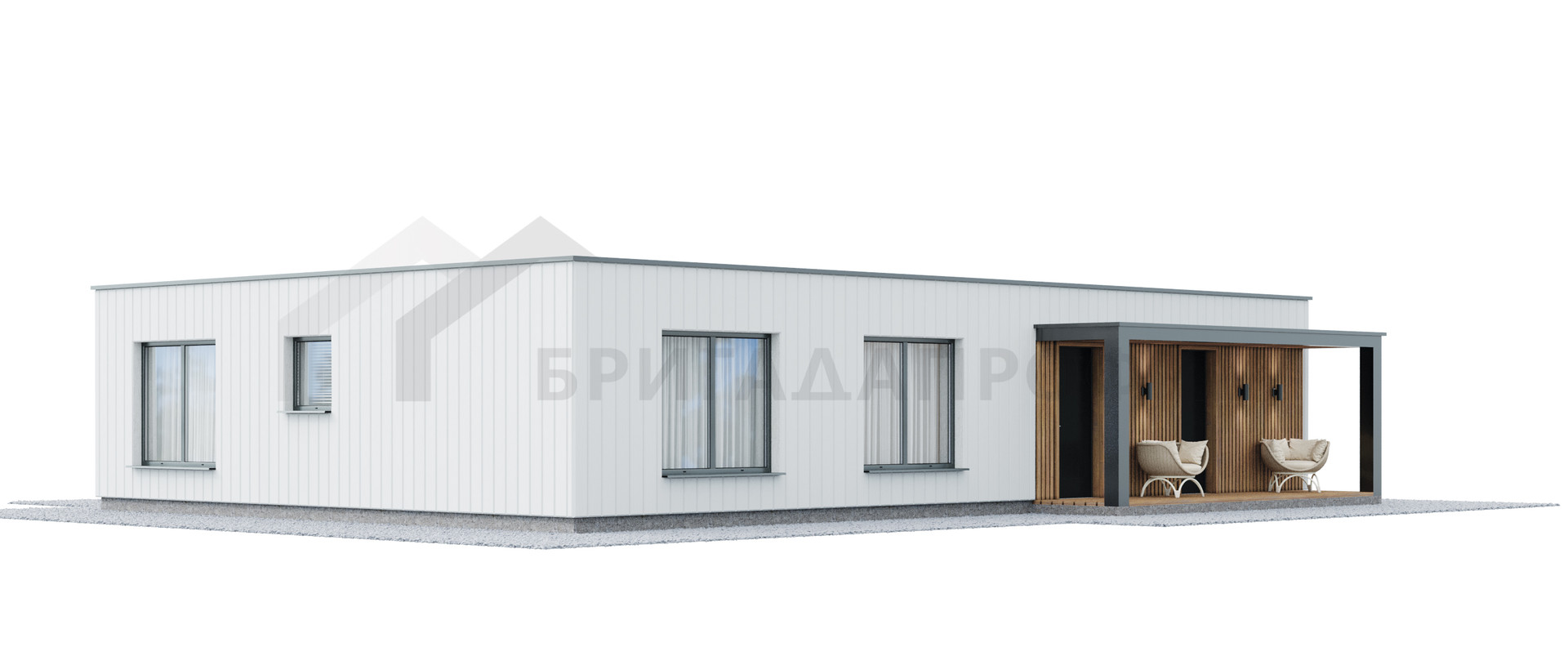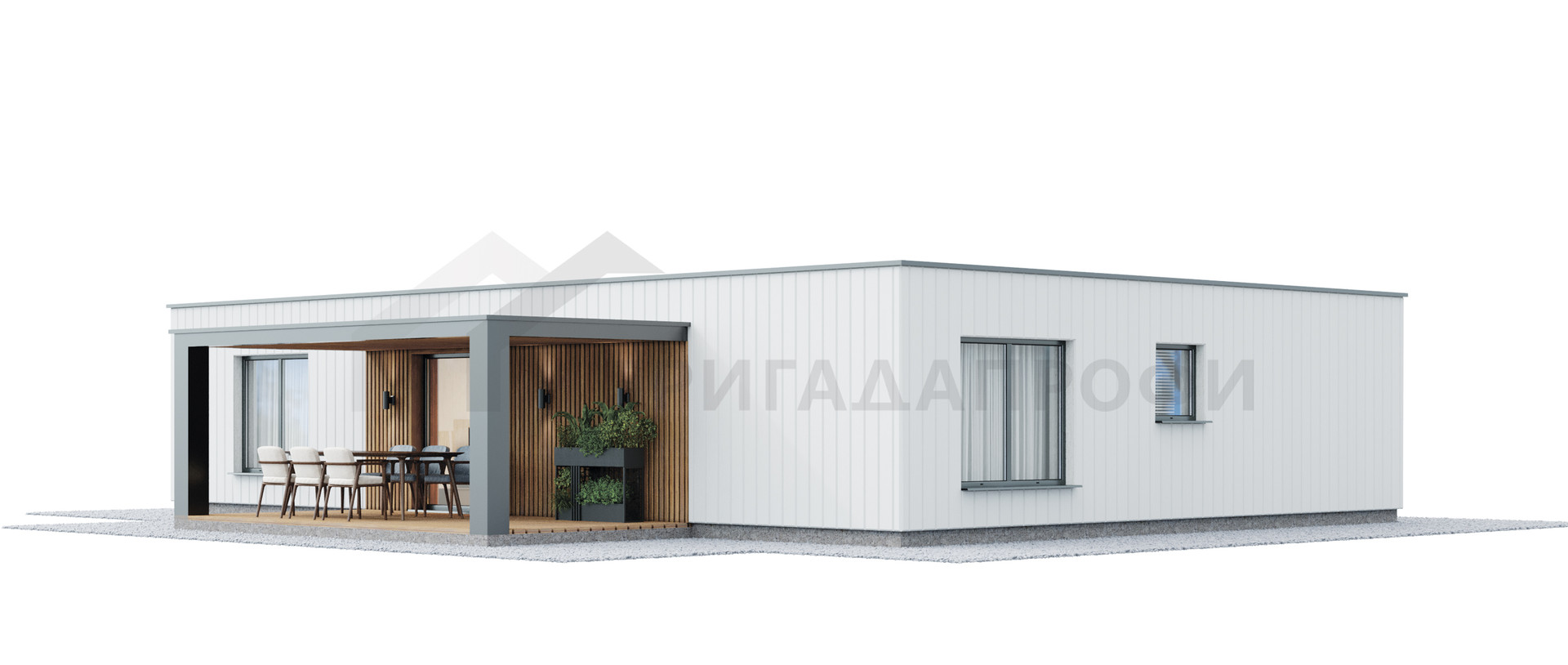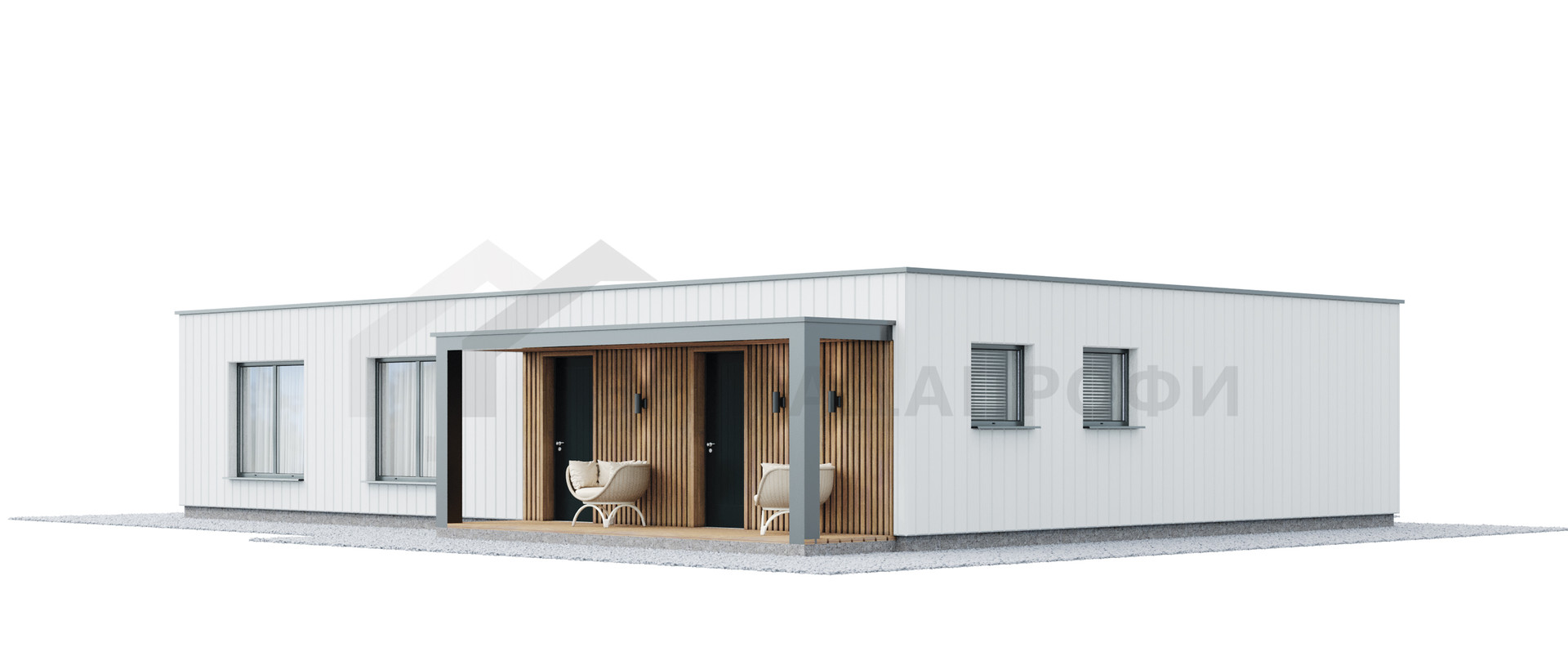 В стоимость входить работа и материалы для возведения фундамента (УШП) и теплого контура (теплый контур включает следующие обязательные элементы: стены (газобетон 400 мм.), перекрытия, утепленная кровля (плоская), окна (профиль Rehau 70 мм) и двери (Jeld-Wen или EDUX (Финляндия), вводы для коммуникаций.