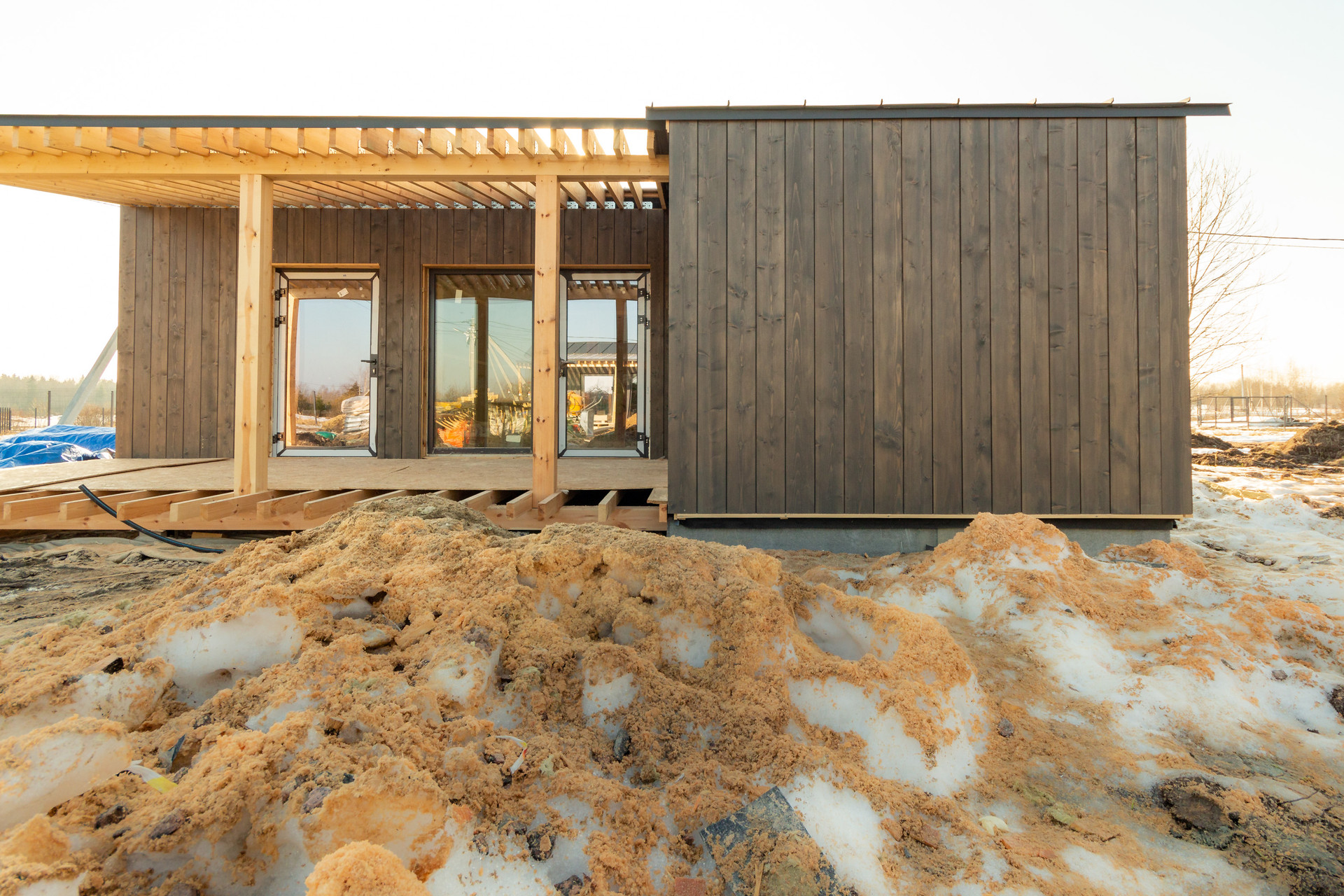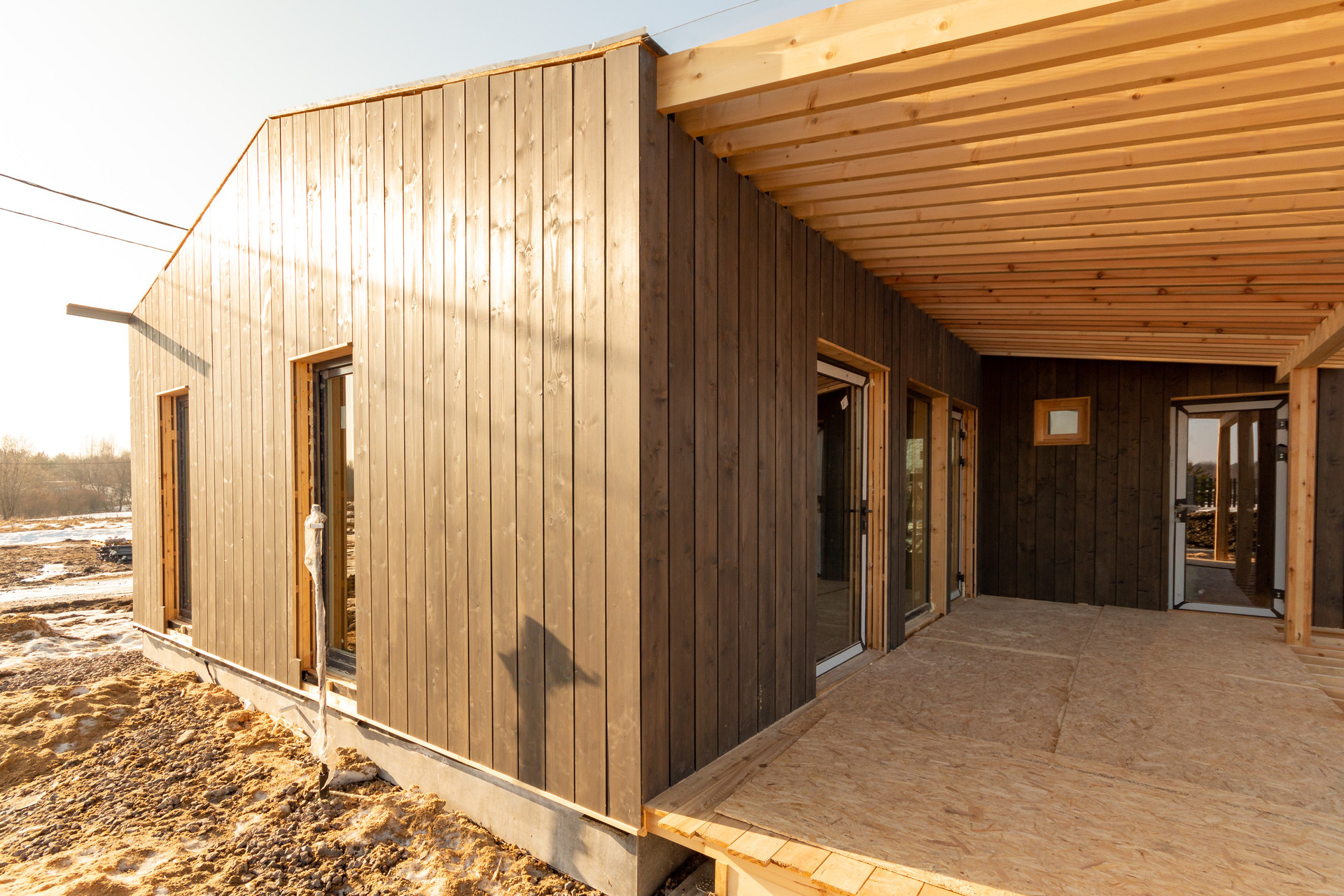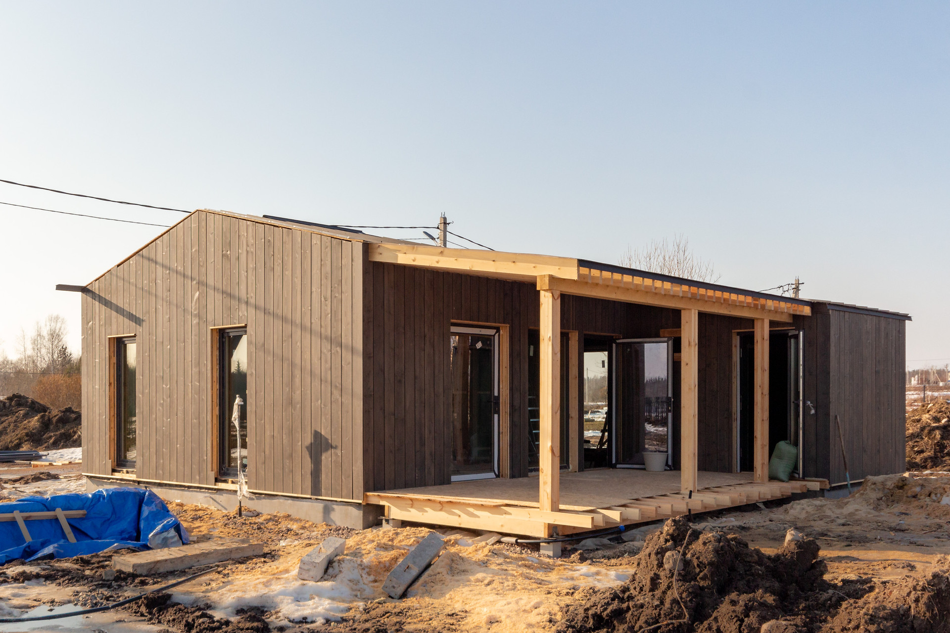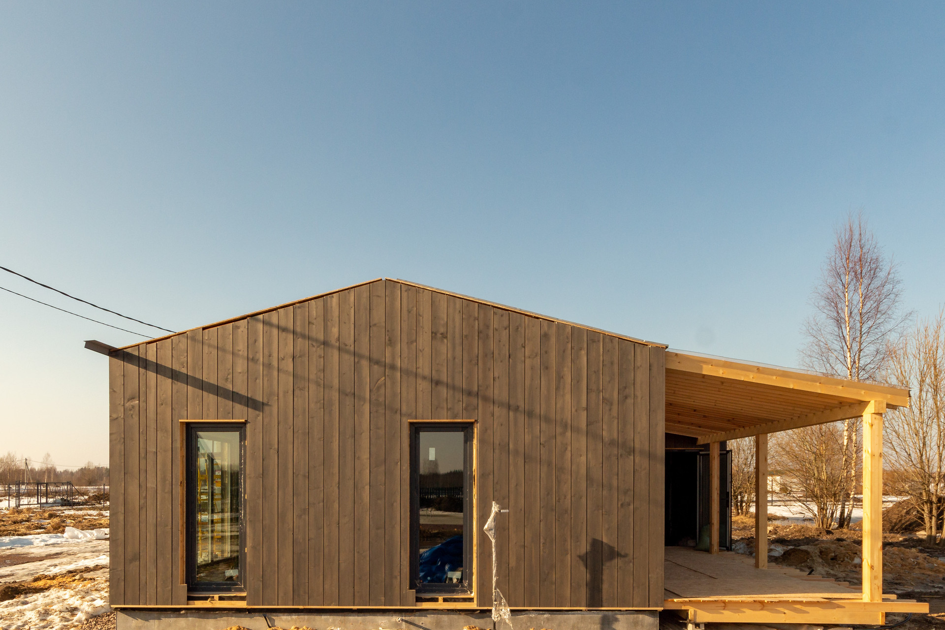 Текущее состояние: дом готов (фундамент, дренаж, септик, газгольдер, стены, кровля, окна, двери, утепление)