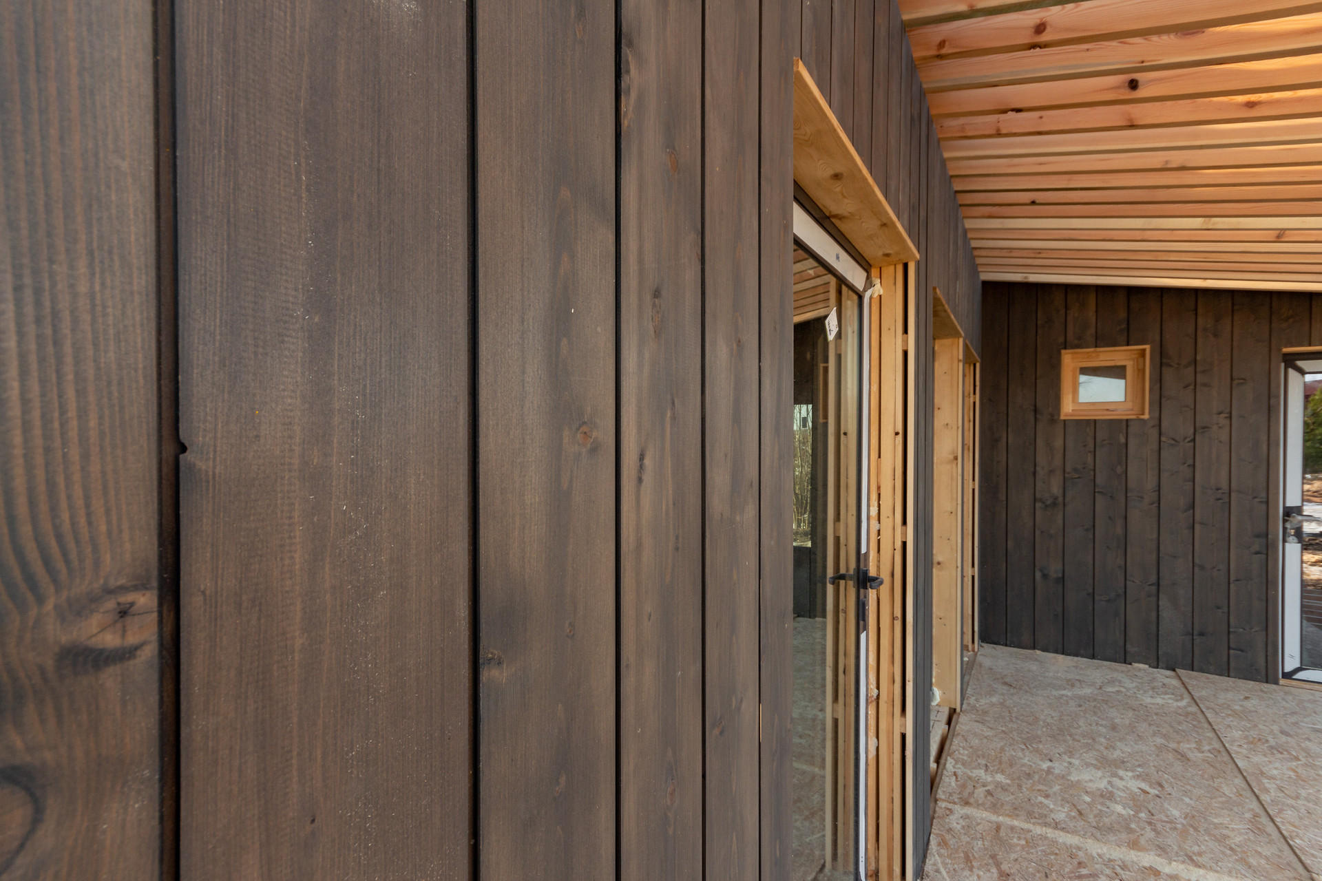 Нет ни наличников, ни накладок. На углах дома фасадная доска состыкована без каких-либо соединителей.