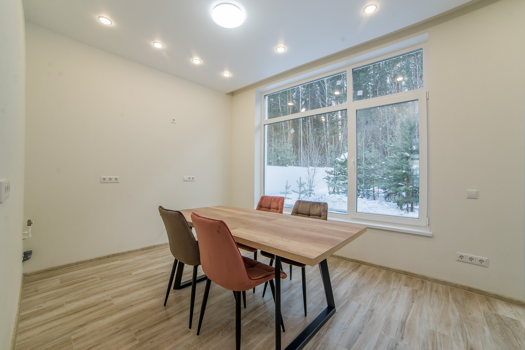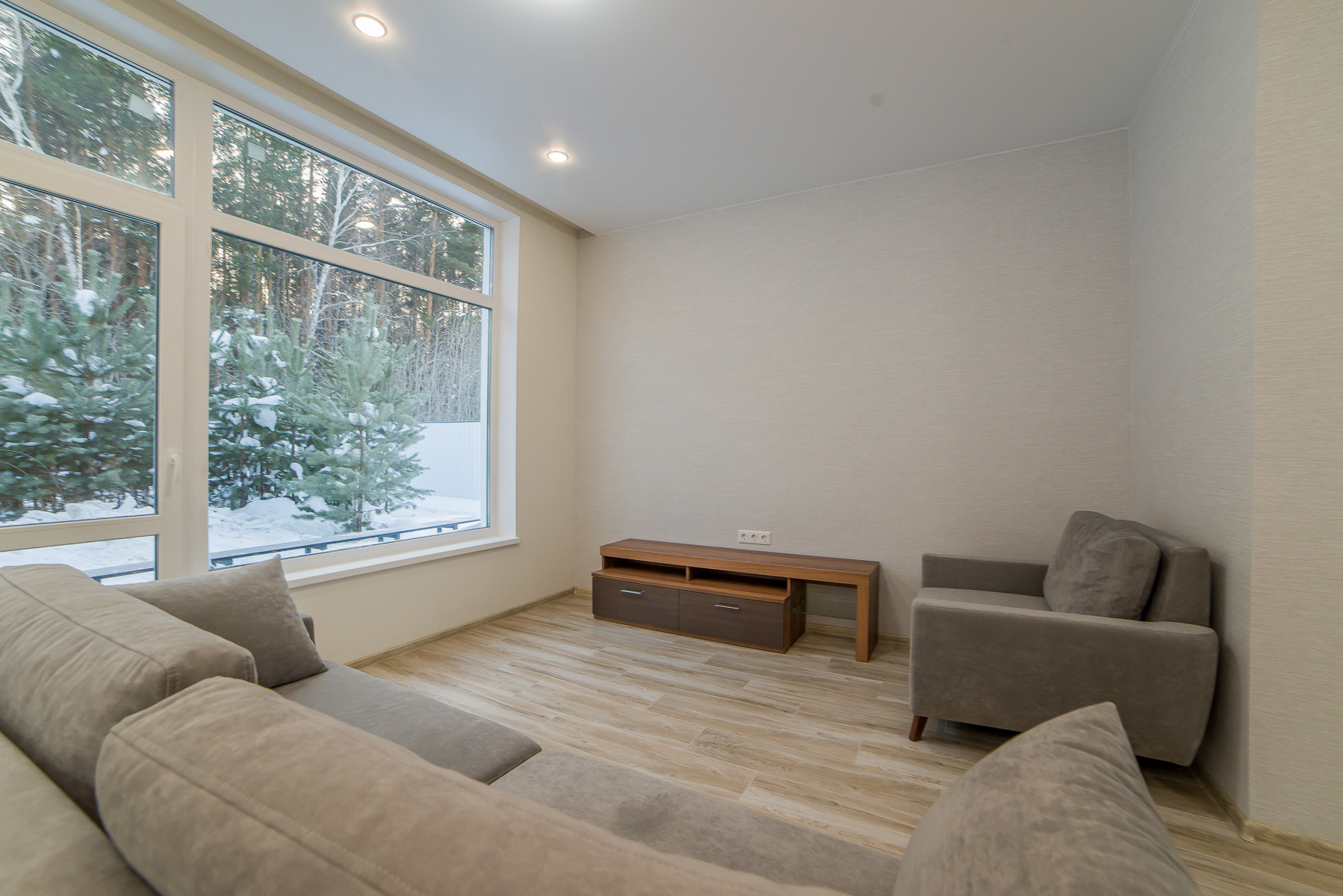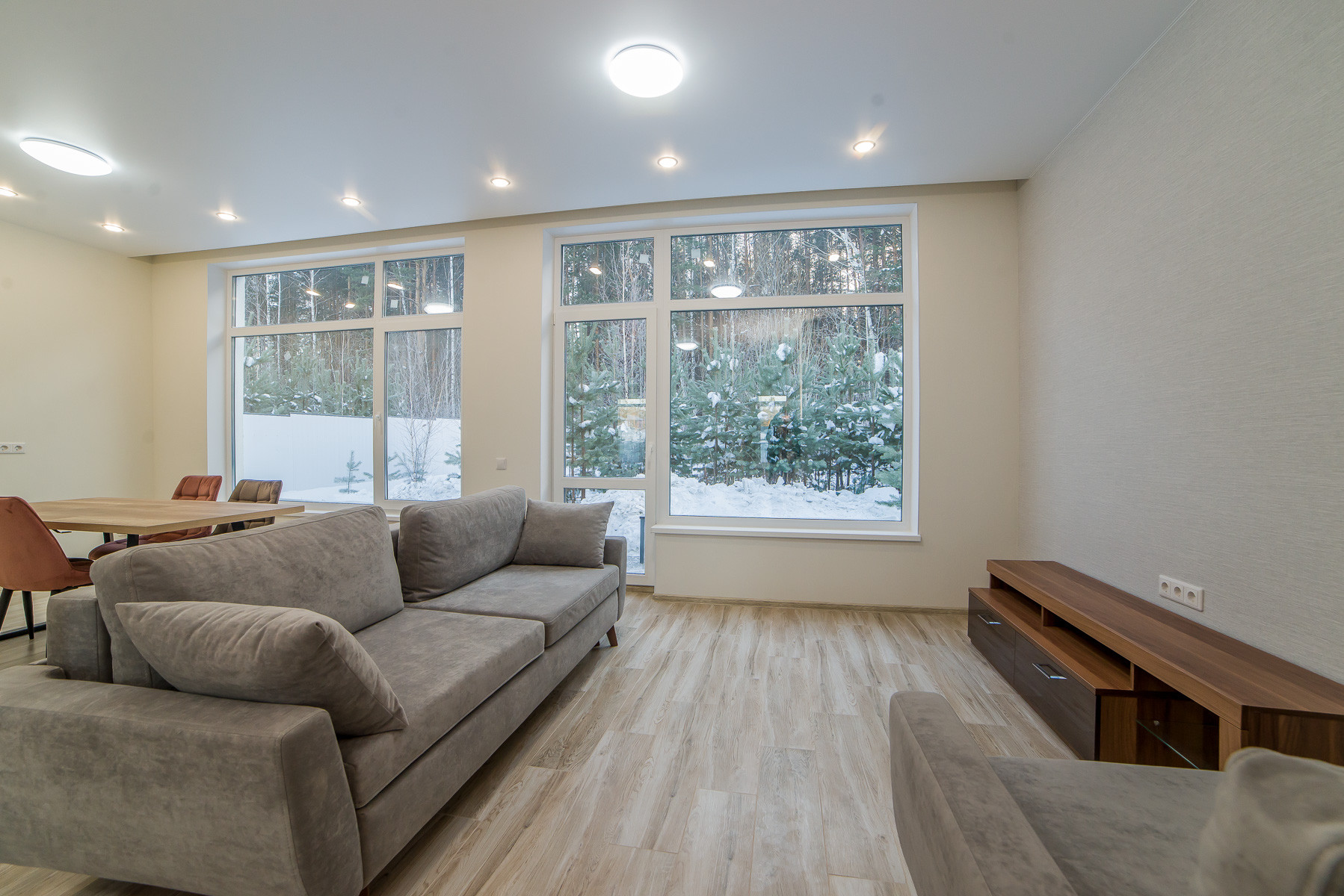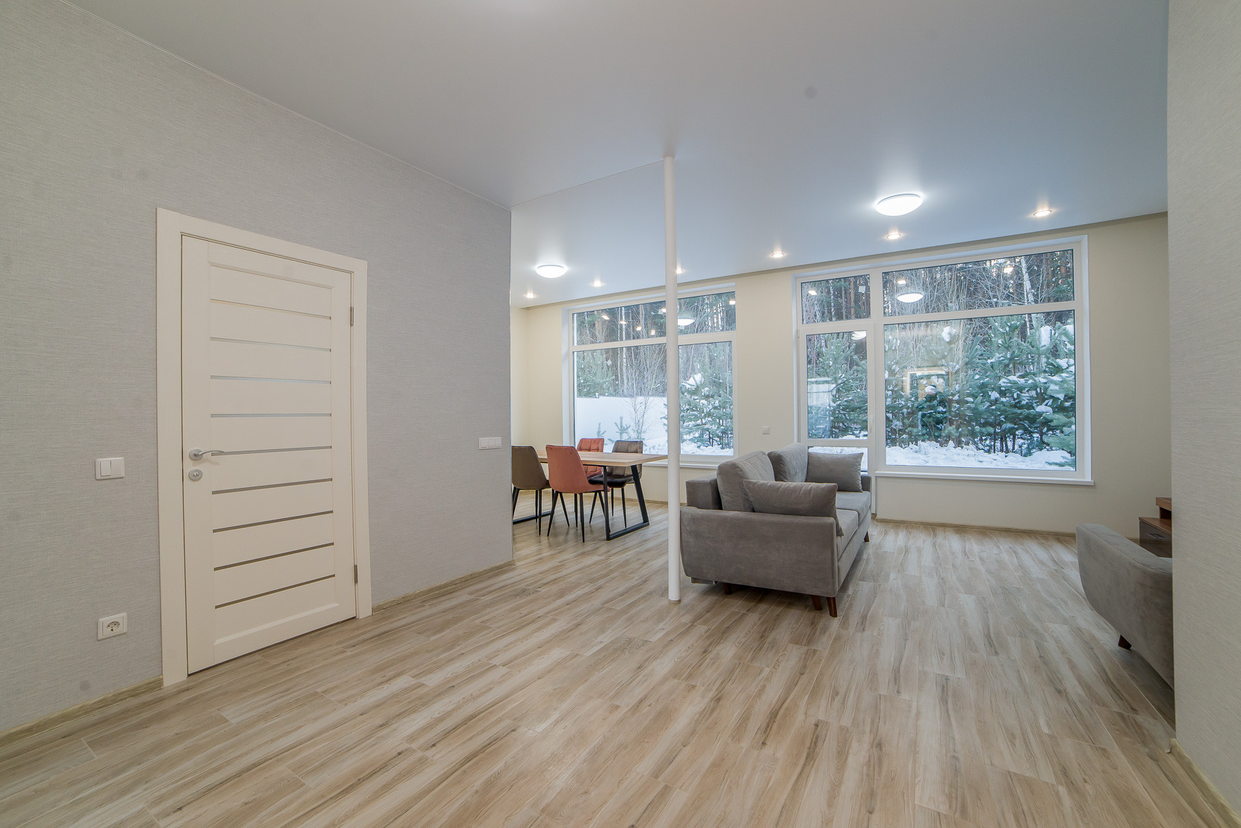 Просторная гостиная-кухня, санузел, холл, терраса с выходом в лес, две спальни