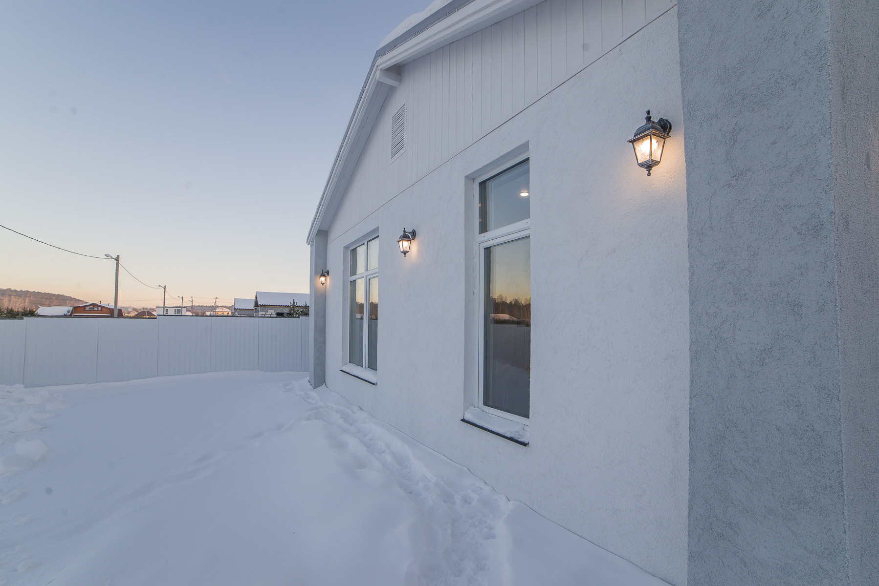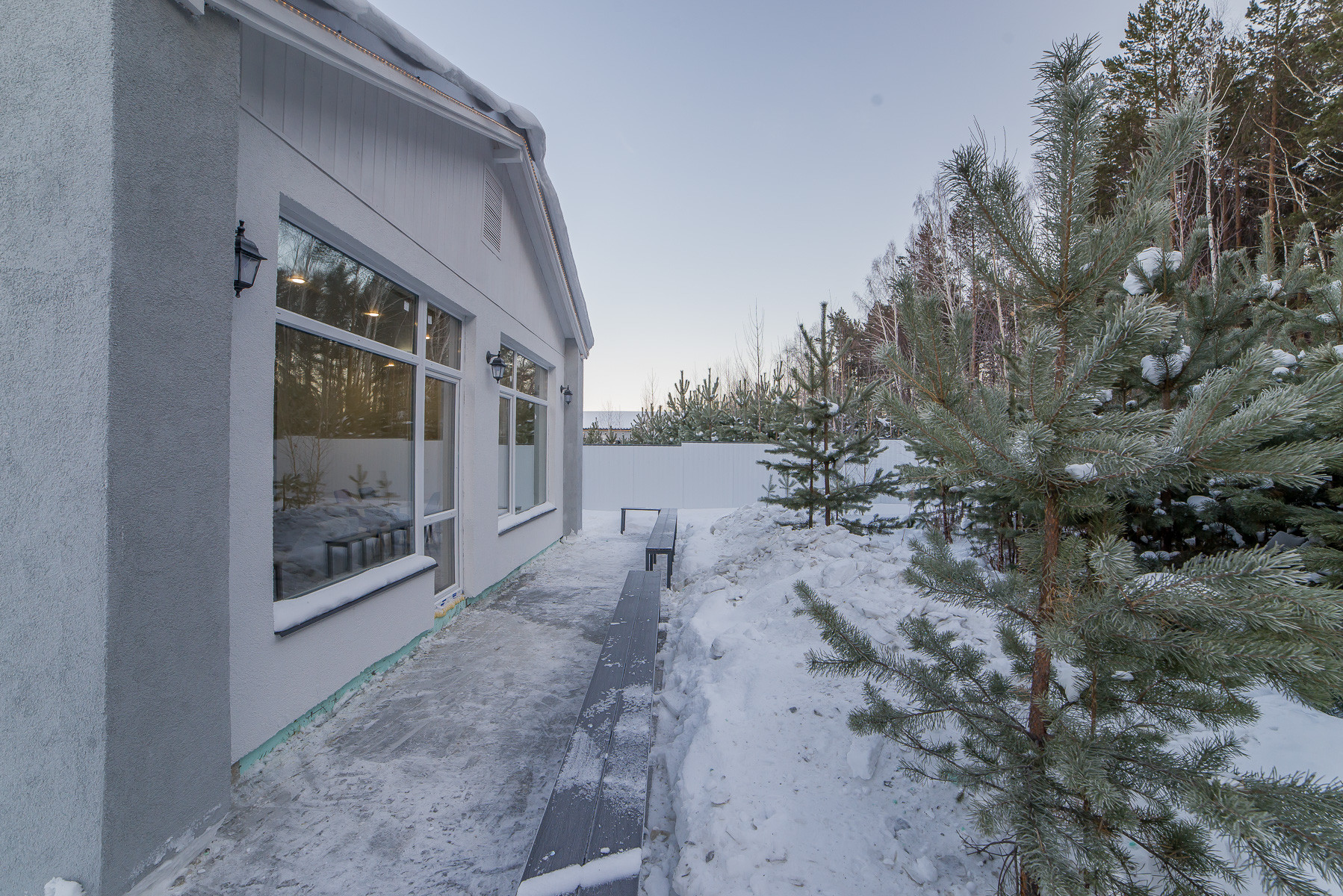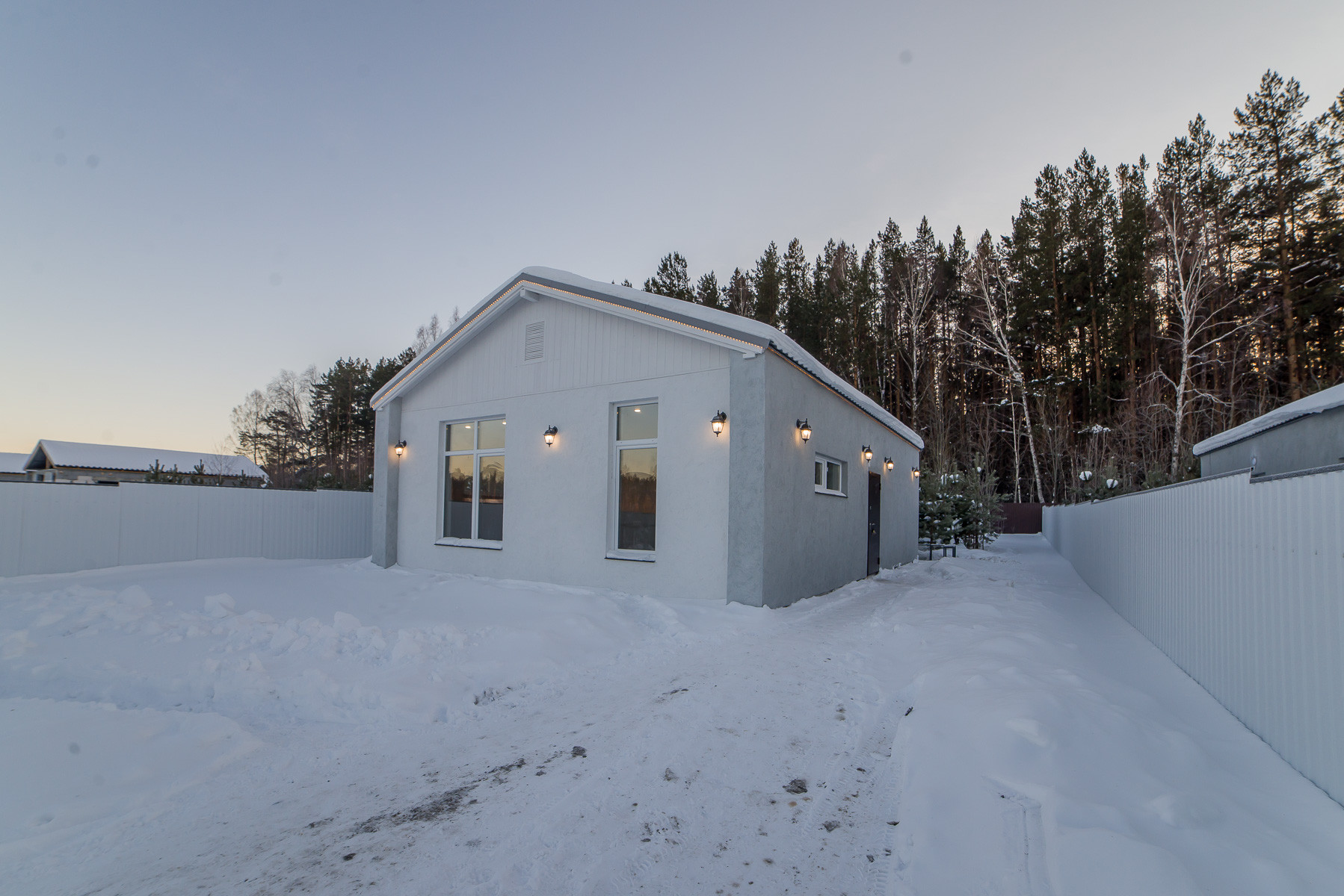 Участок огорожен забором из белого профлиста
